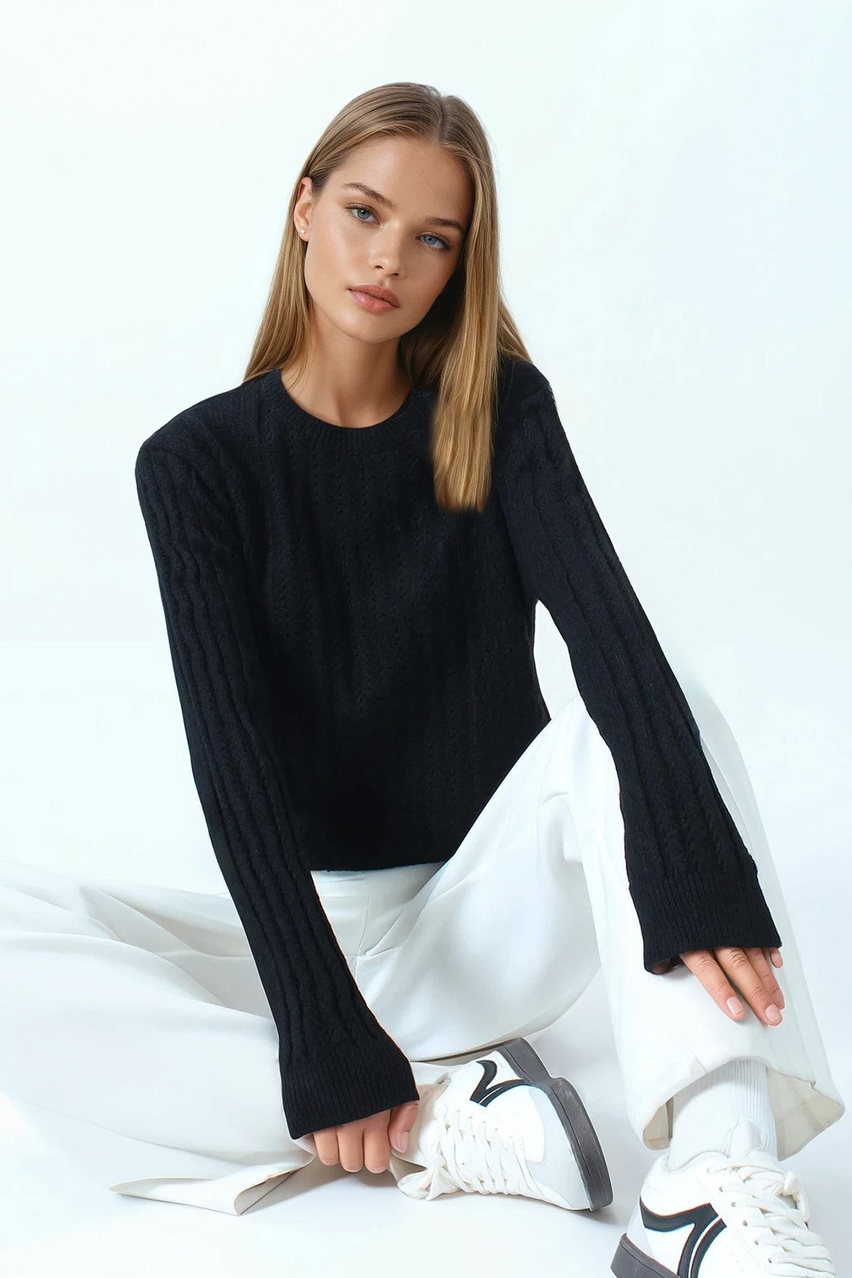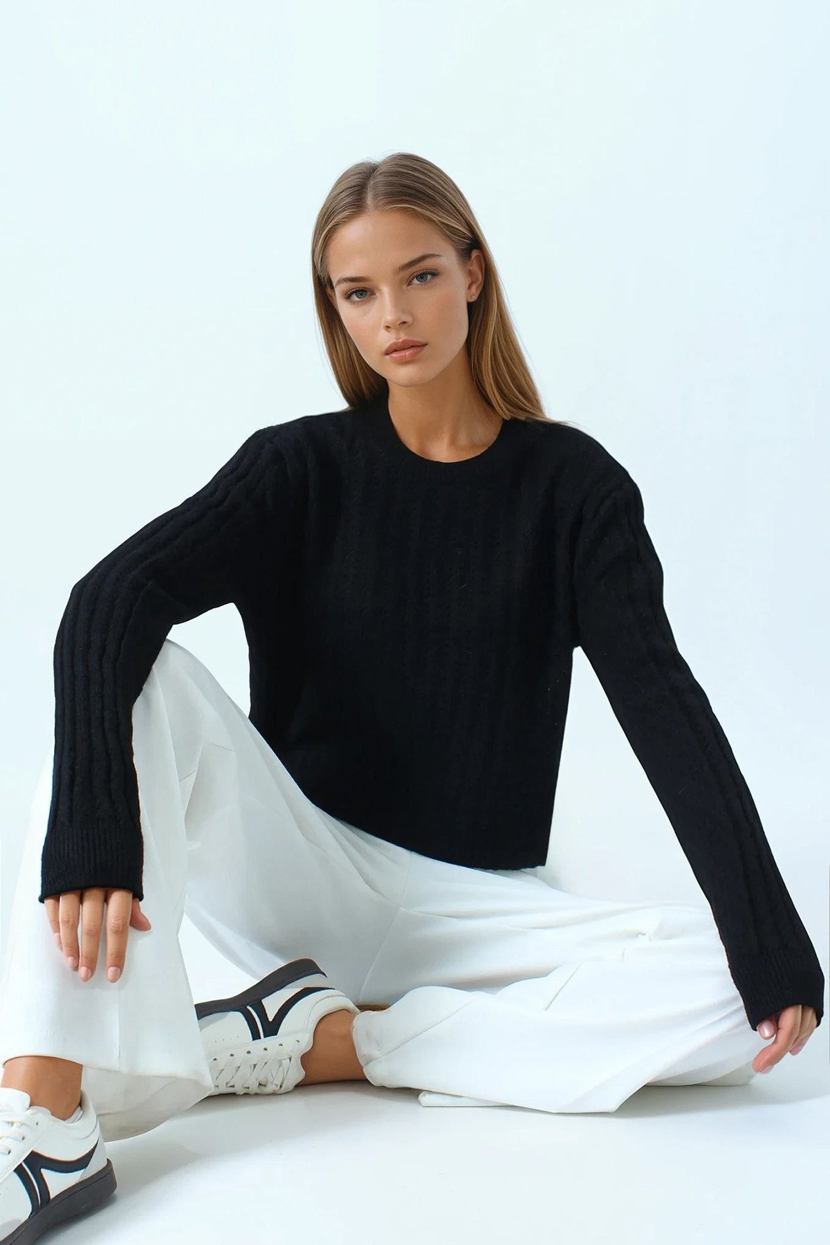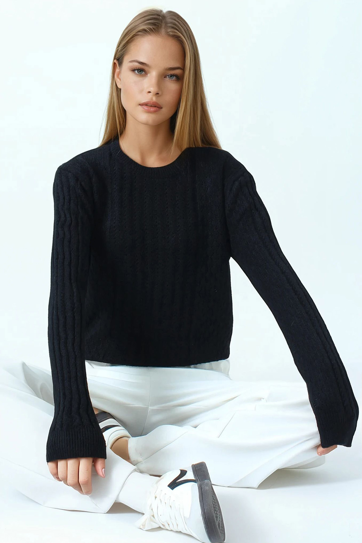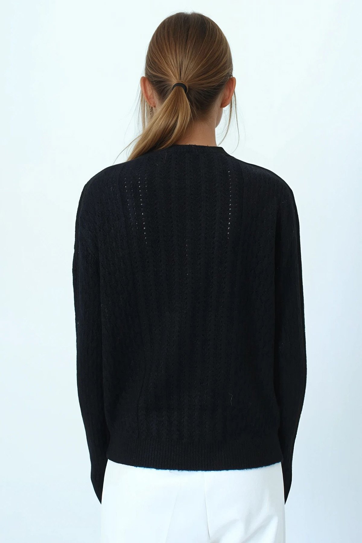 Ajur Desenli Ribanalı Triko Kazak - SİYAH (VS01044)