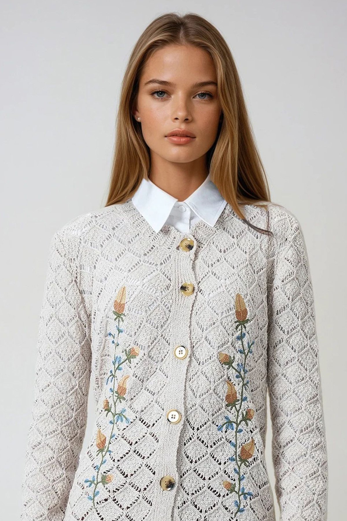 Kadın Bej Ajurlu Çiçek Nakışlı Düğmeli Triko Hırka VS00860 (VS00860)