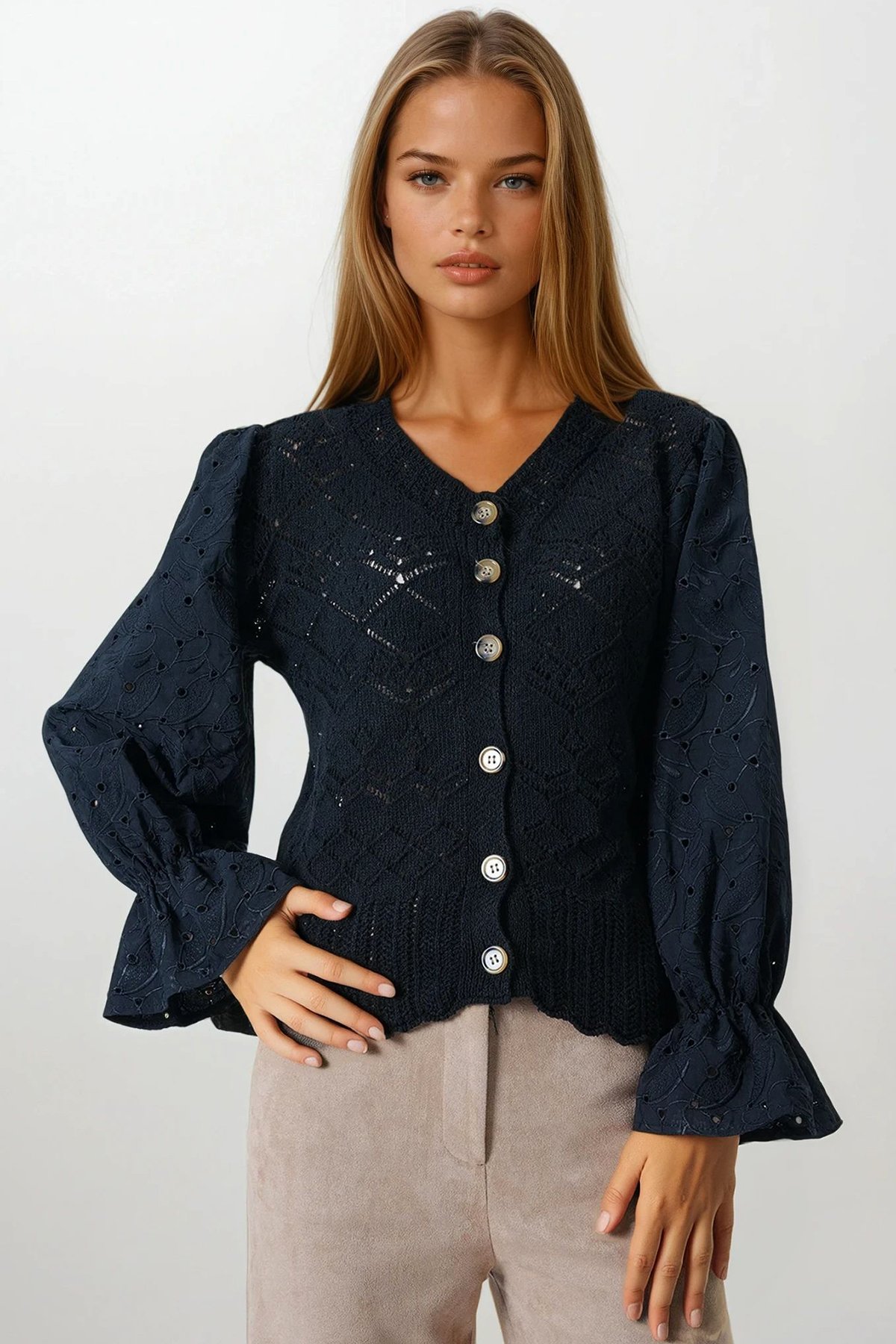 Kadın Bej Ajurlu Triko Brode Kol Düğmeli Hırka VS00859 Kadın Siyah Ajurlu Triko Brode Kol Düğmeli Hırka VS00859