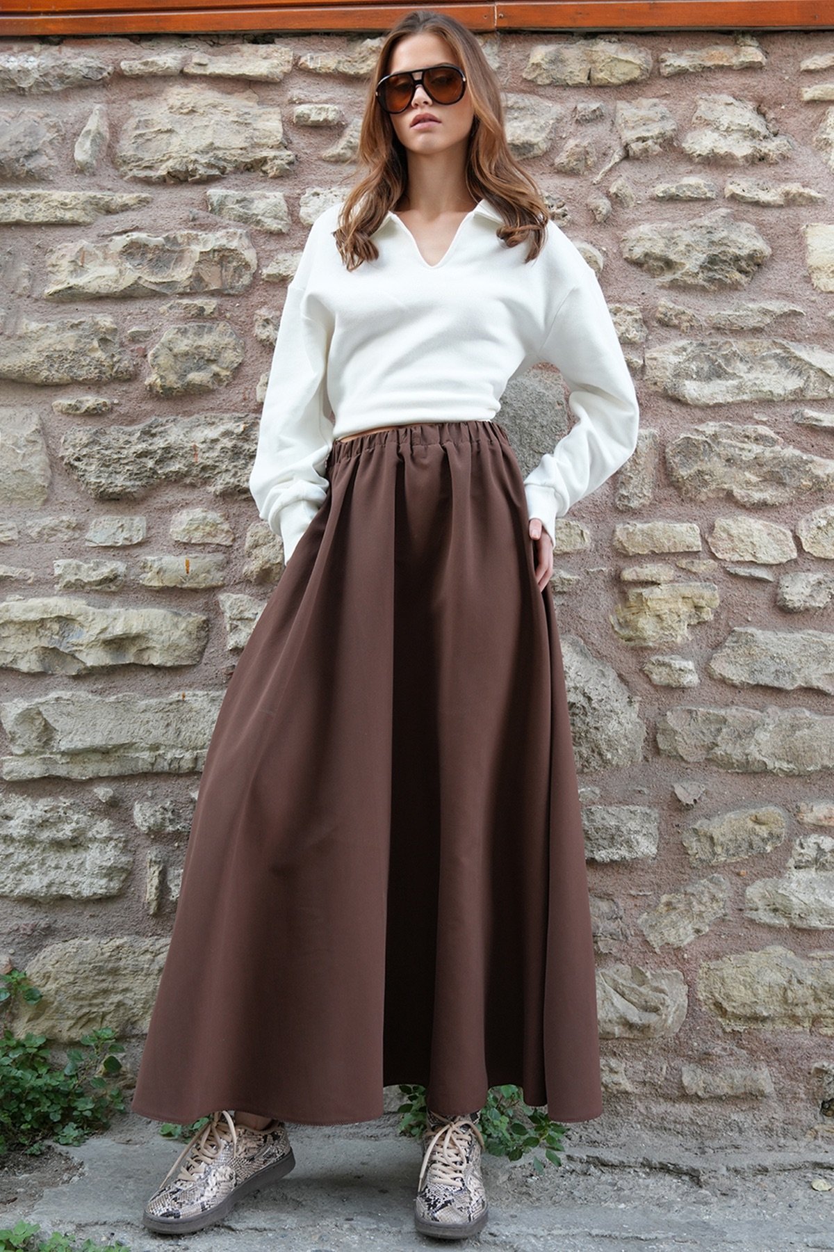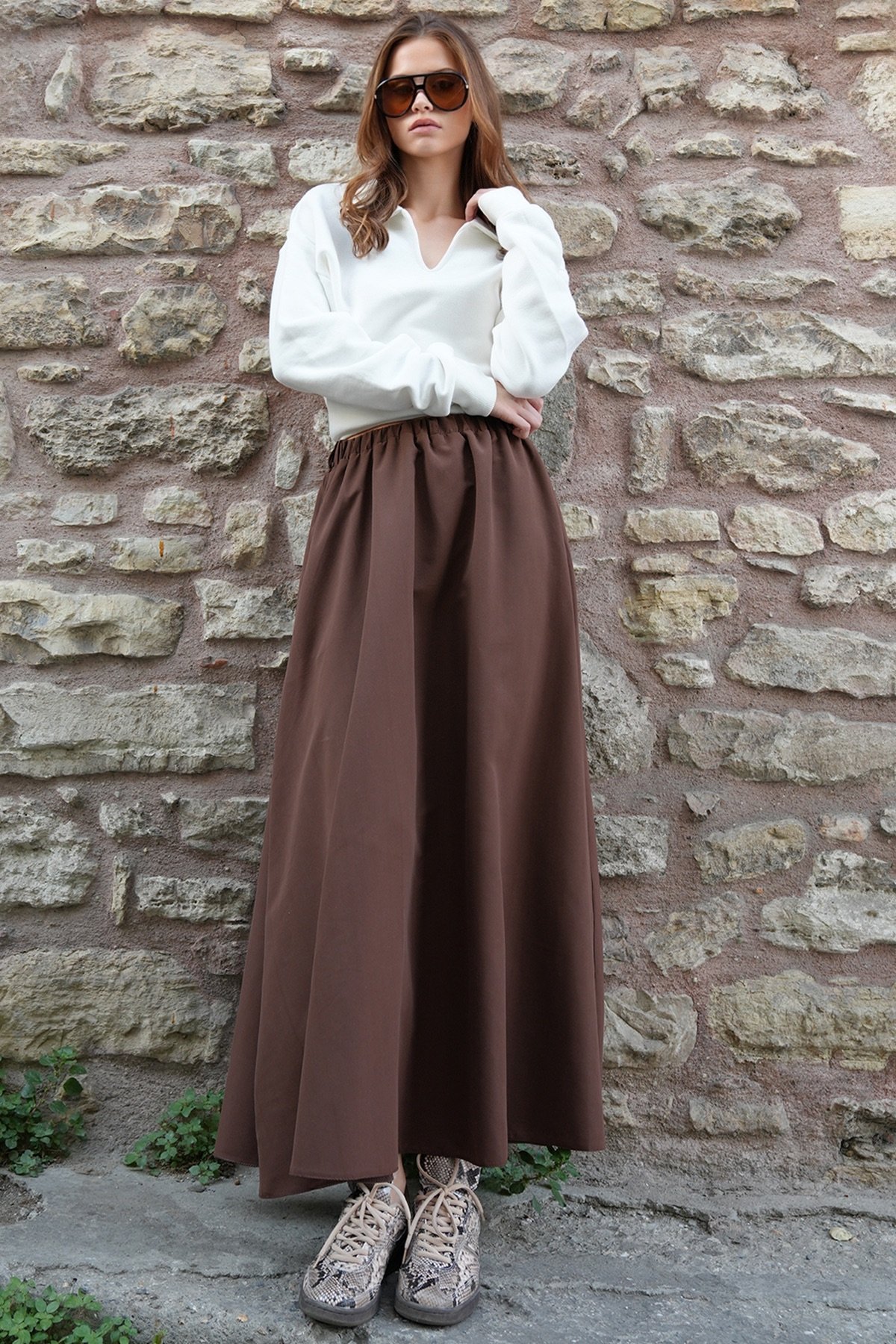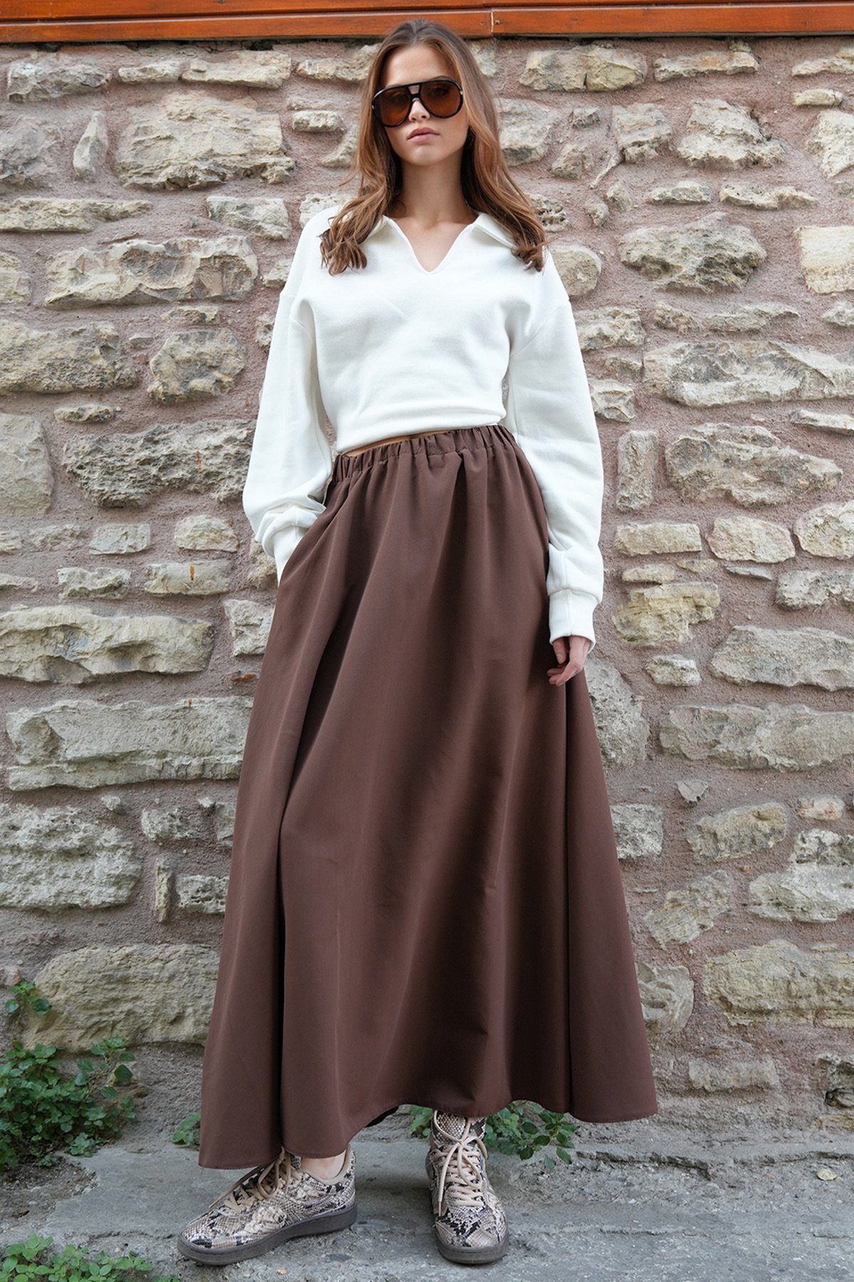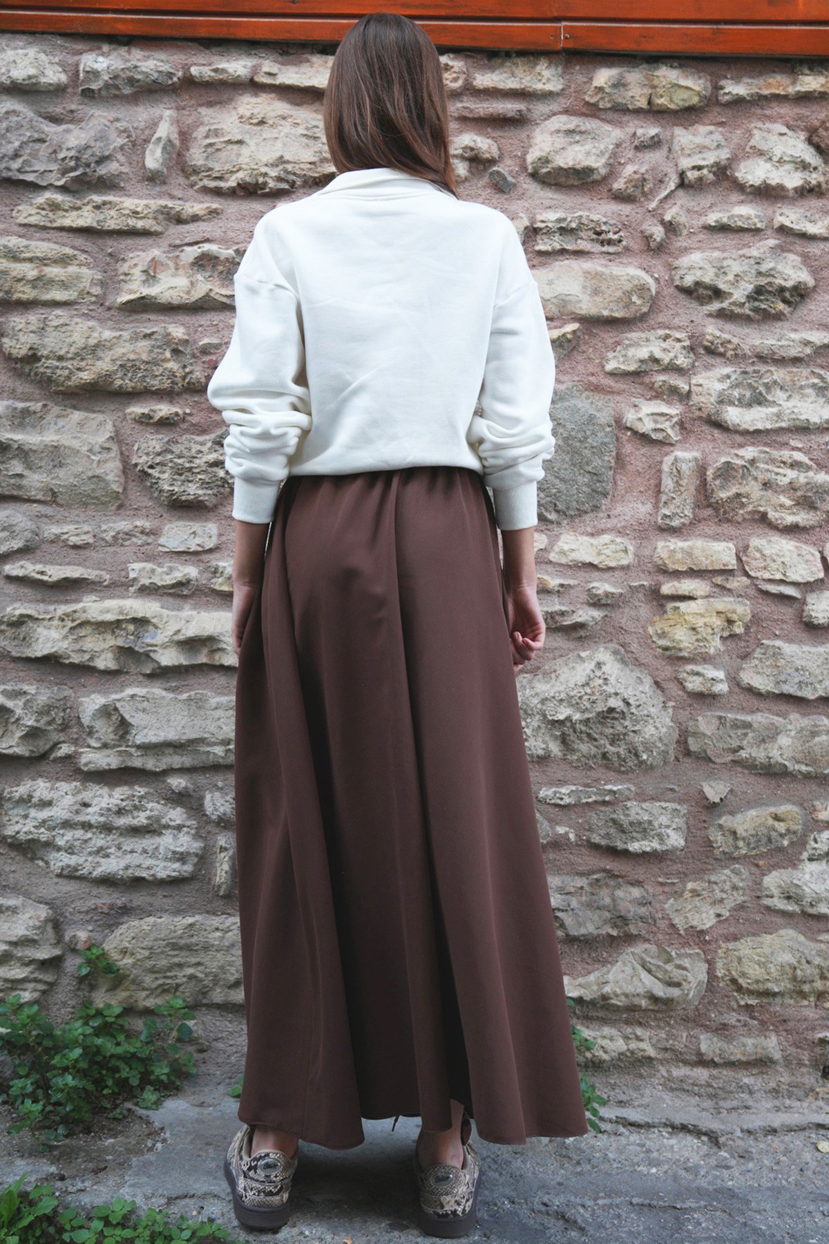 Beli Lastikli Kemer Detaylı Çift Cepli Midi Boy Etek - KAHVERENGİ (VS01210)