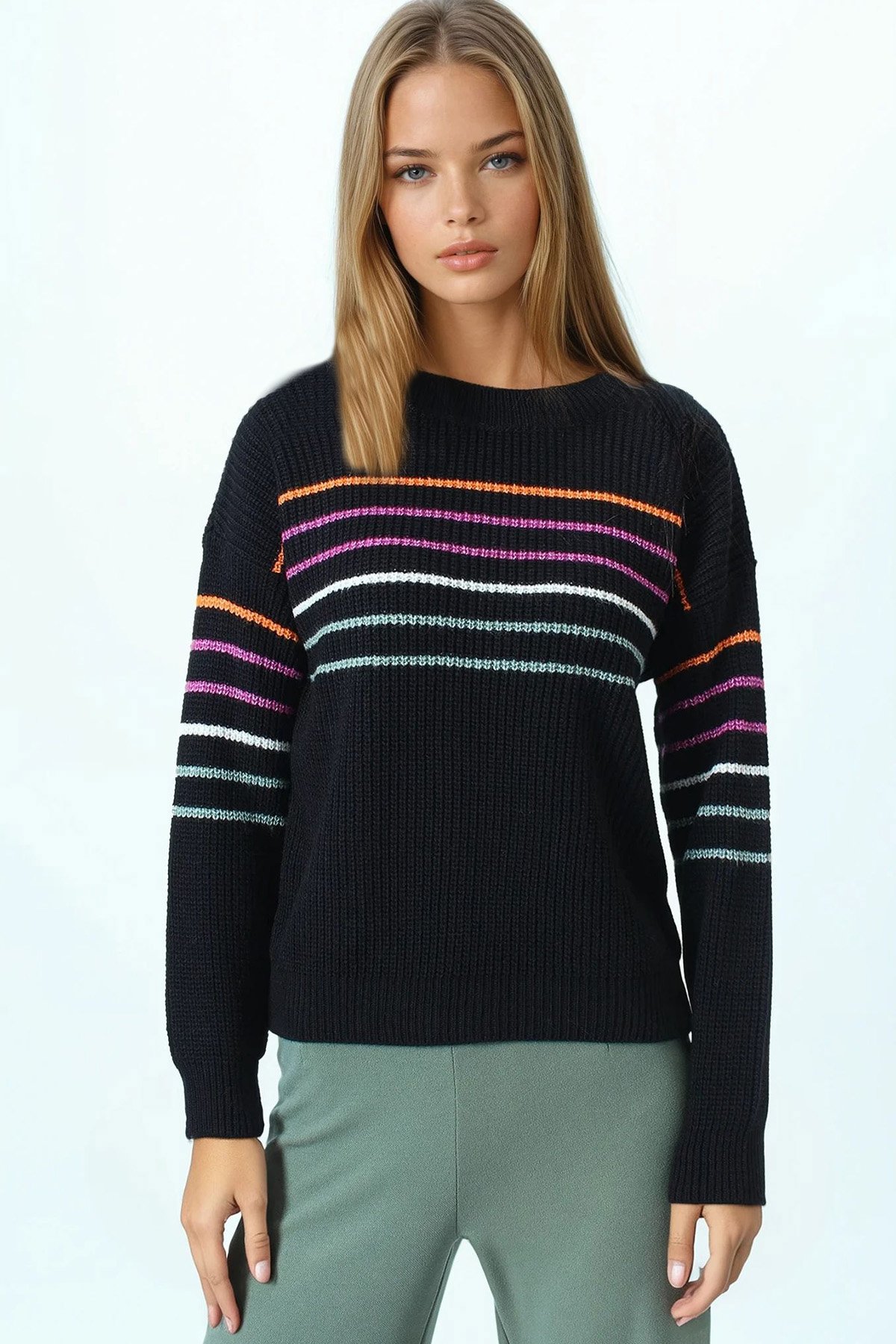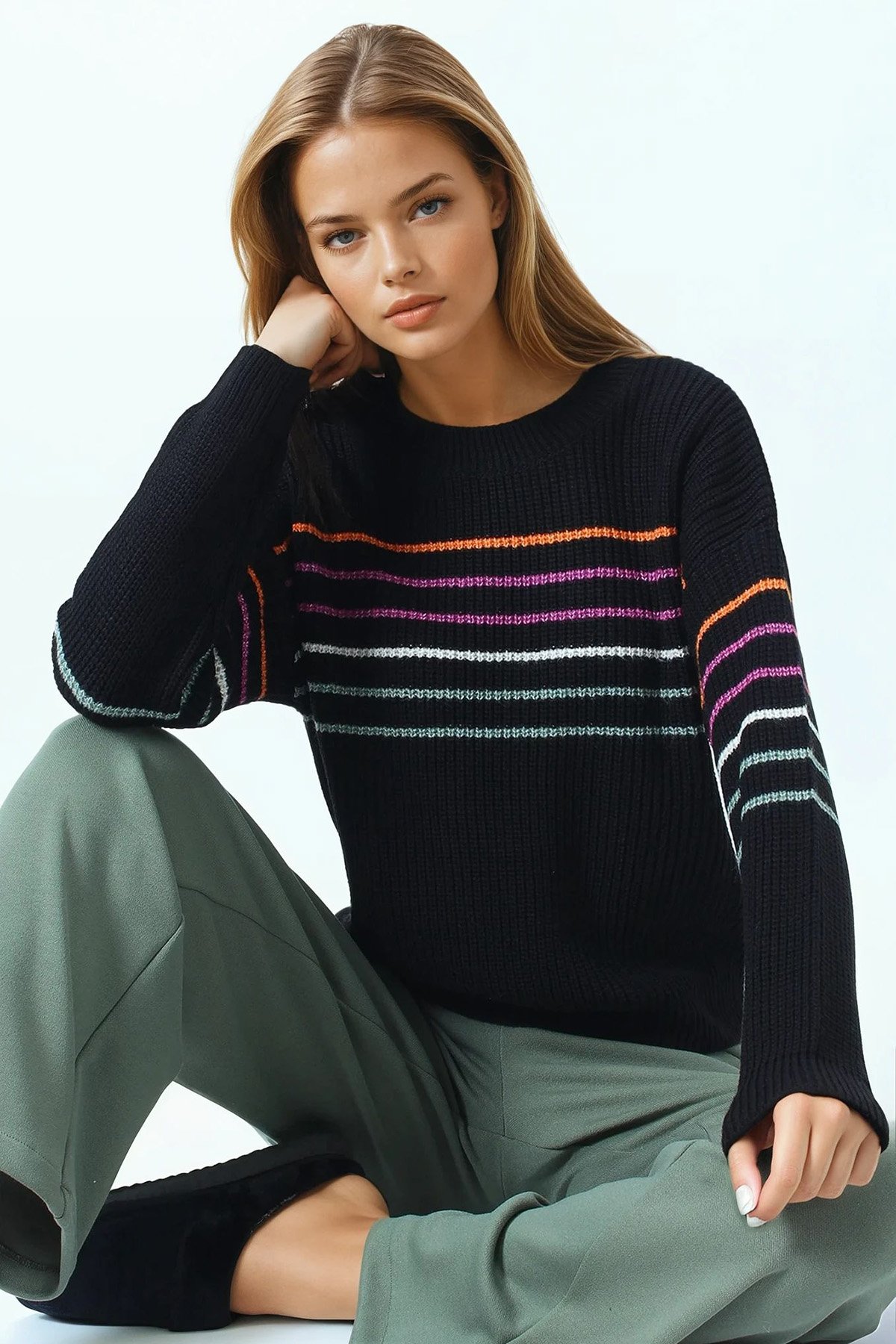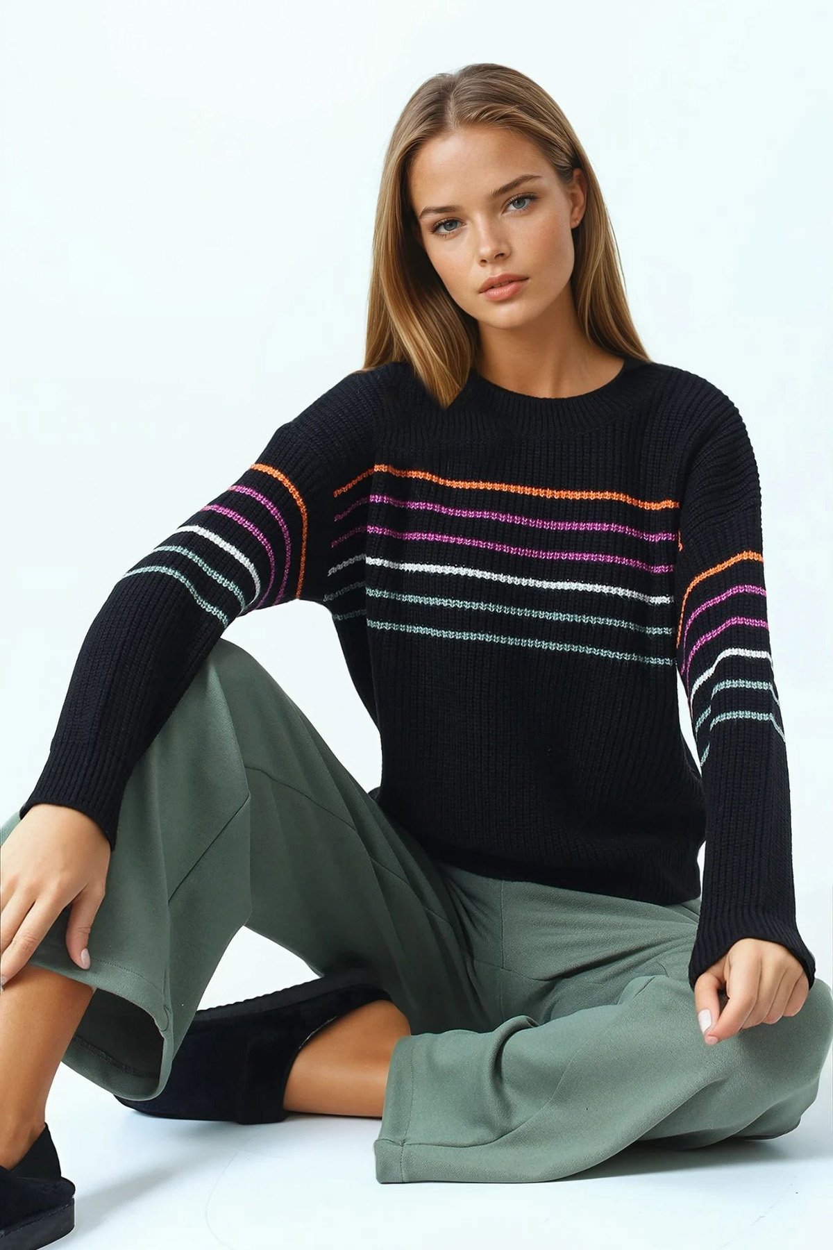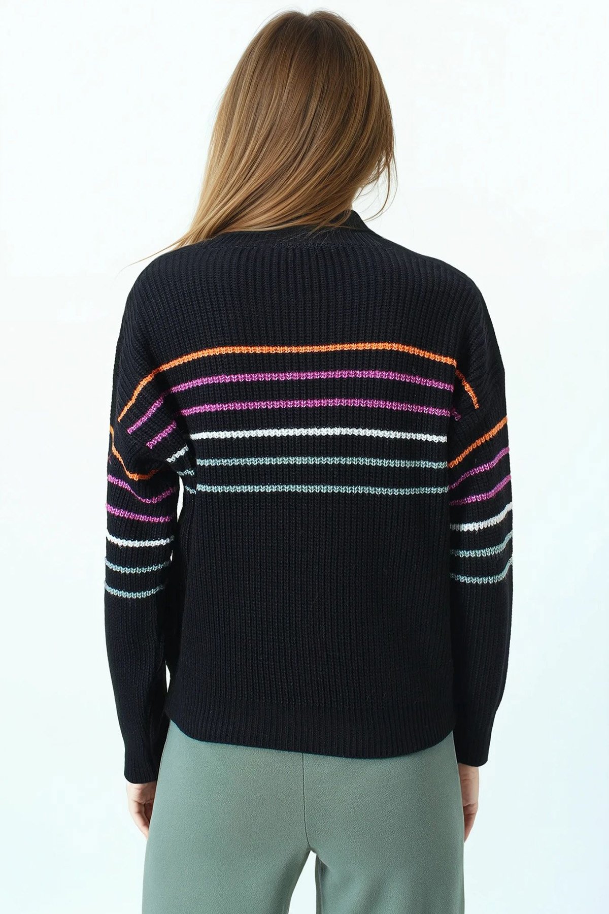 Bisiklet Yaka Çizgili Triko Kazak - SİYAH (VS01042)