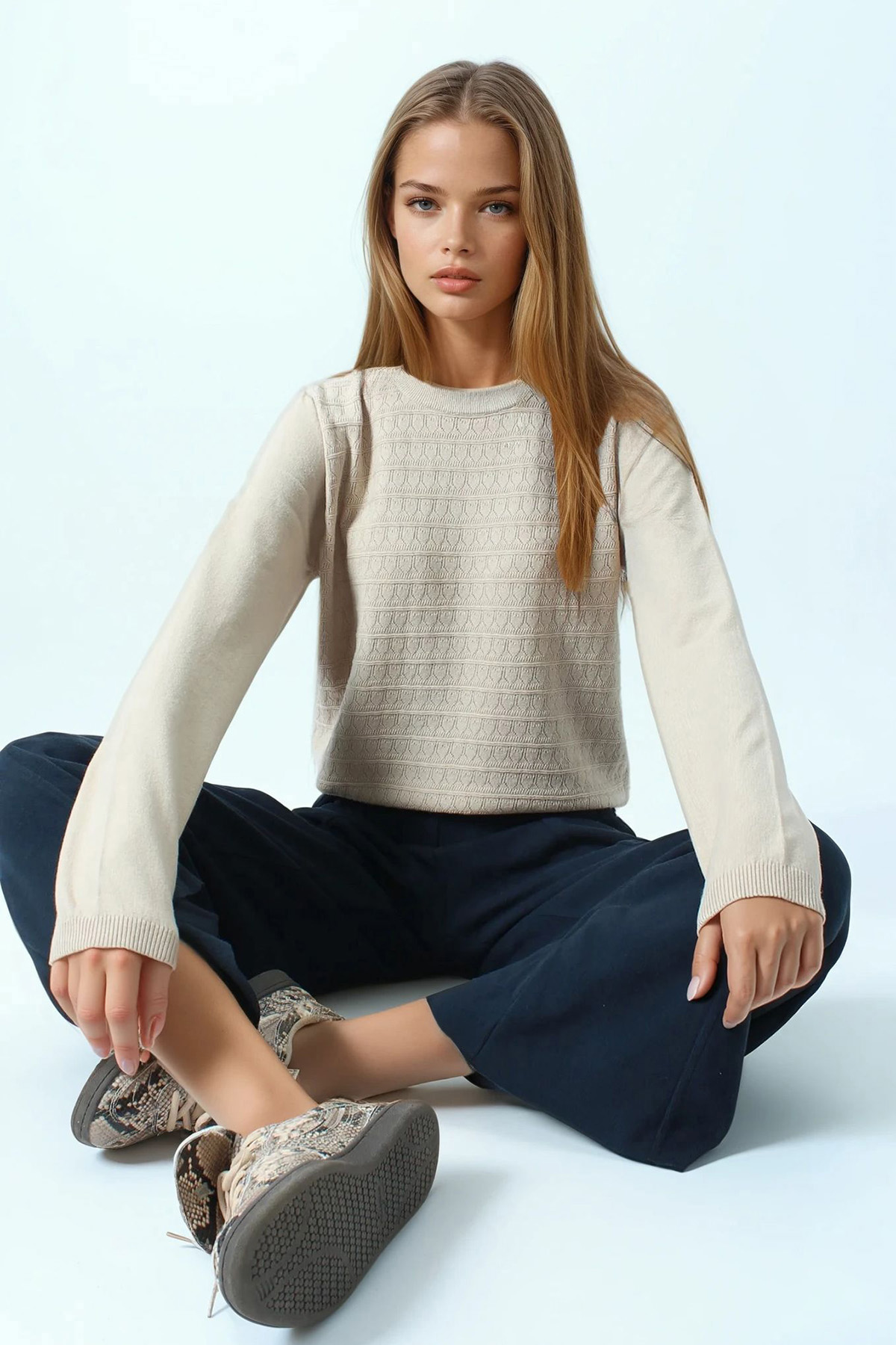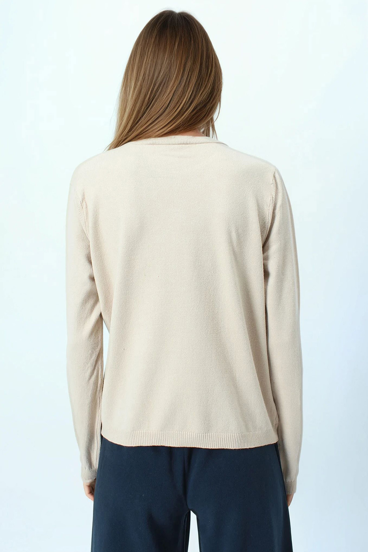Bisiklet Yaka Dokulu Örgü Desenli Uzun Kollu Triko Bluz - BEJ (VS01061)