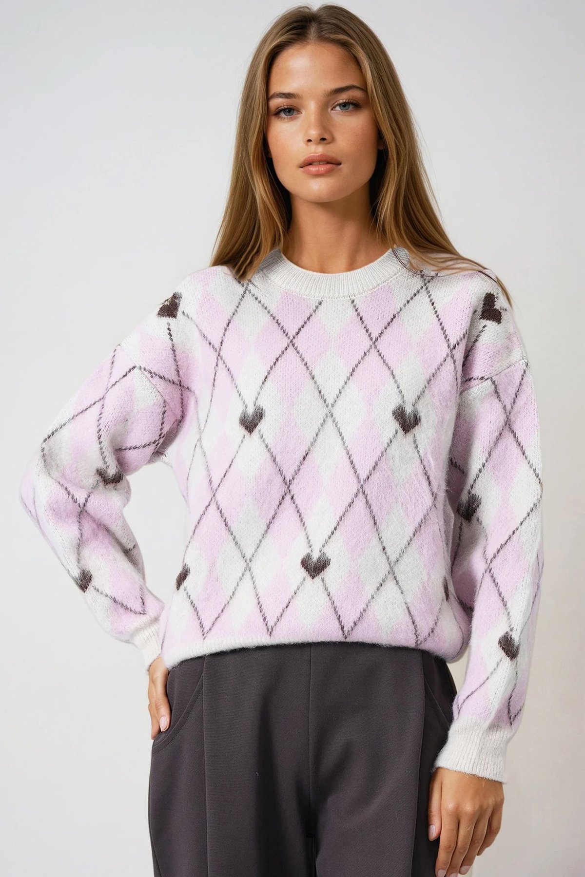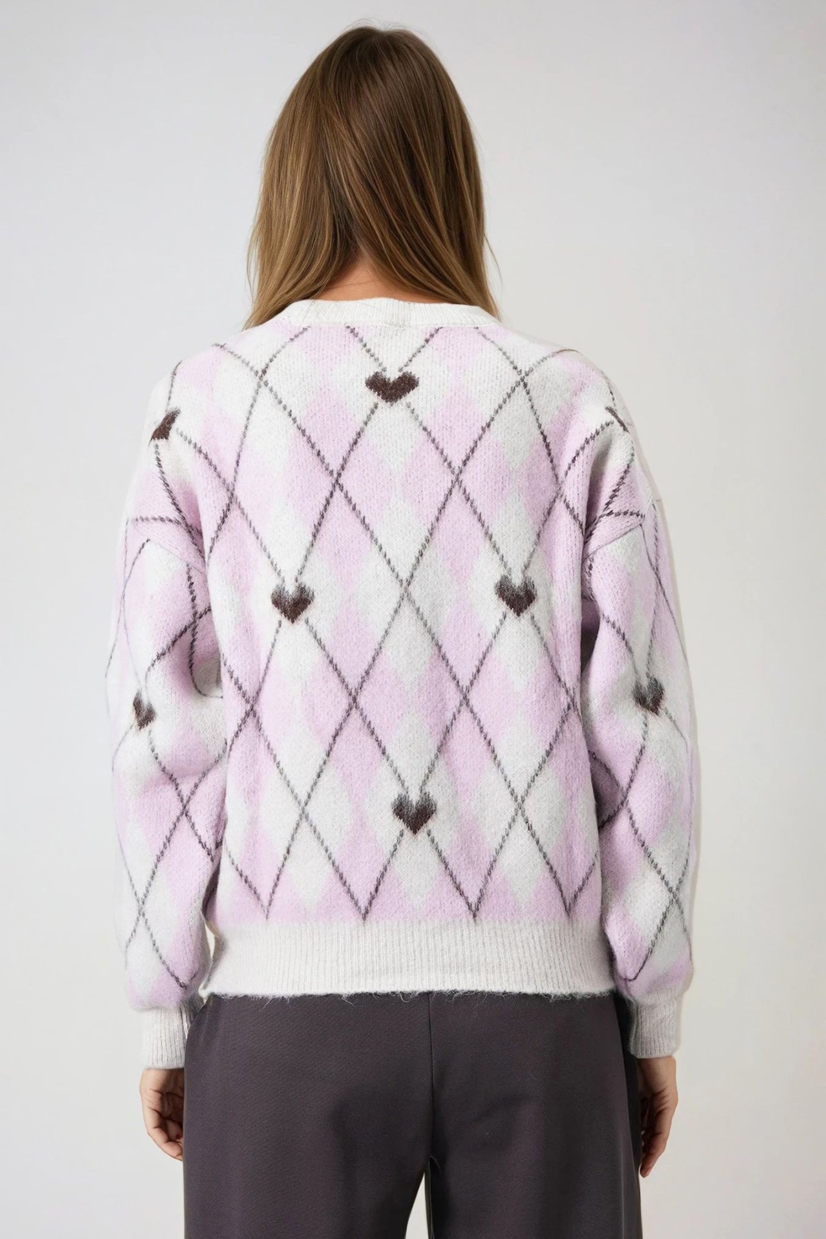 Bisiklet Yaka Kalp ve Bakalava Desenli Yumoş Kazak - PEMBE (VS01008)