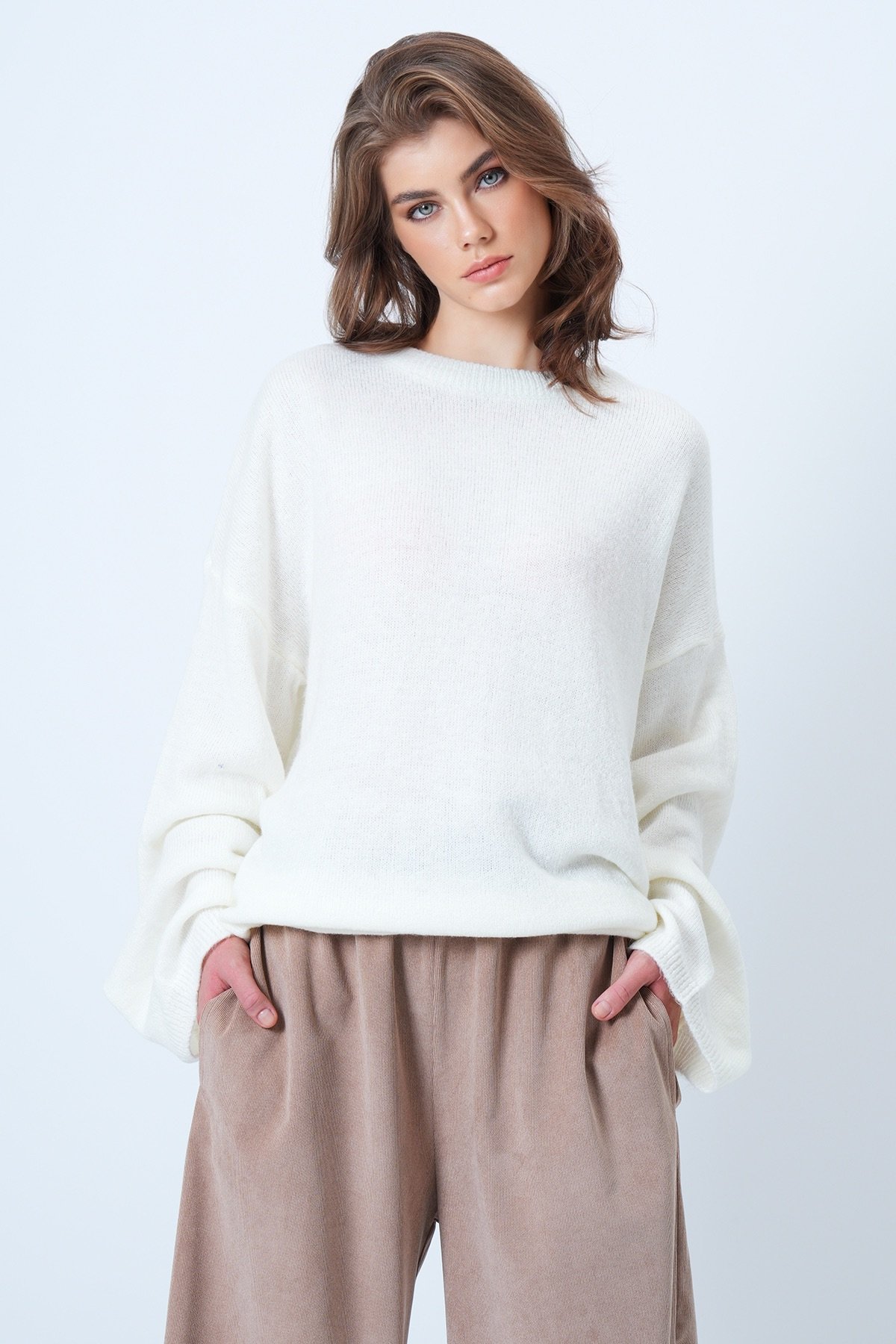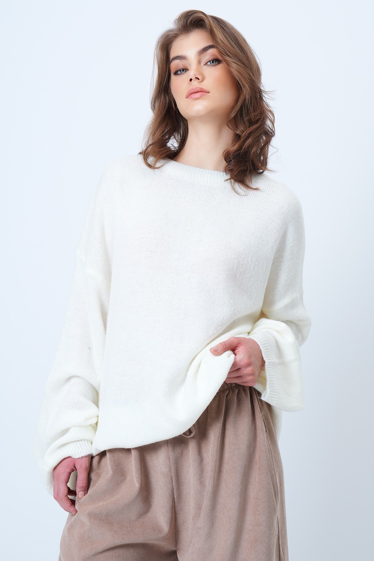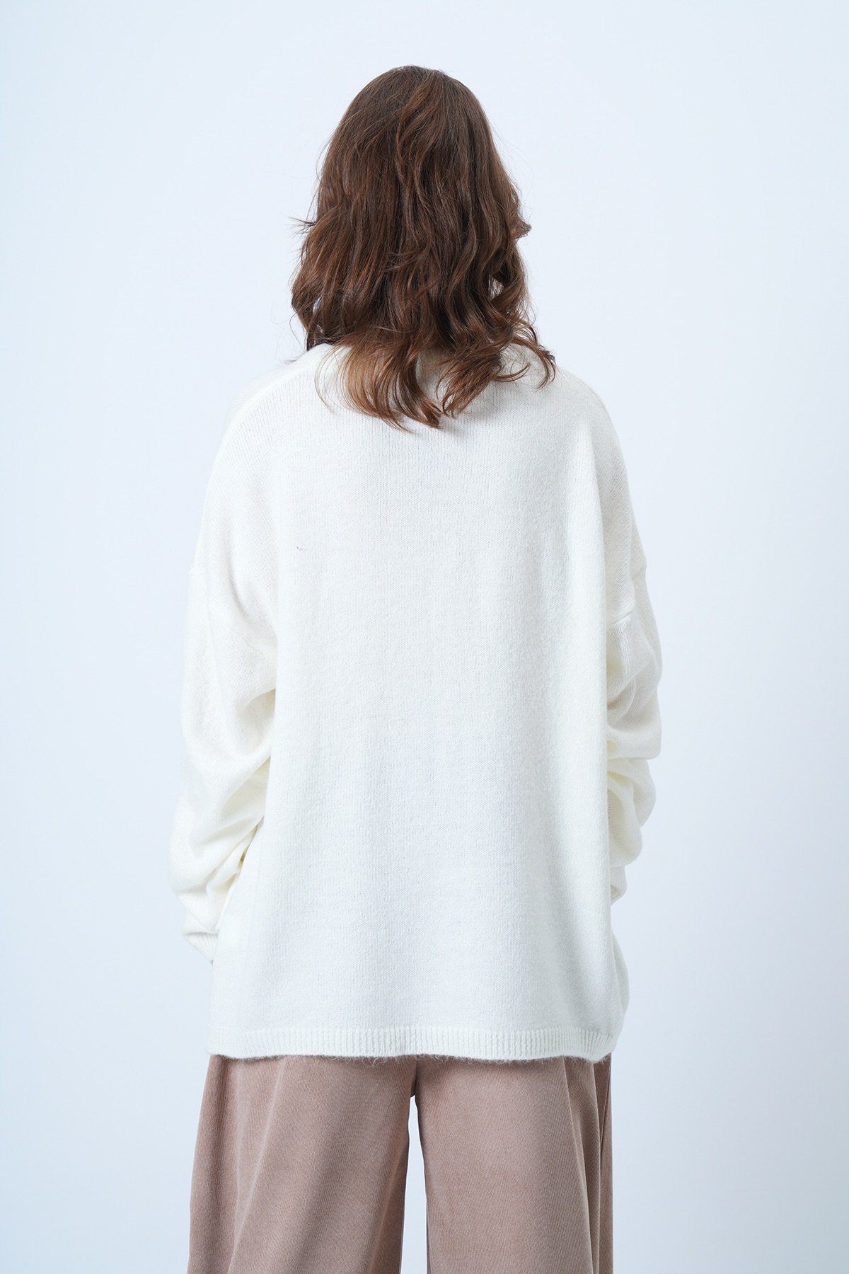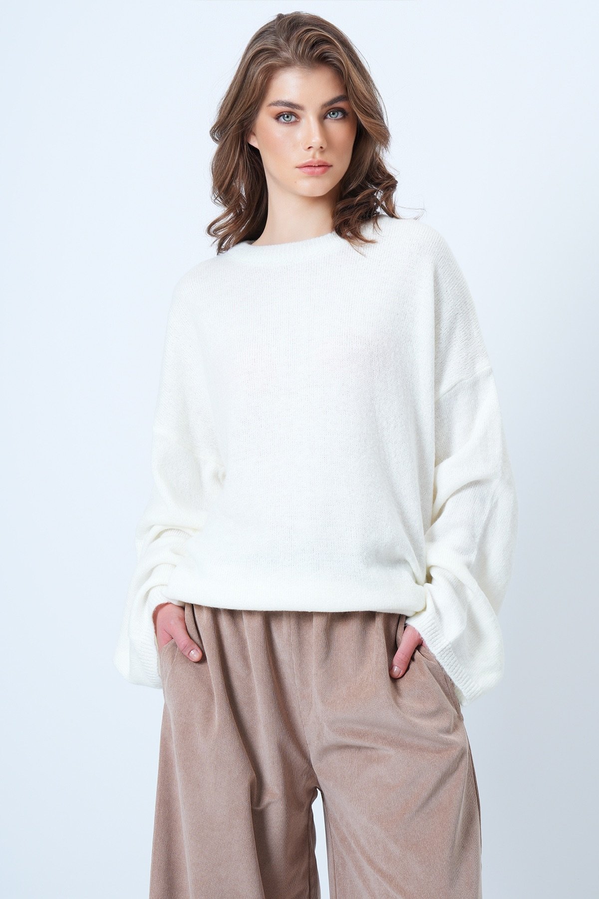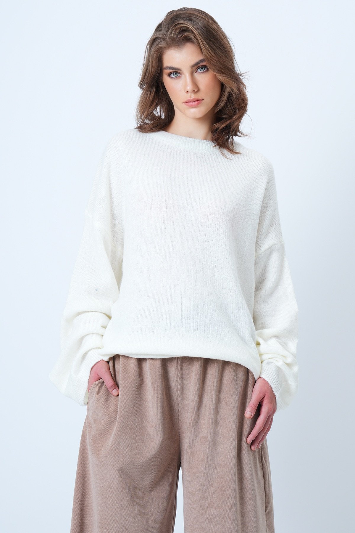 Bisiklet Yaka Oversize Yün Karışımlı Triko Kazak - EKRU (VS01186)