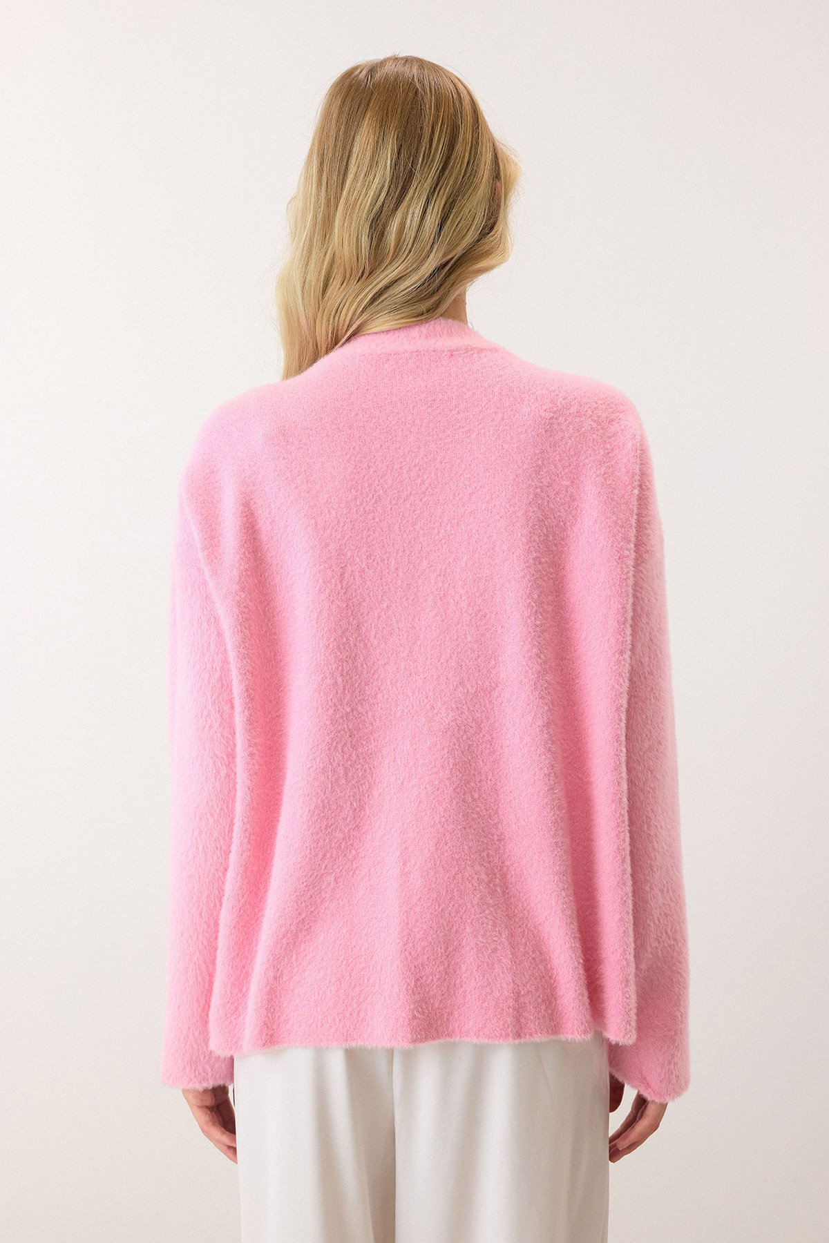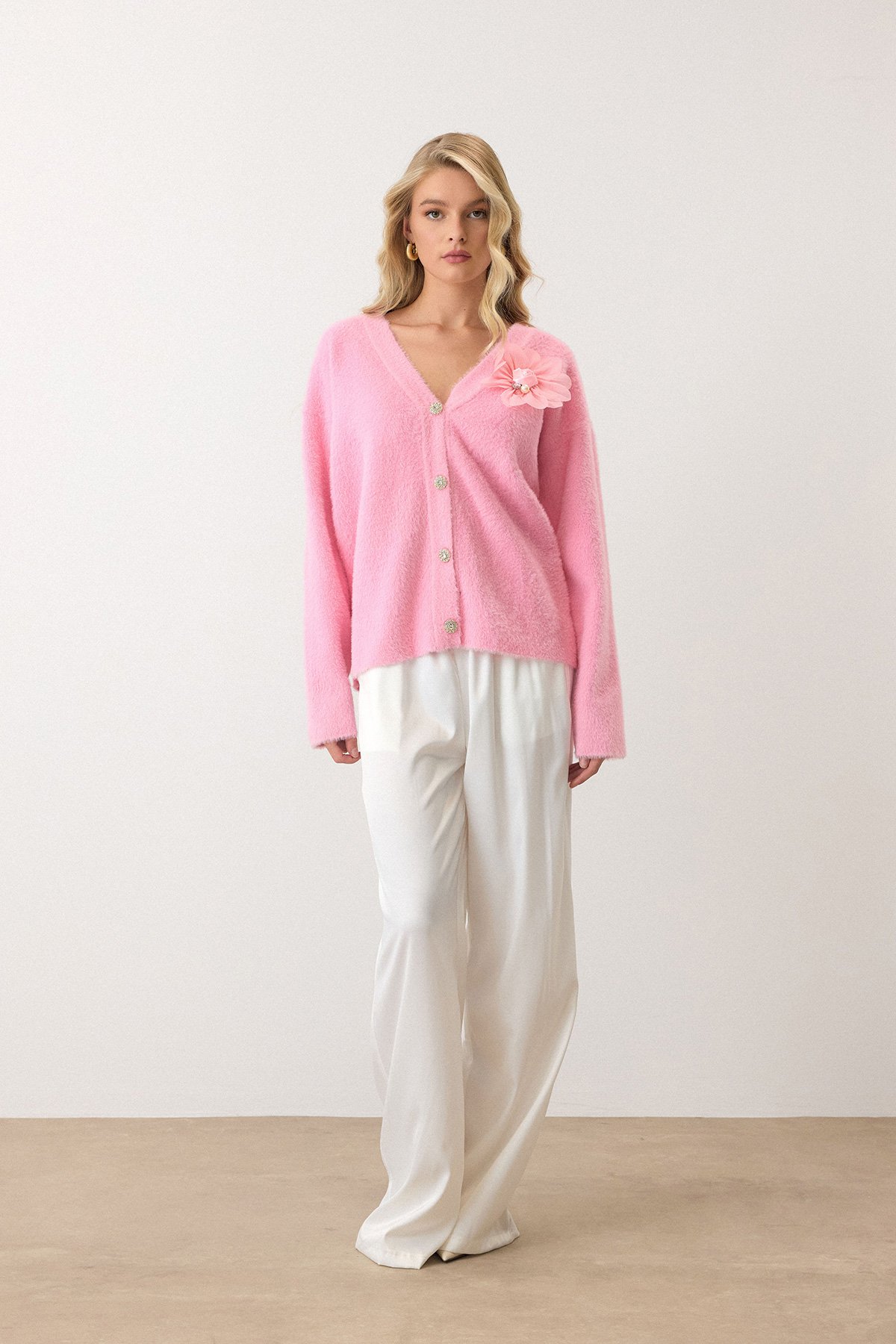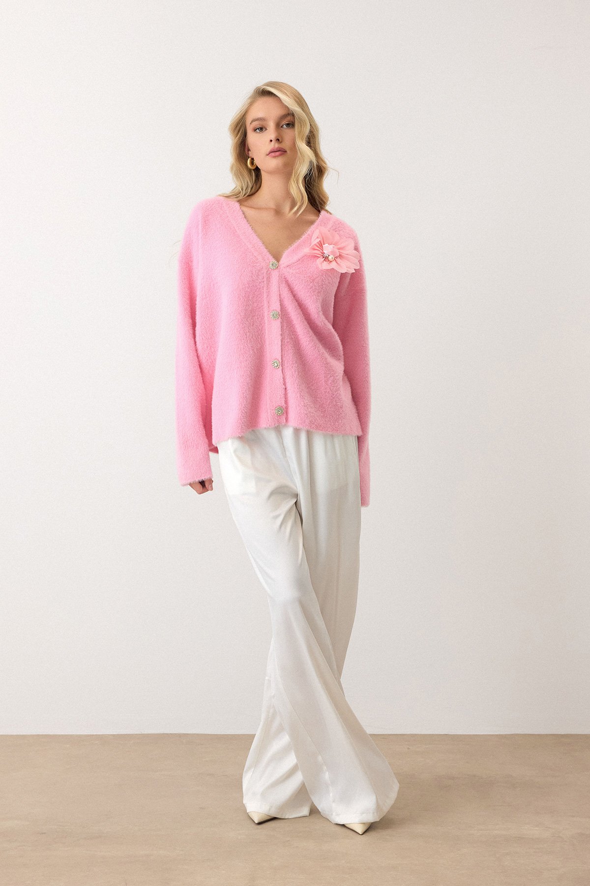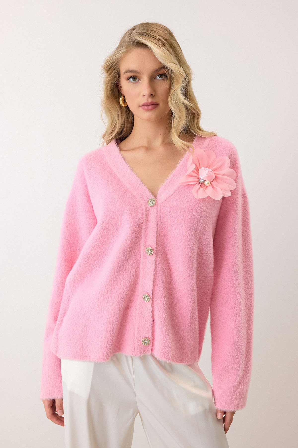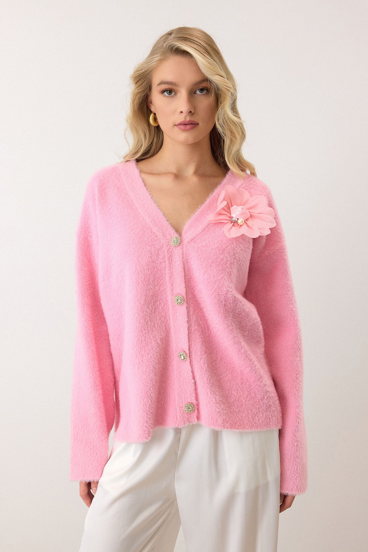 Çiçek Aksesuarlı Düğme Kapamalı Derin V Yaka Hırka - PEMBE (VS00912)