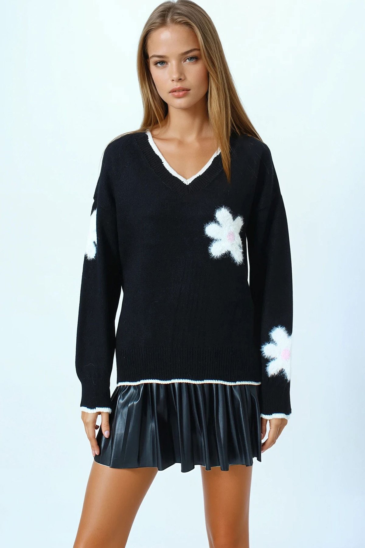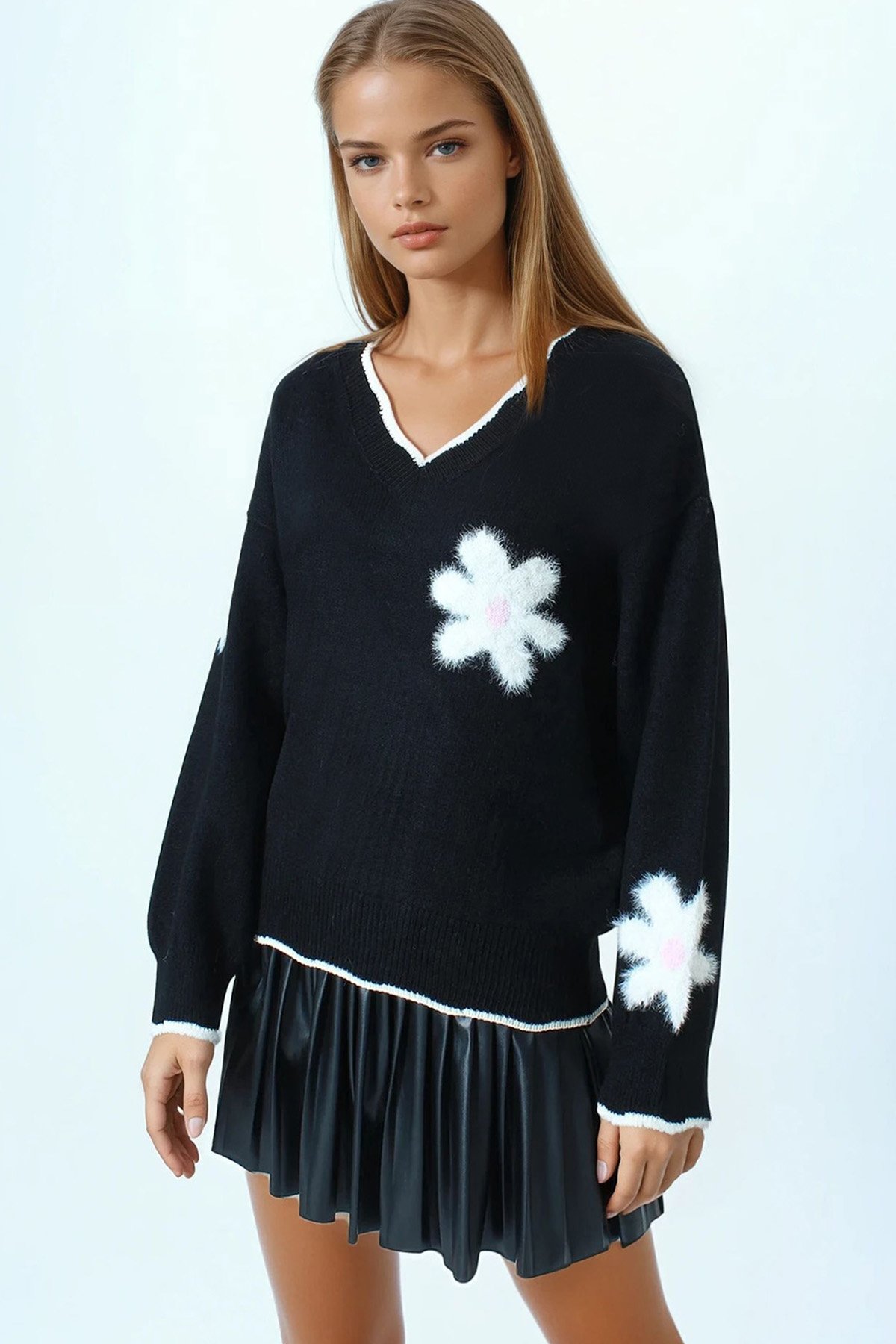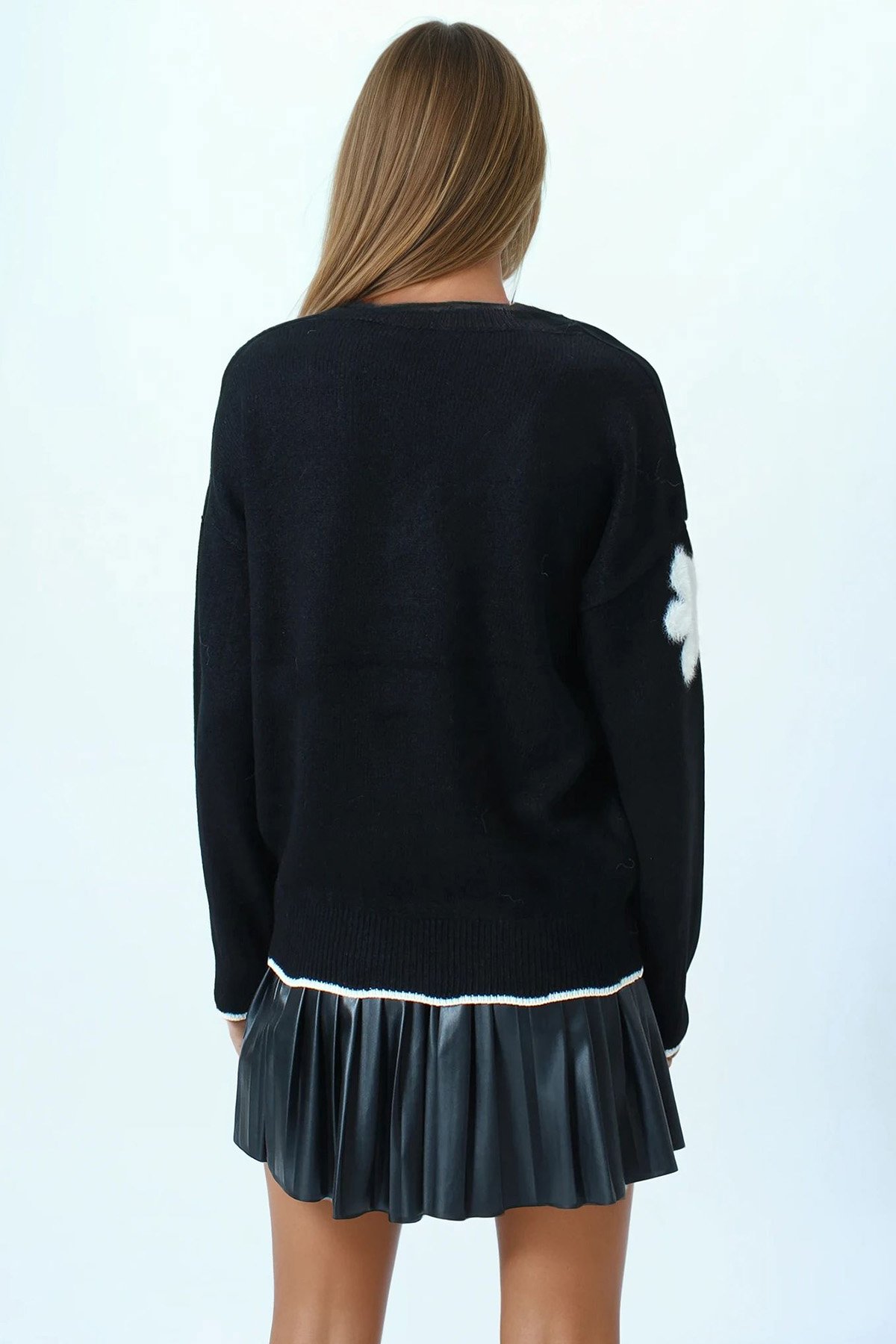 Çiçek Detaylı Bisiklet Yaka Püsküllü Triko Kazak - SİYAH (VS01054)