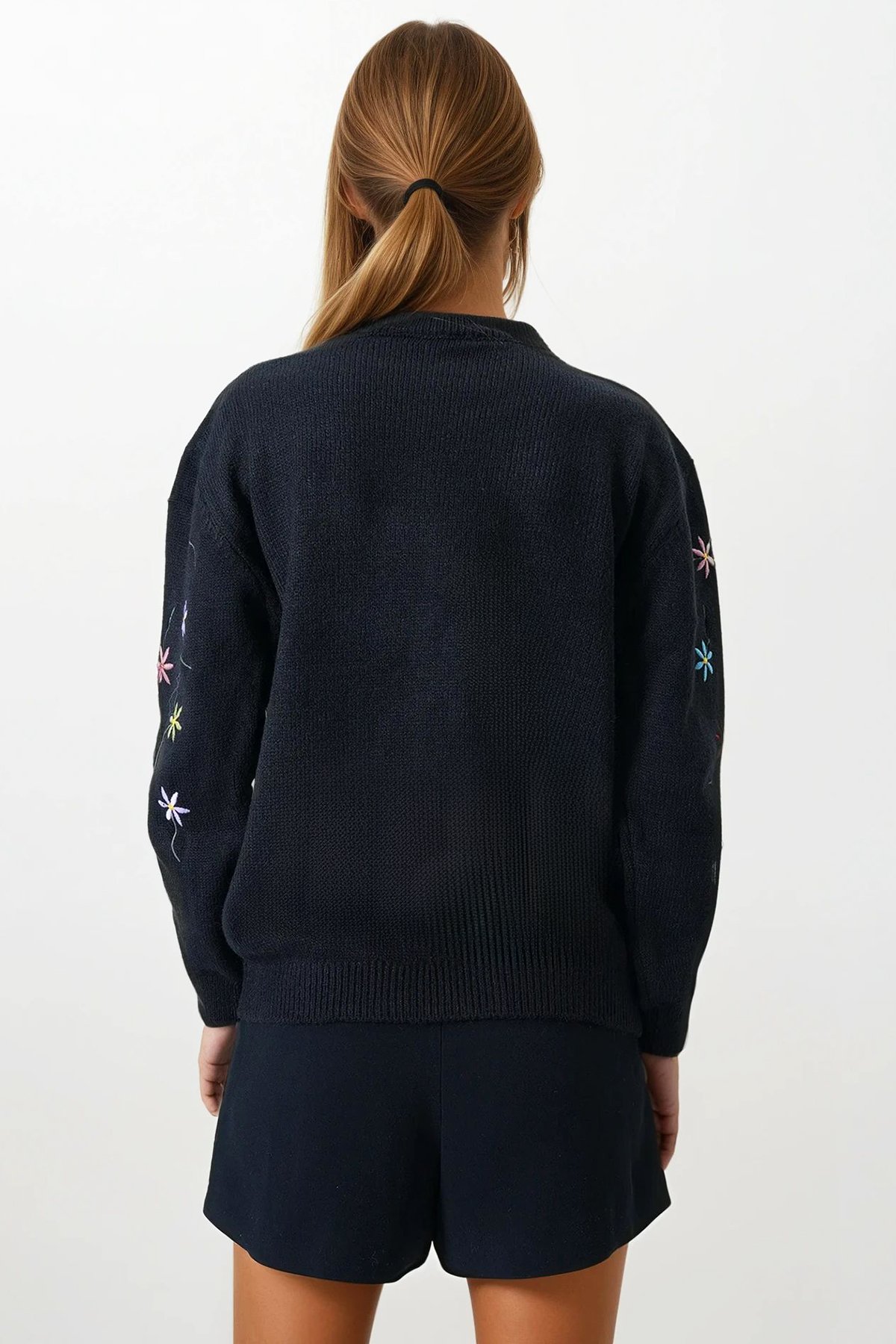 Çiçek İşlemeli Dik Yaka Triko Kazak - SİYAH (VS00858)