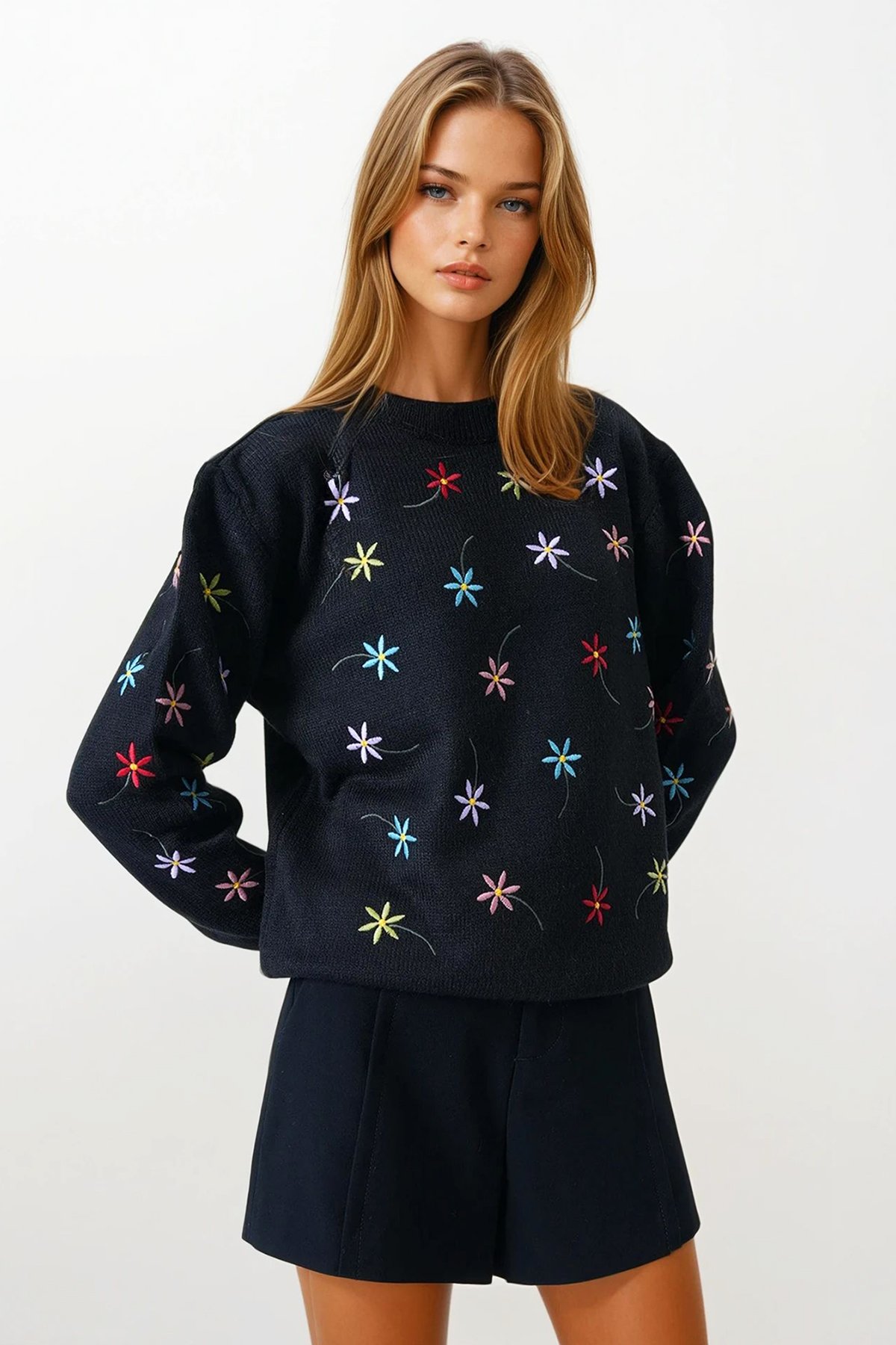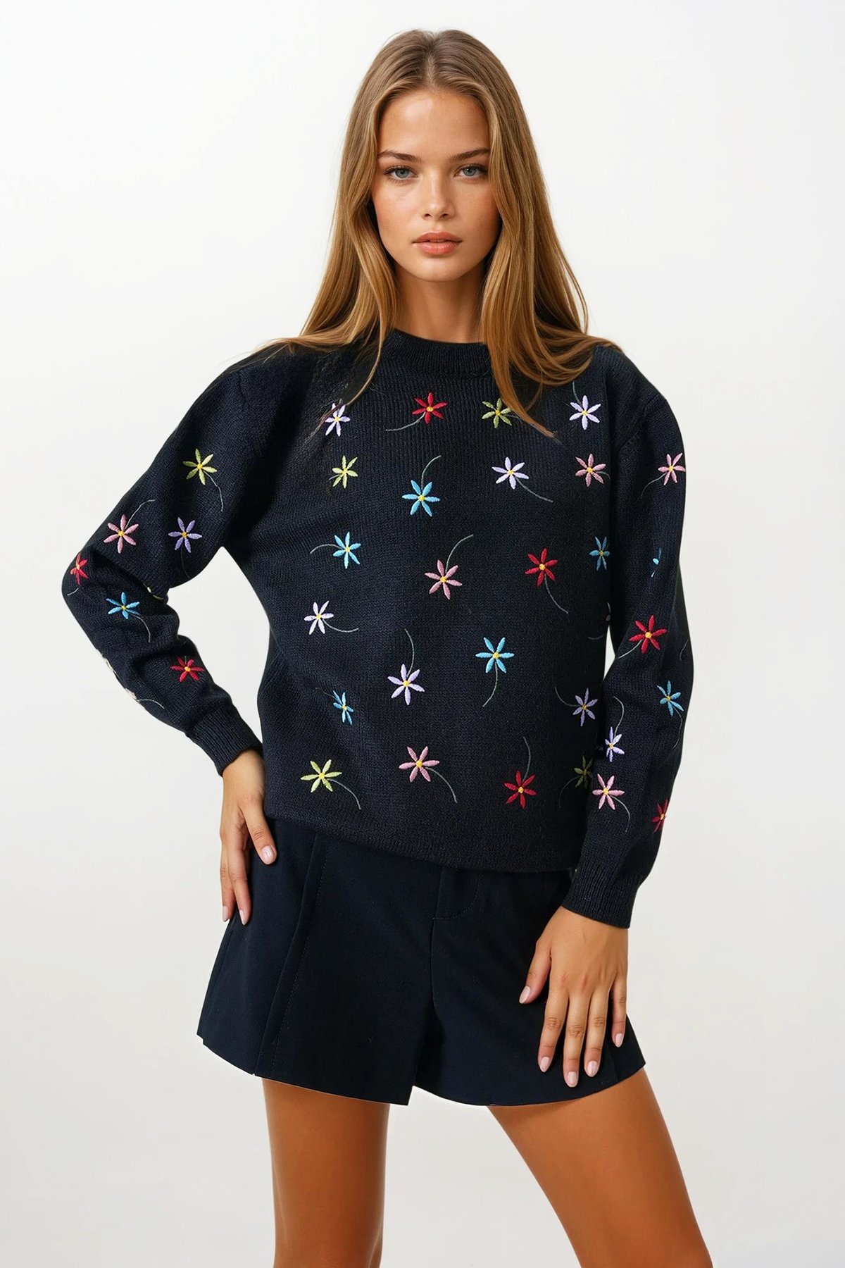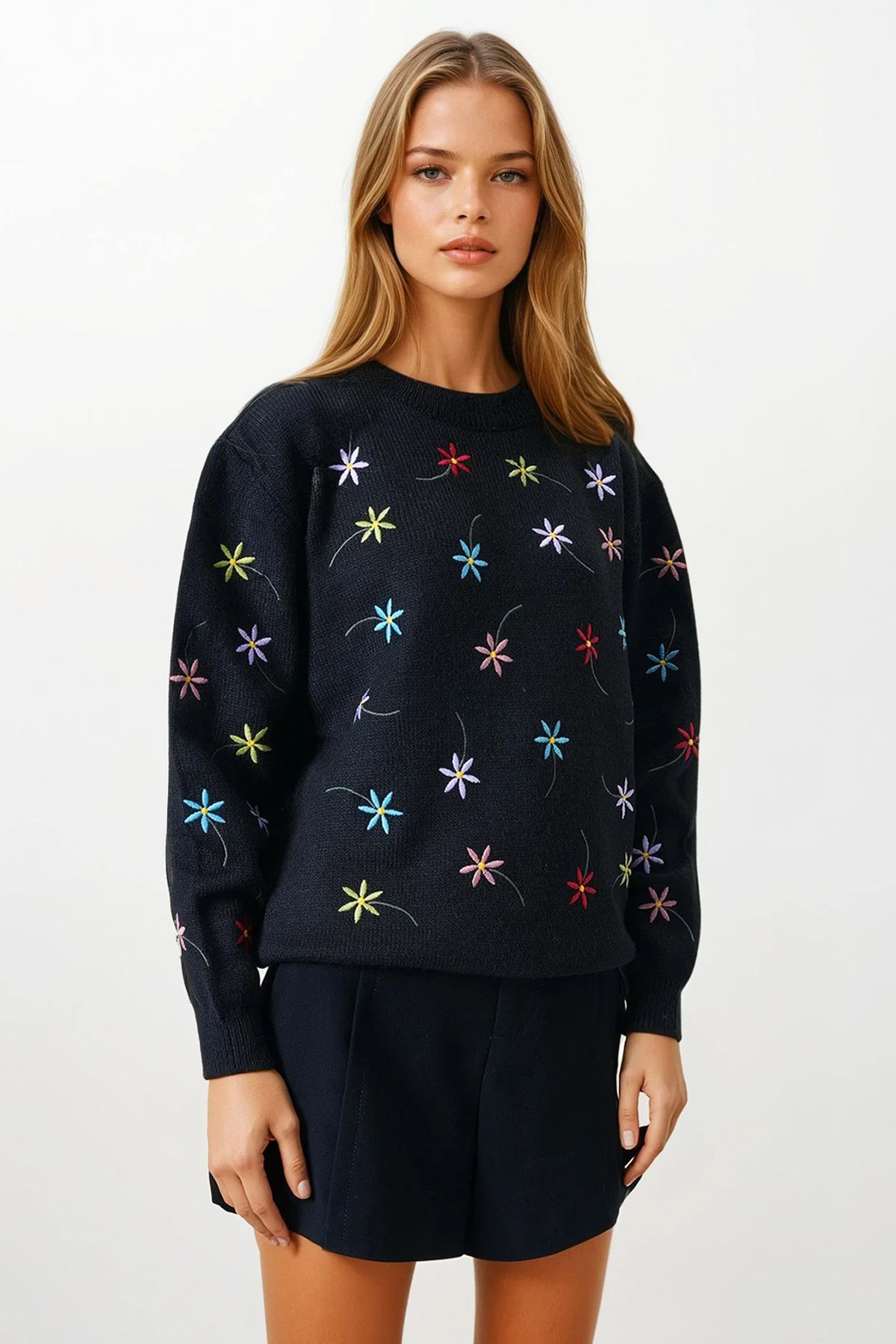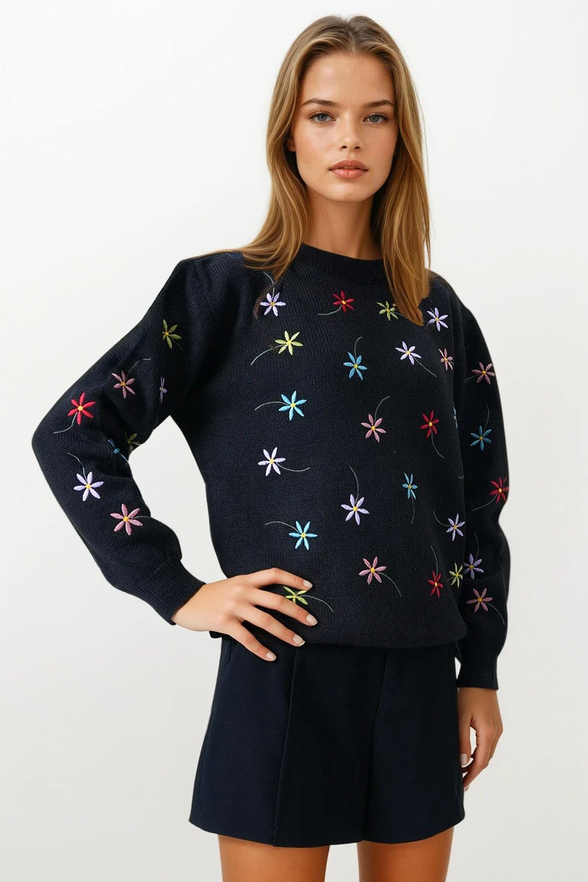 Çiçek İşlemeli Dik Yaka Triko Kazak;Stüdyo Çekimlerinde Renkler Işık Farklılığından Dolayı Değişiklik Gösterebilir.;Manken Ölçüler: Boy: 1.67 Cm Göğüs: 75 Cm Bel: 62 Cm Kalça: 80 Cm Kilo: 45 Cm S/36/1 Beden