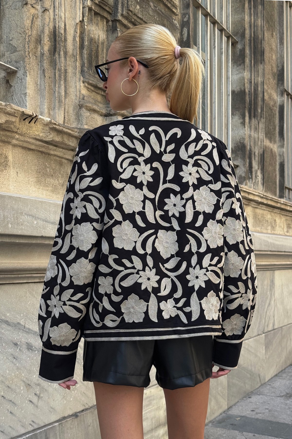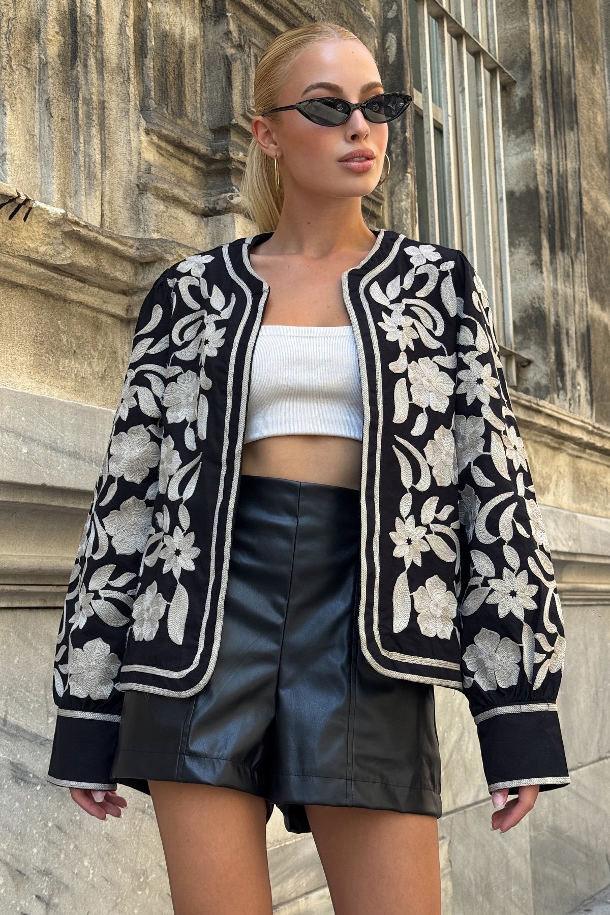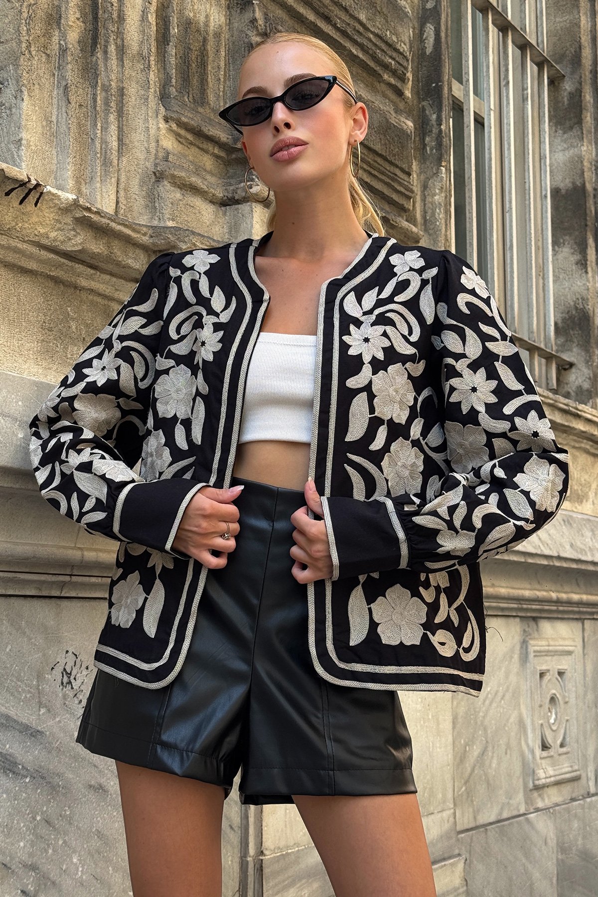Çiçek Nakışlı İçi Astarlı Ceket - SİYAH (VS00717)