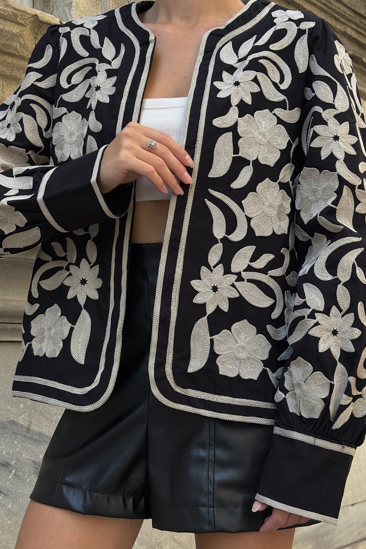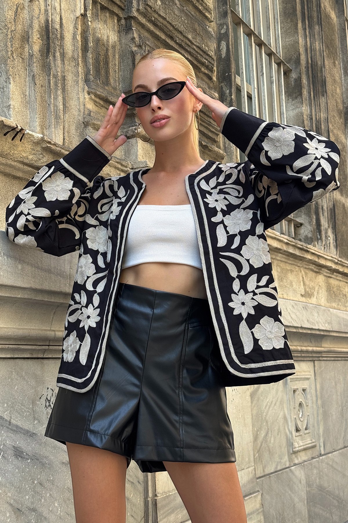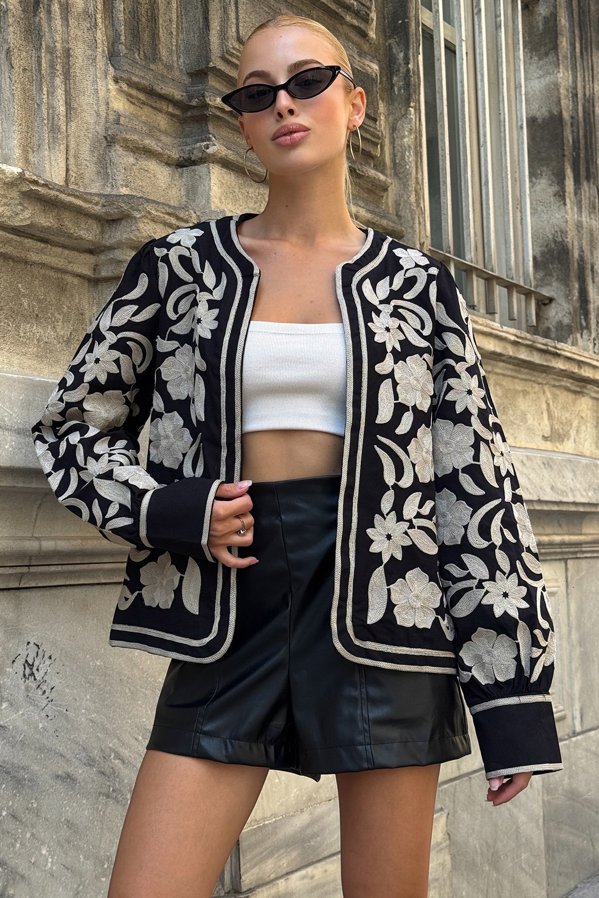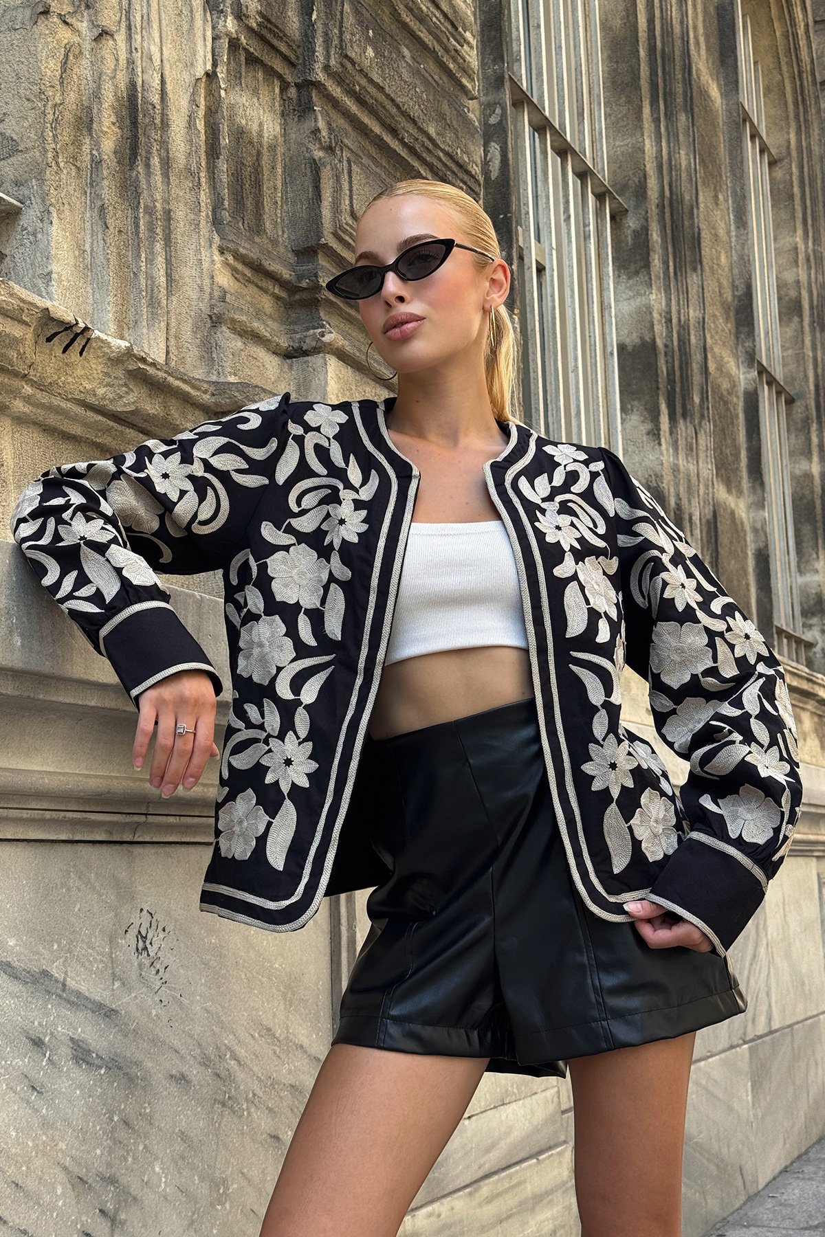 Çiçek Nakışlı İçi Astarlı Ceket - SİYAH (VS00717)