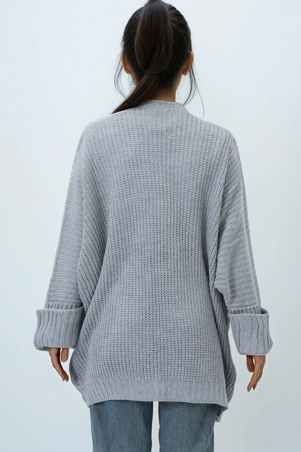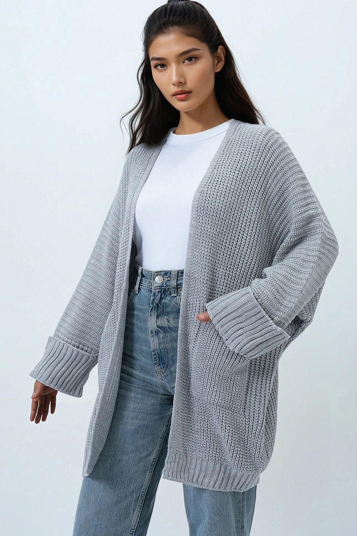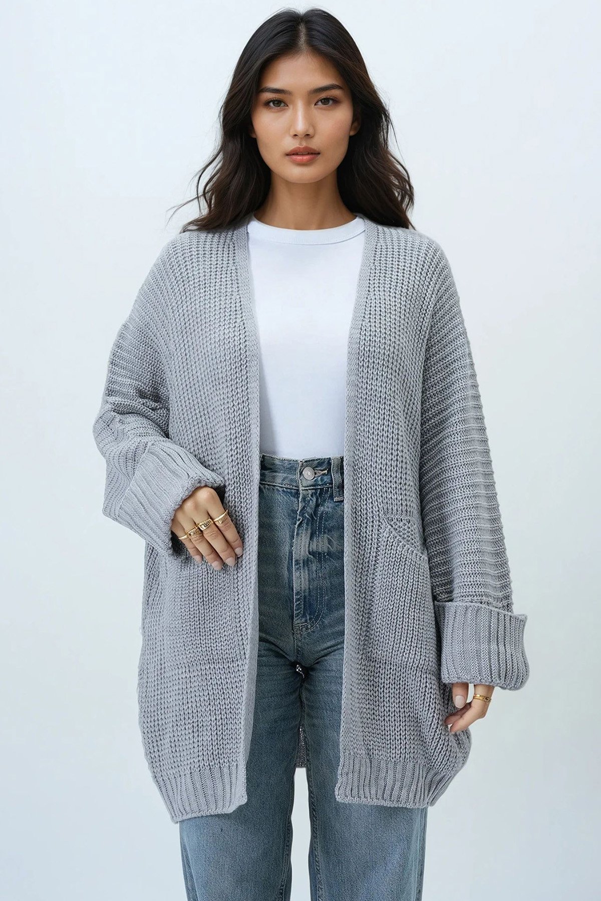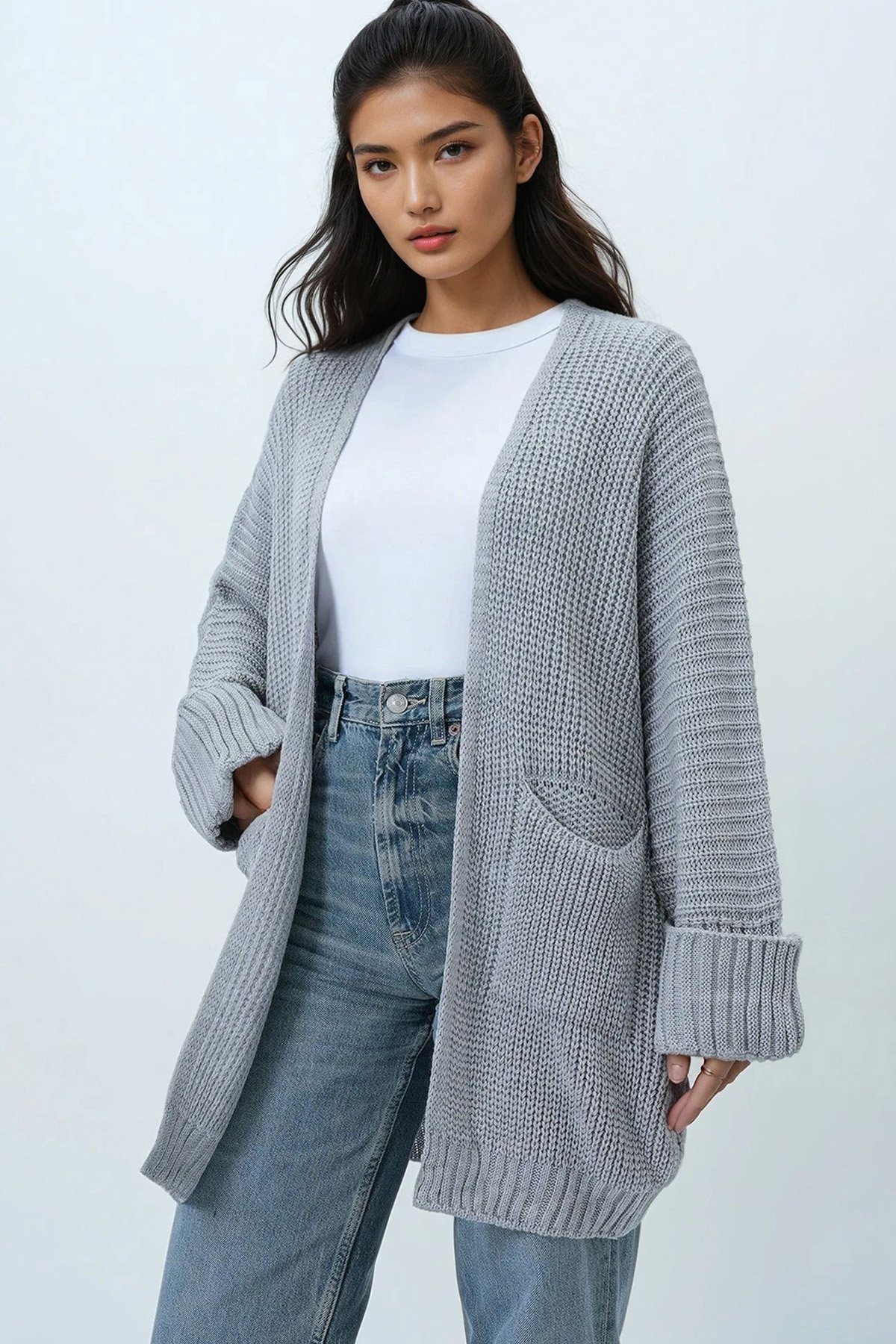 Çift Cepli Duble Kol Selanik Örgü Uzun Triko Hırka - Gri (ALC-X14439)