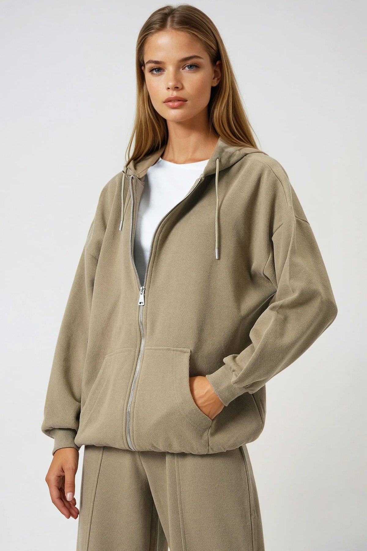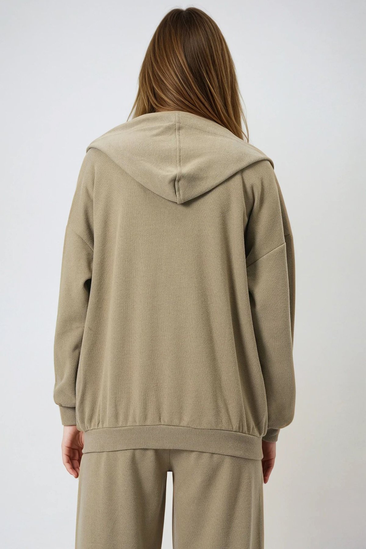 Çift Cepli Fermaur Kapamalı Kapüşonlu Hırka - HAKİ (VS01015)