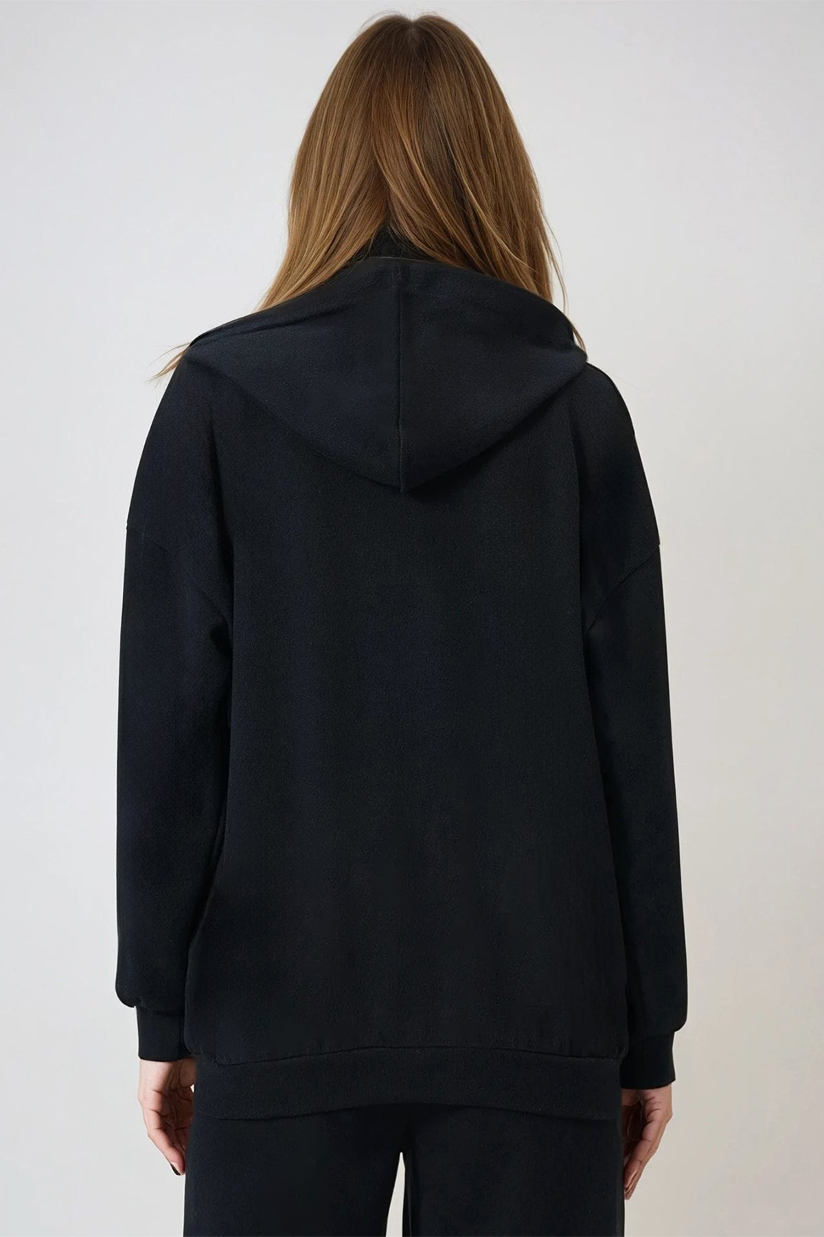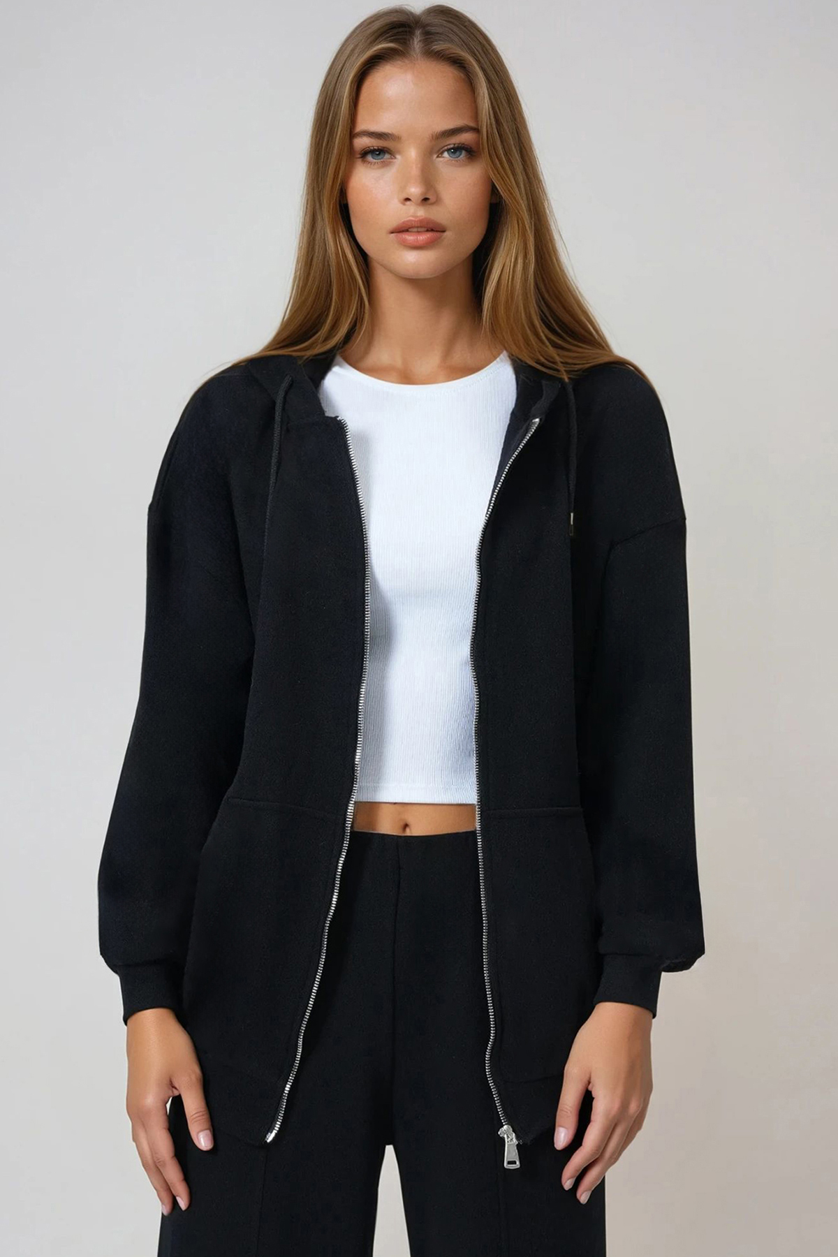 Çift Cepli Fermaur Kapamalı Kapüşonlu Hırka - SİYAH (VS01015)