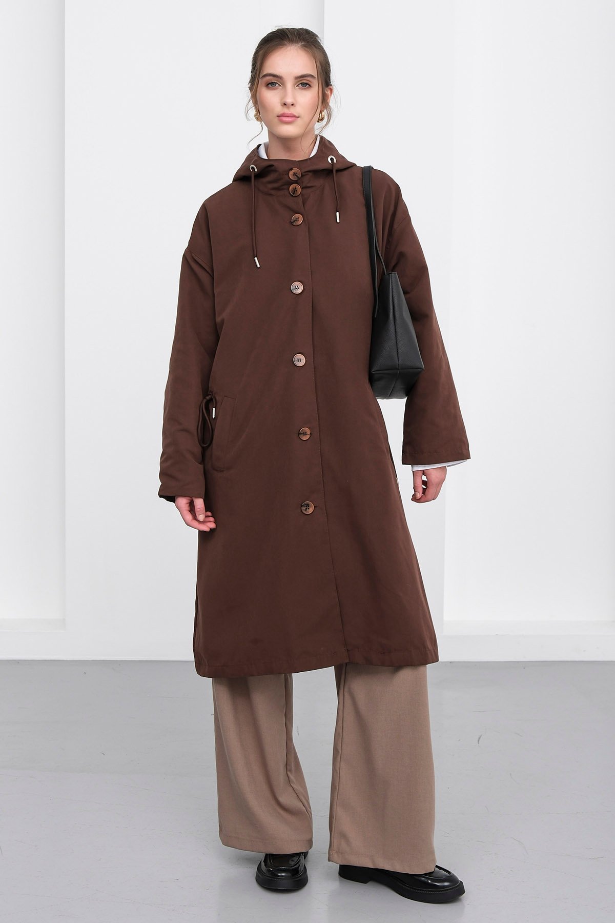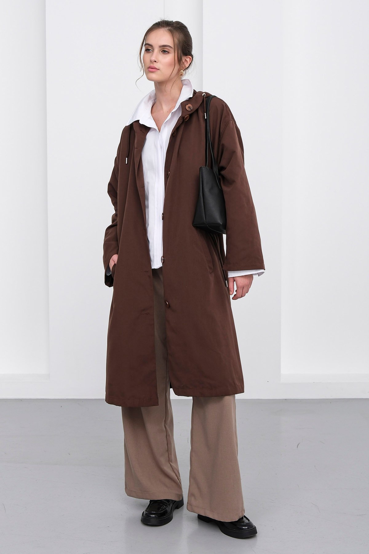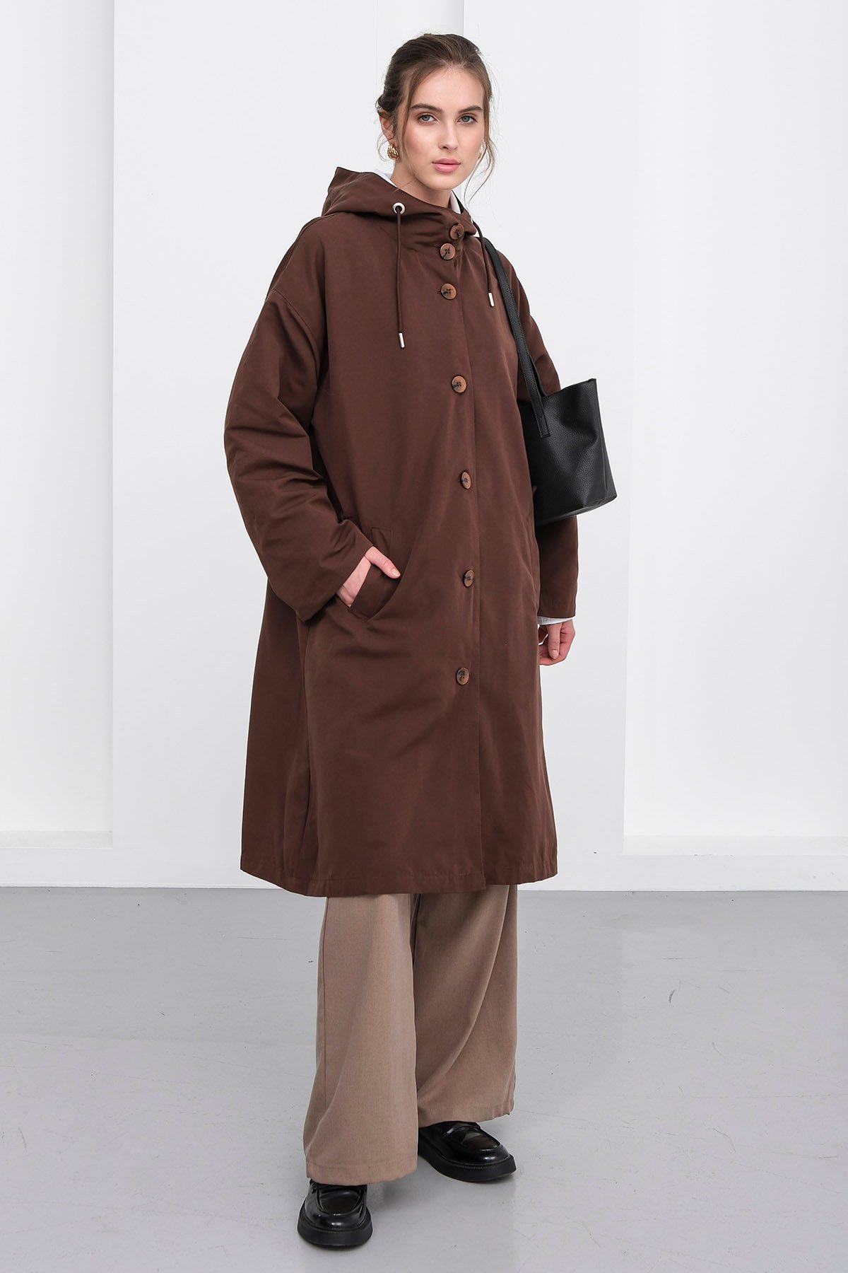 Çift Cepli Kapüşonlu Düğme Kapamalı Trençkot - KAHVERENGİ (VS01238)