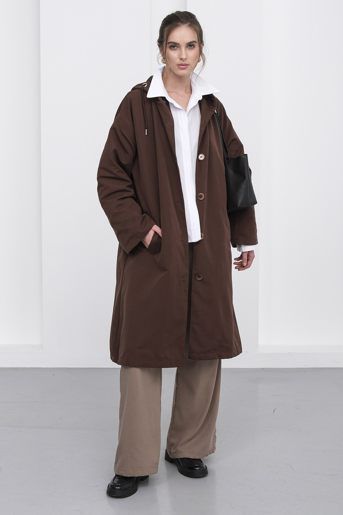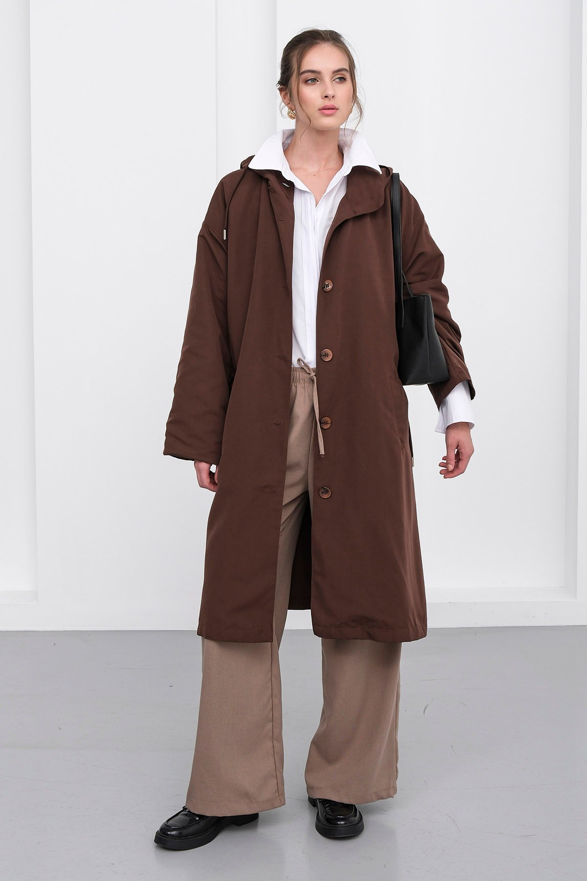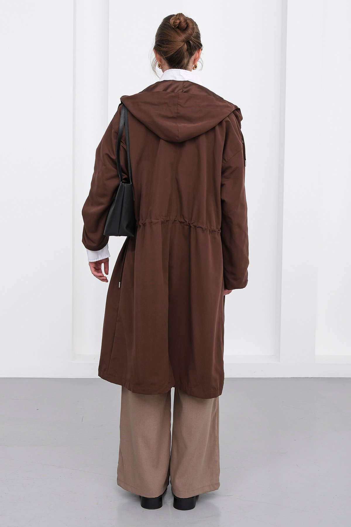 Çift Cepli Kapüşonlu Düğme Kapamalı Trençkot - KAHVERENGİ (VS01238)