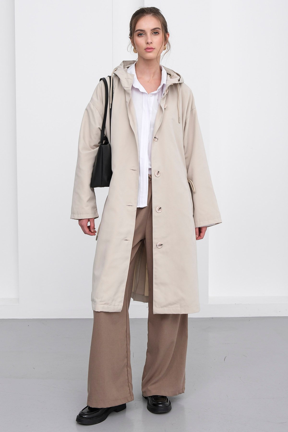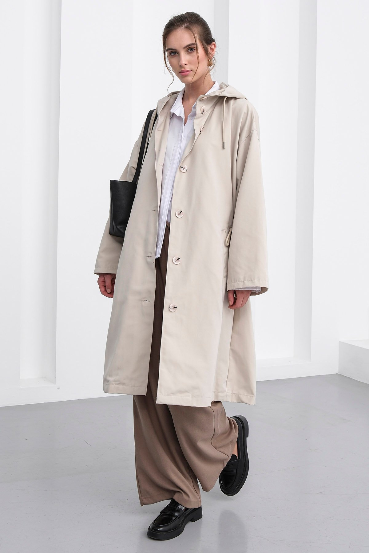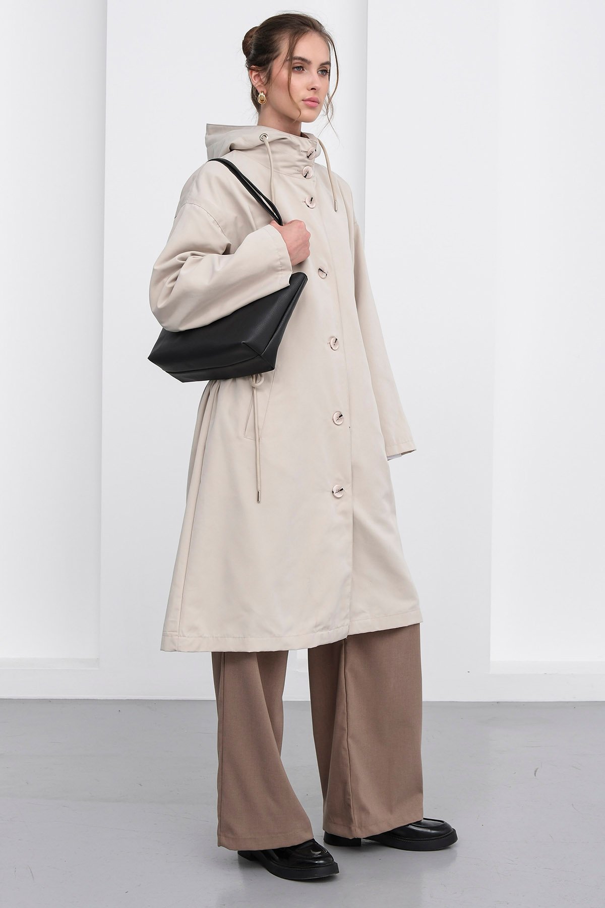 Çift Cepli Kapüşonlu Düğme Kapamalı Trençkot;Stüdyo Çekimlerinde Renkler Işık Farklılığından Dolayı Değişiklik Gösterebilir.;Model Ölçüler: Boy: 1.67 Cm Göğüs: 75 Cm Bel: 62 Cm Kalça: 80 Cm Kilo: 45 Cm S/36/1 Beden
