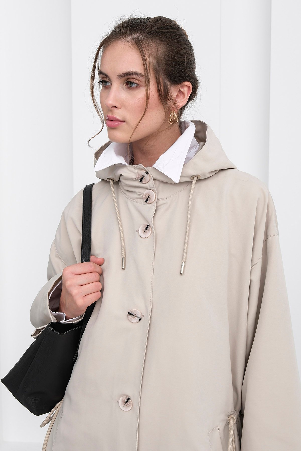 Kadın Taş Çift Cepli Kapüşonlu Beli Bağlamalı Düğme Kapamalı Astarlı Trençkot VS01238 (VS01238)