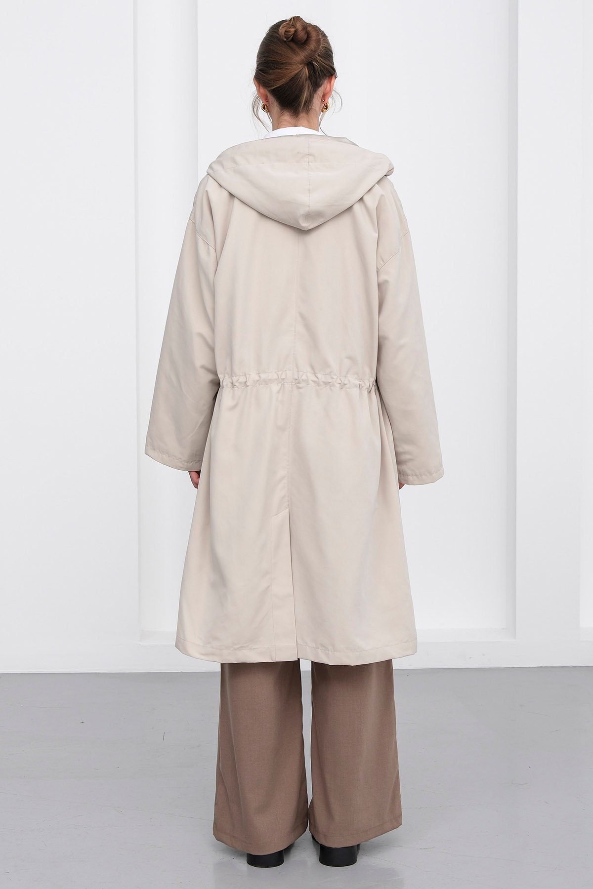 Kadın Taş Çift Cepli Kapüşonlu Beli Bağlamalı Düğme Kapamalı Astarlı Trençkot VS01238 Kadın Kahverengi Çift Cepli Kapüşonlu Beli Bağlamalı Düğme Kapamalı Astarlı Trençkot VS01238