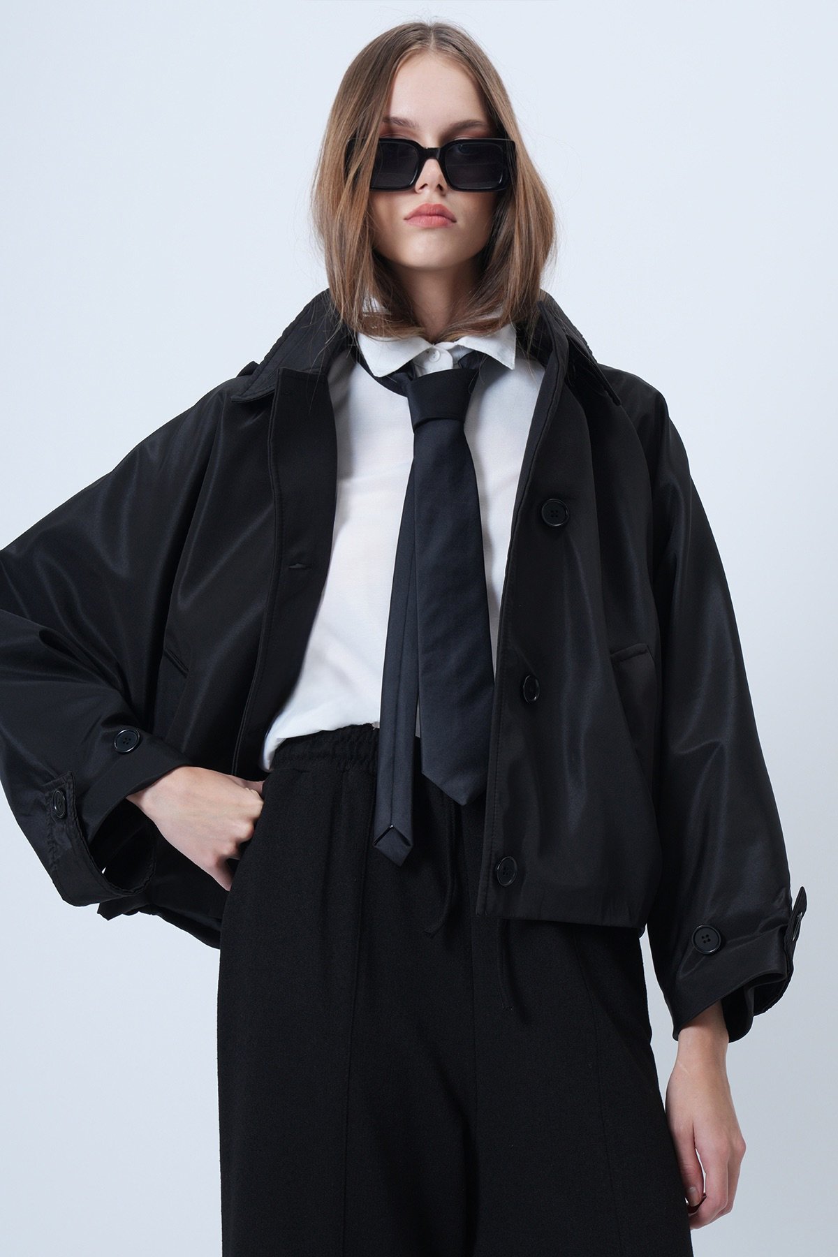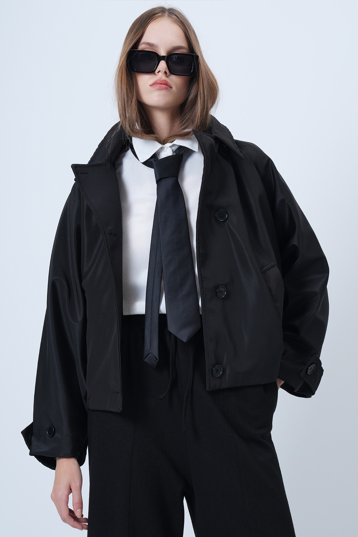 Çift Ceplidüğme Kapamalı Kısa Trençkot - SİYAH (VS01307)