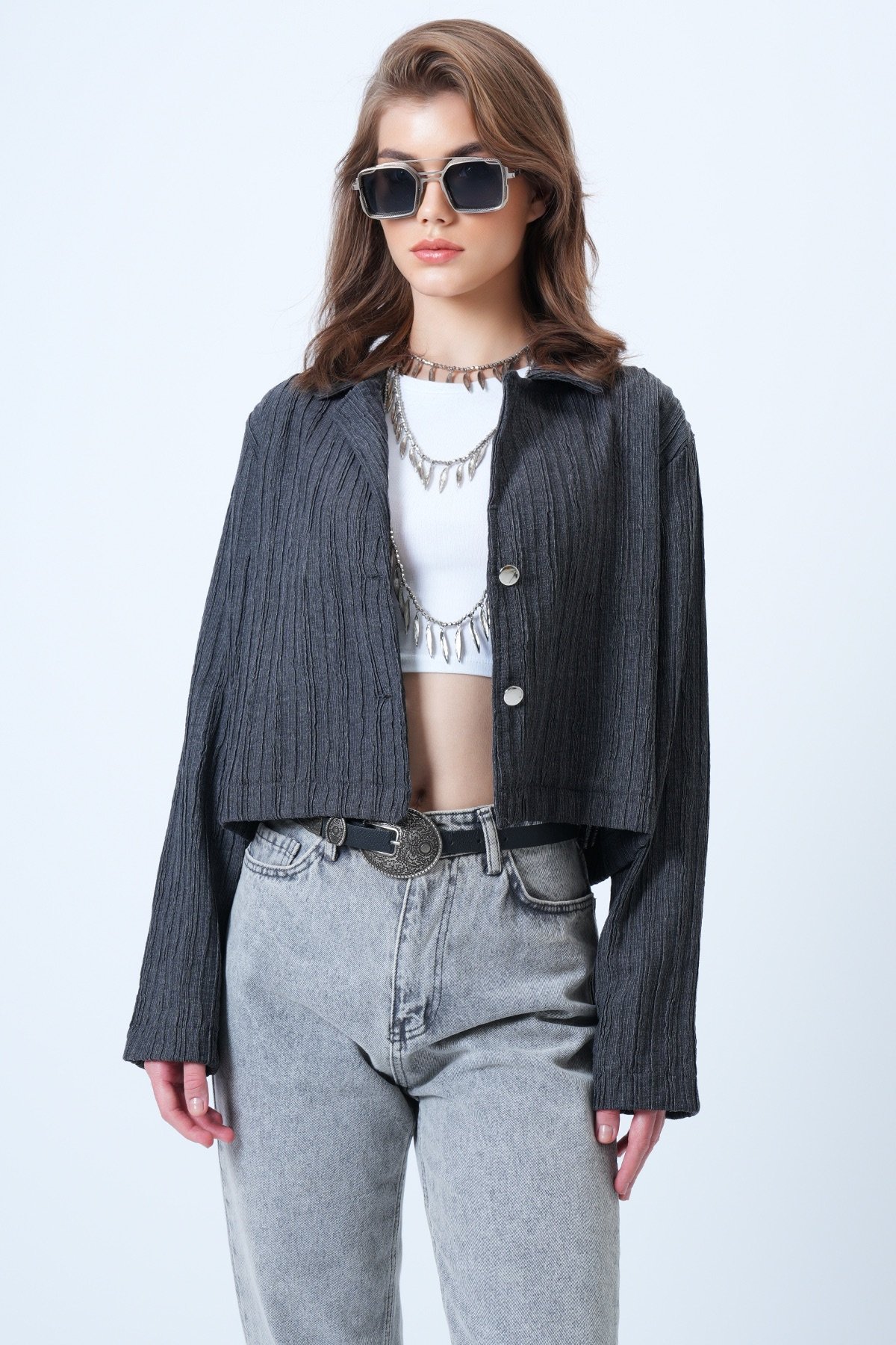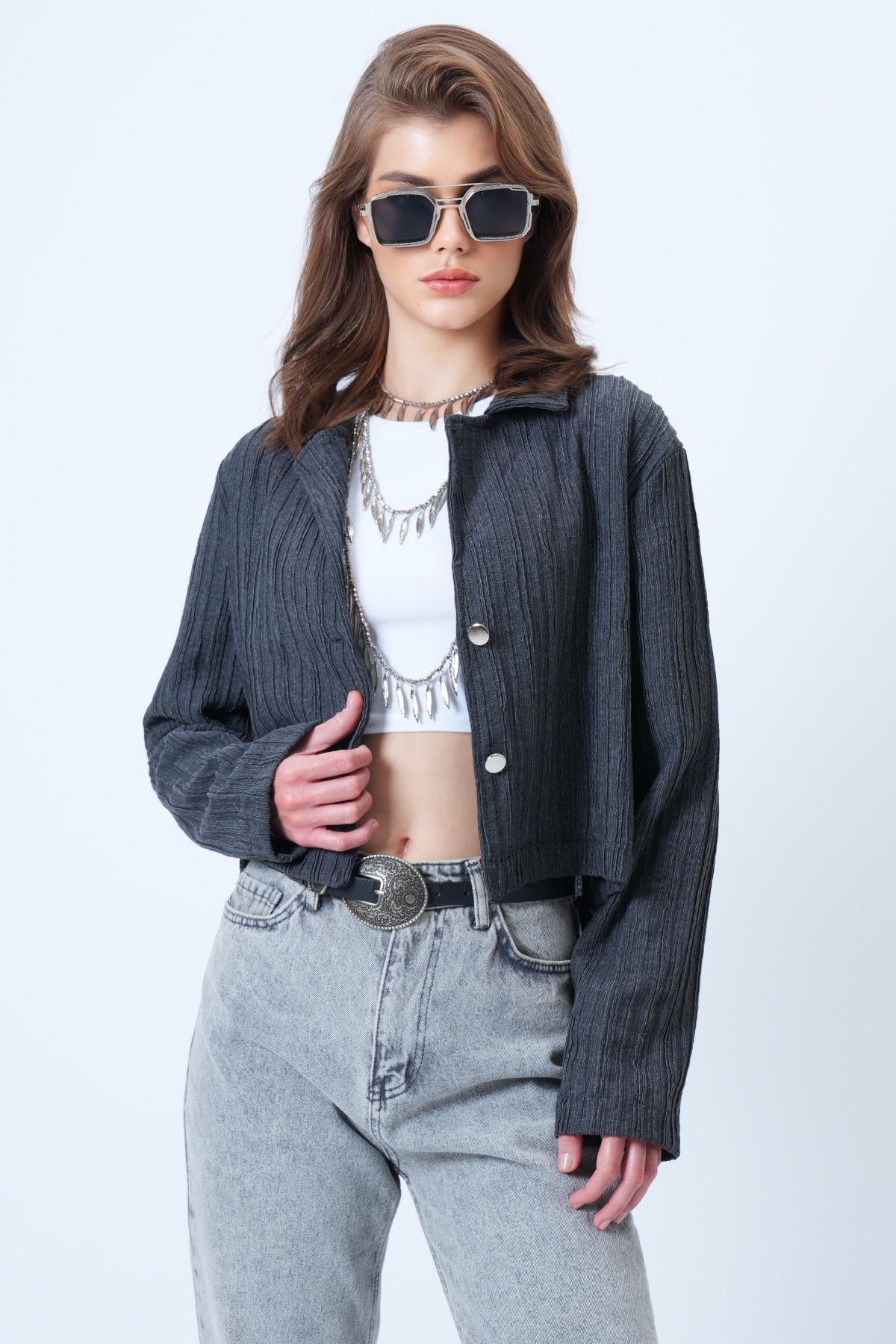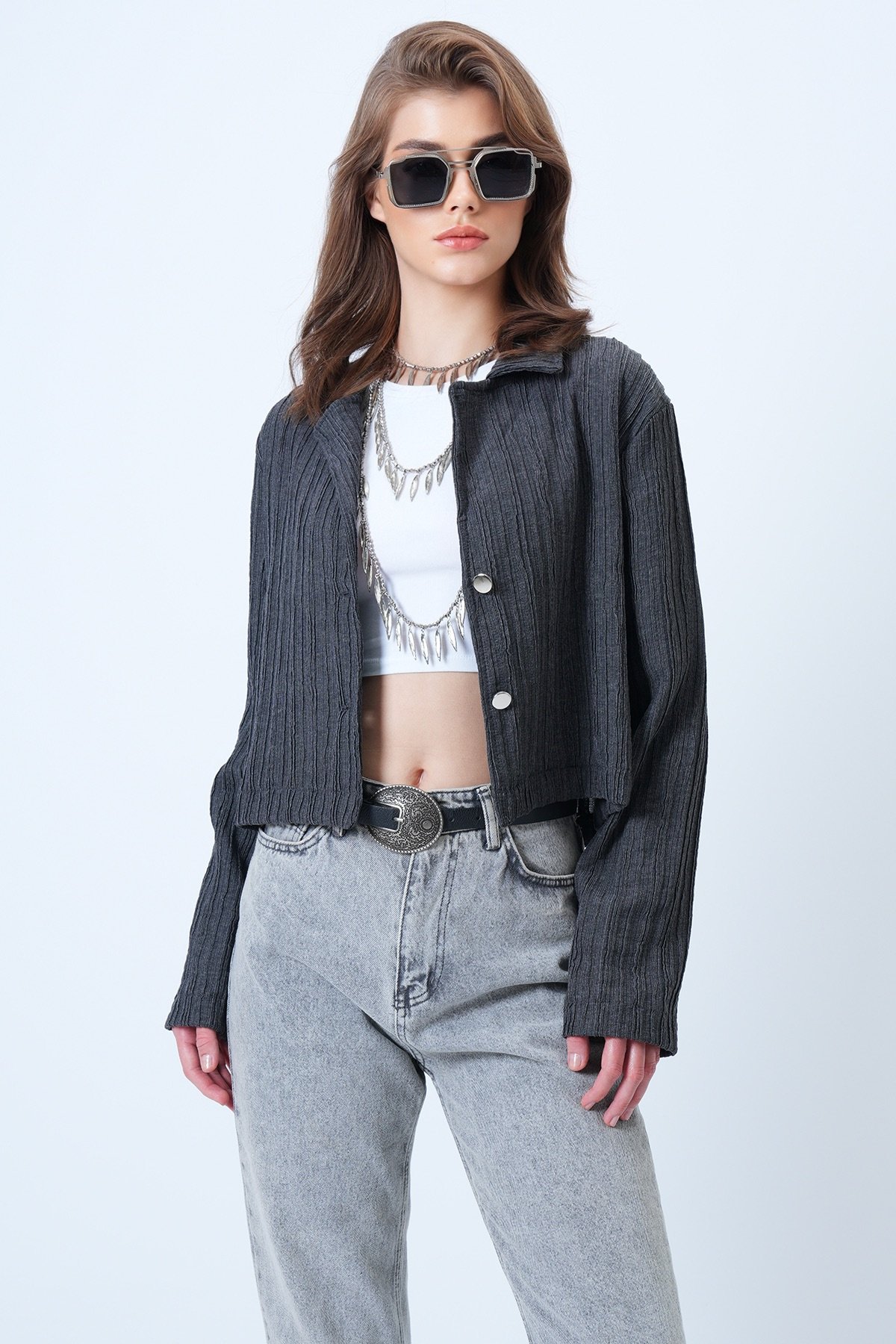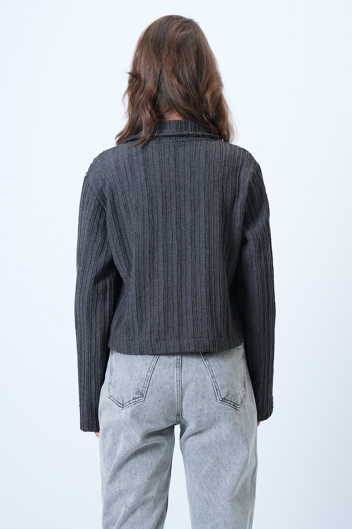 Çift Düğmeli Derin V Yaka Bürümcük Gömlek - ANTRASİT (VS01180)