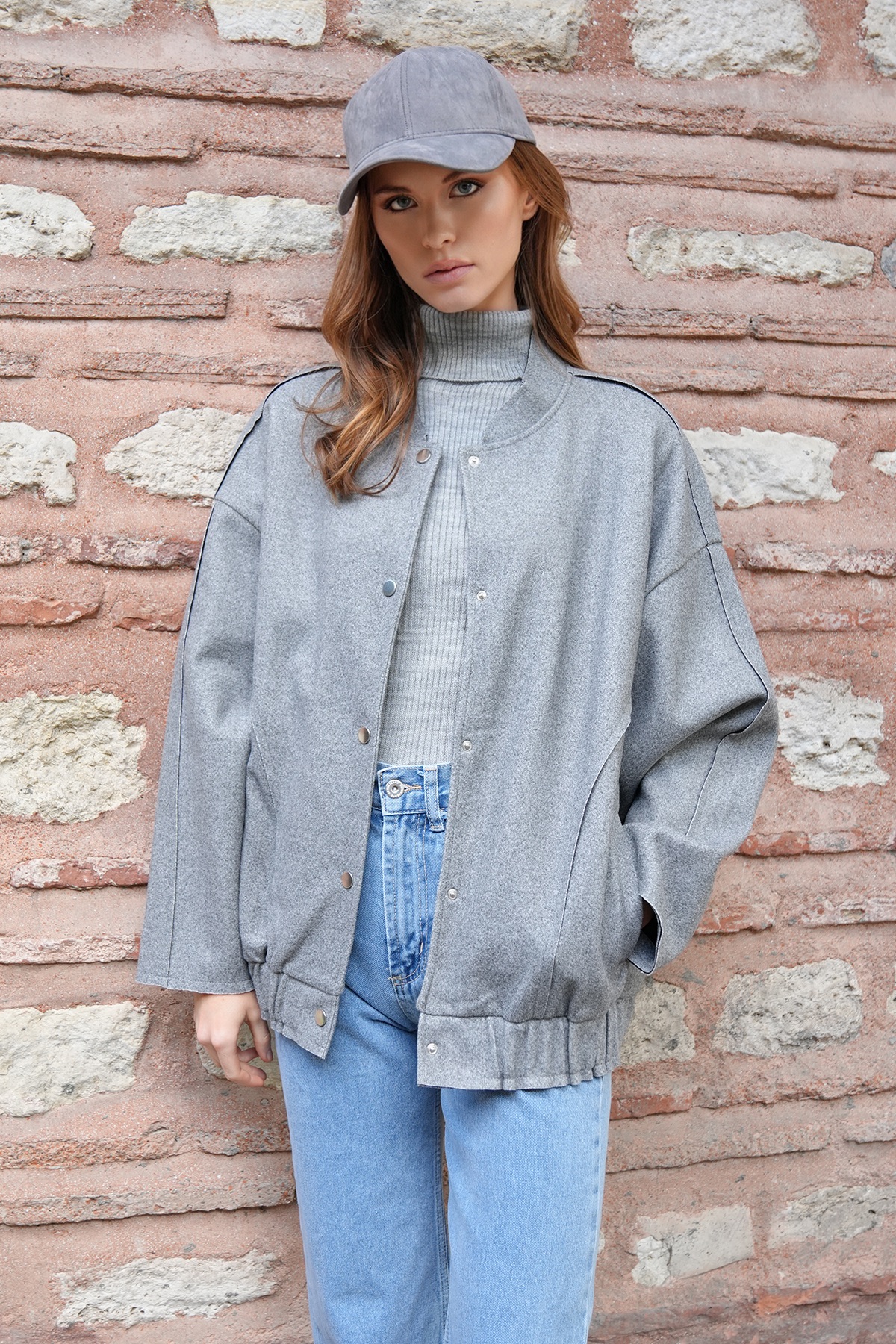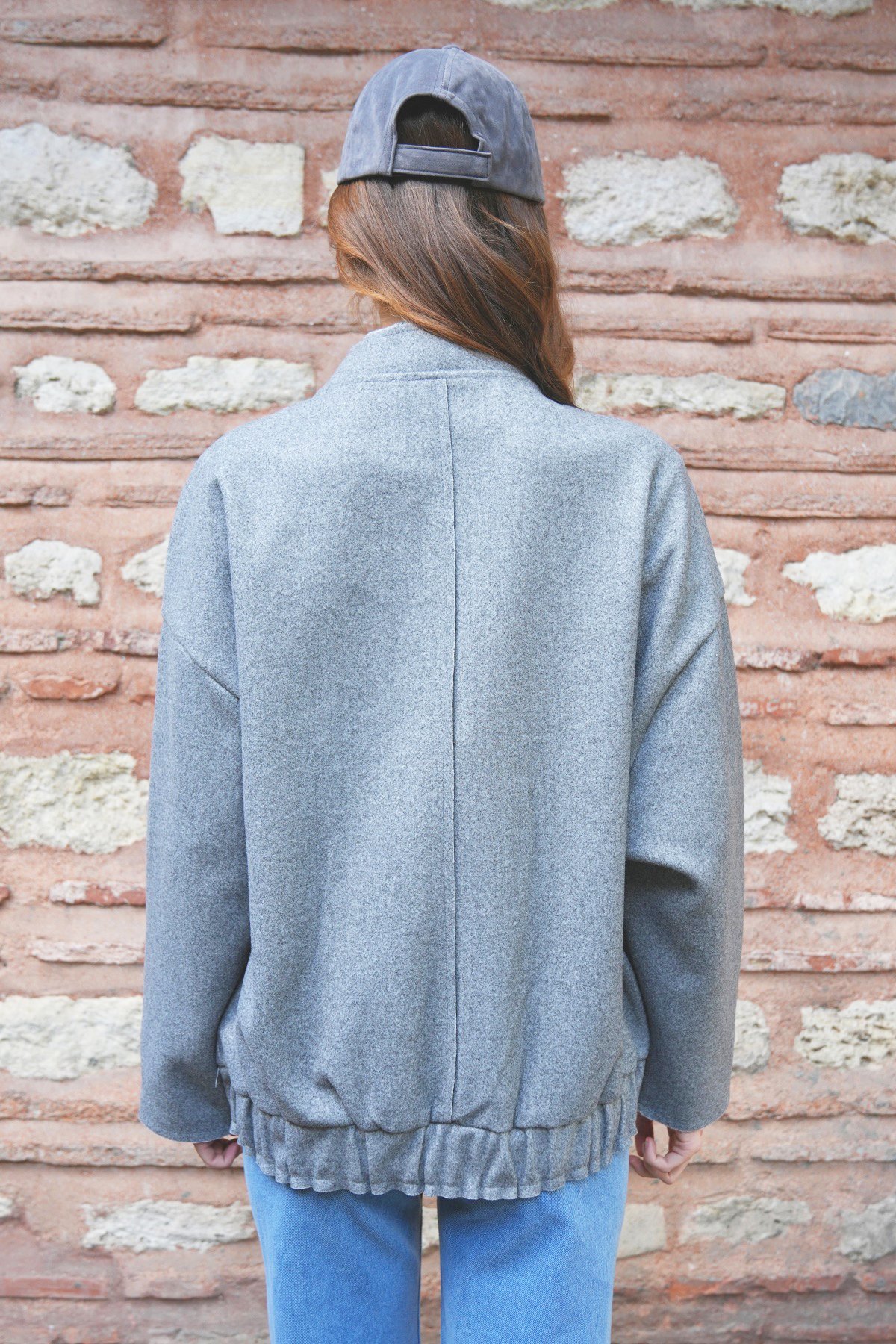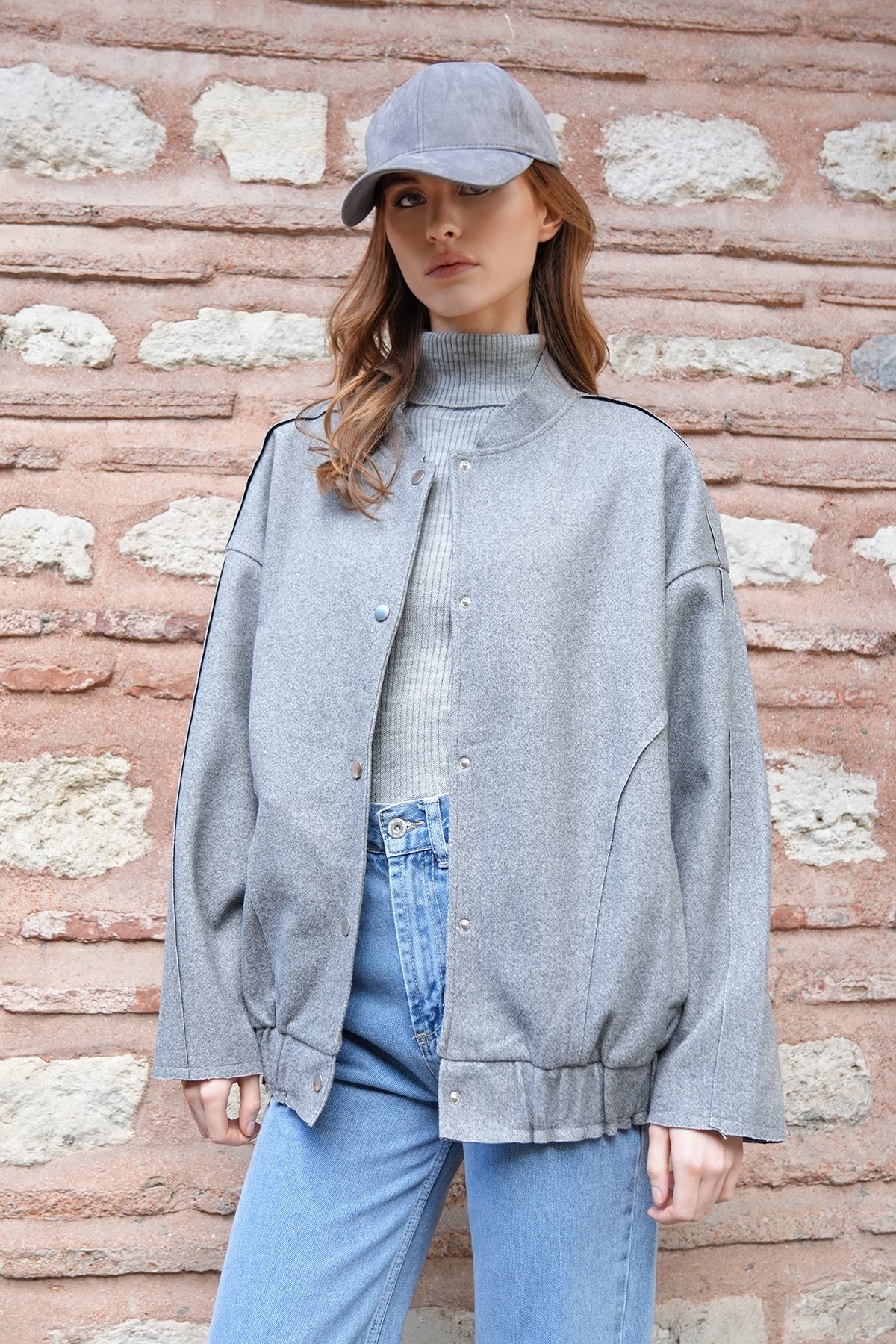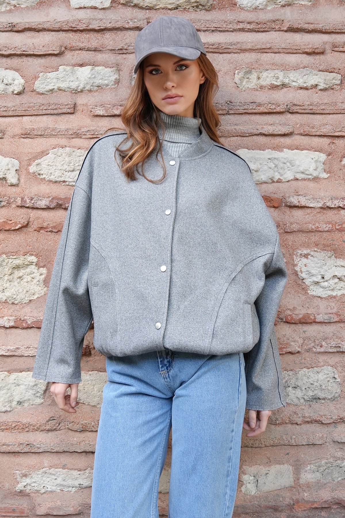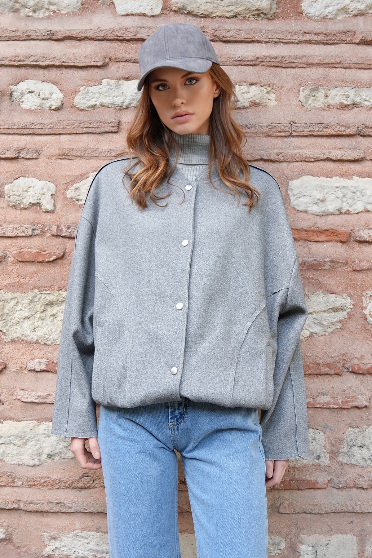 Çıt Çıt Kapamalı Çift Cepli Beli Lastilkli Kaşe Ceket - GRİ (VS01227)