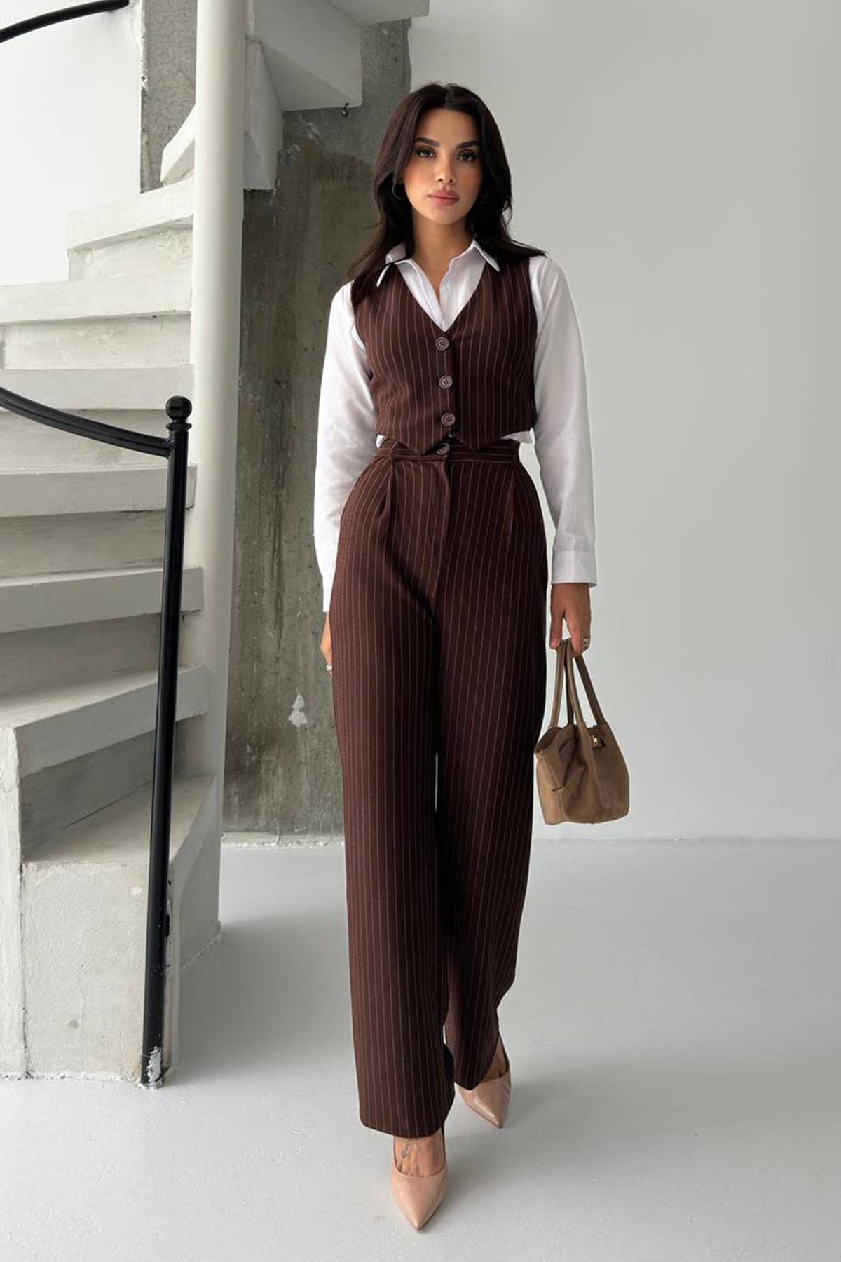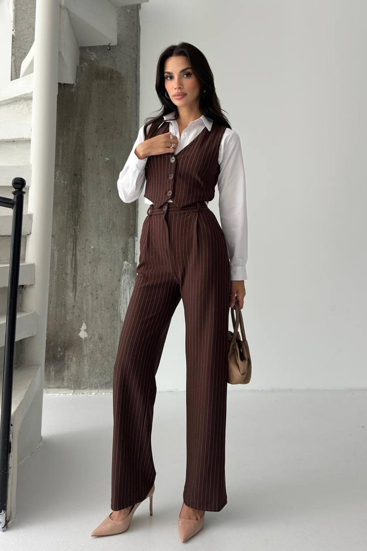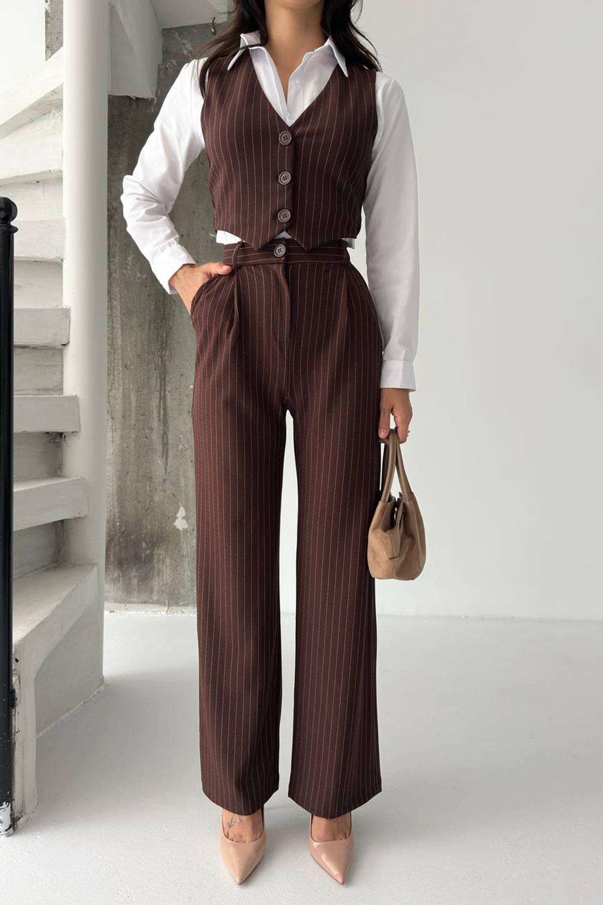 Çizgili Düğmeli Yelek ve Palazzo Pantolon Takım - KAHVERENGİ (VS01343)