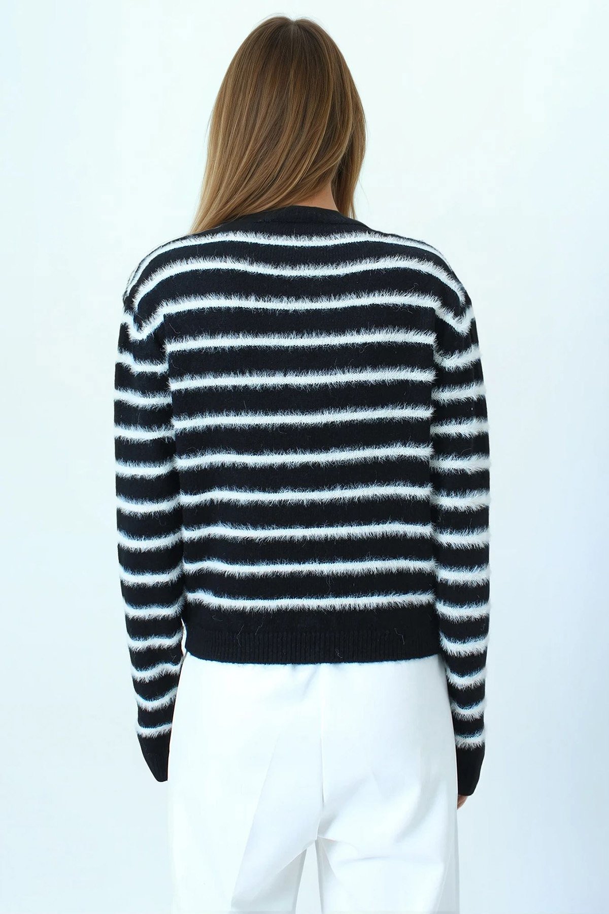 Çizgili Tüylü Dokulu Bisiklet Yaka Triko Kazak - SİYAH (VS01052)
