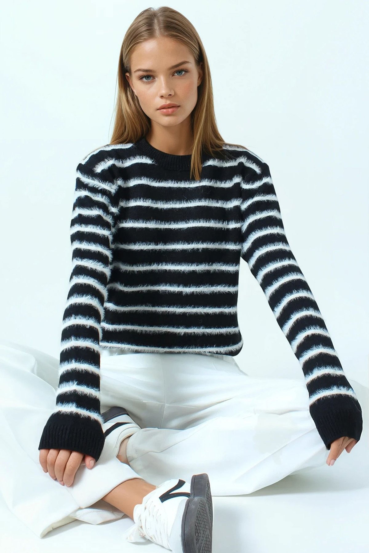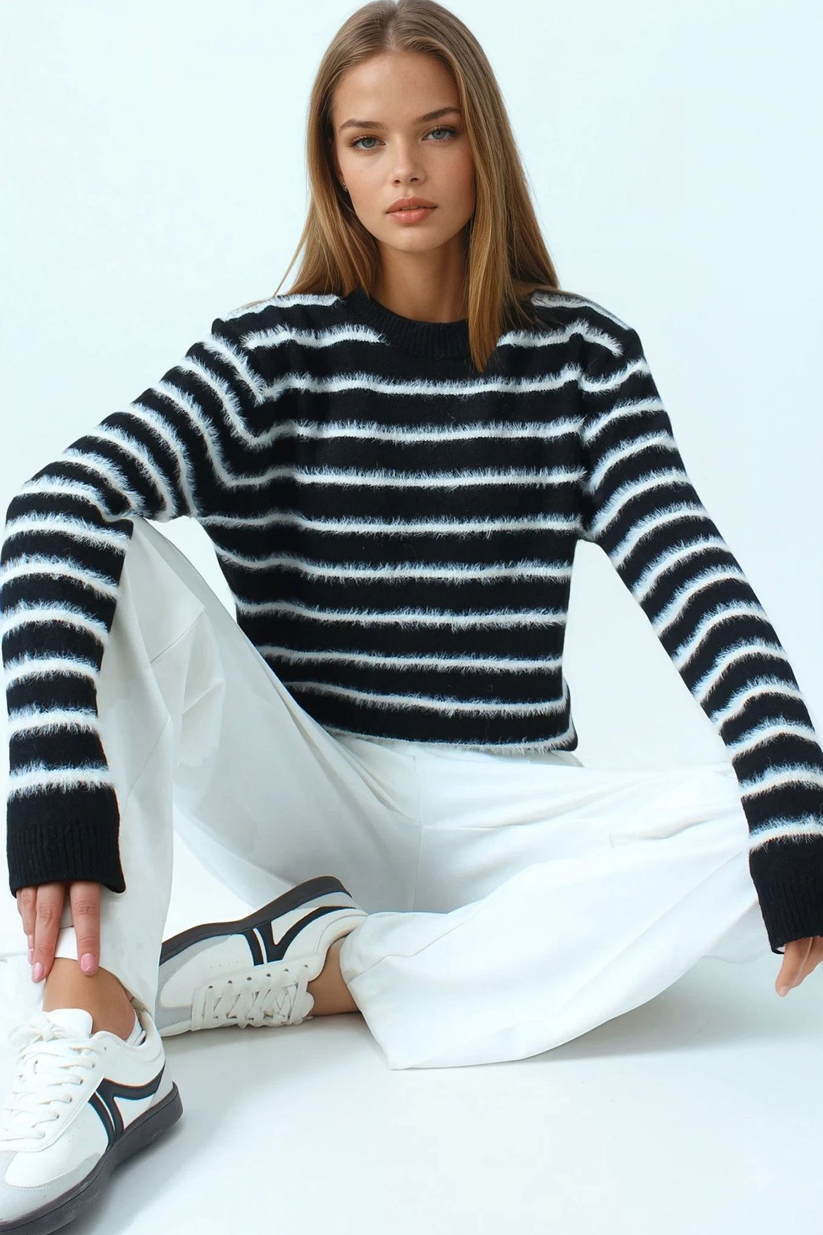 Çizgili Tüylü Dokulu Bisiklet Yaka Triko Kazak;Stüdyo Çekimlerinde Renkler Işık Farklılığından Dolayı Değişiklik Gösterebilir.;Manken Ölçüler: Boy: 1.67 Cm Göğüs: 75 Cm Bel: 62 Cm Kalça: 80 Cm Kilo: 45 Cm S/36/1 Beden