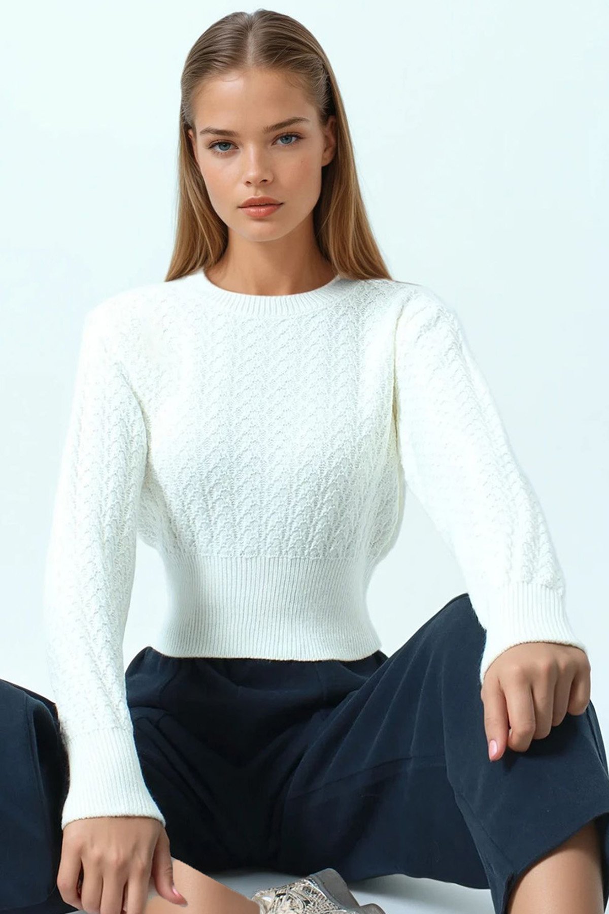 Desenli Bisiklet Yaka Uzun Kollu Triko Kazak - EKRU (VS01043)