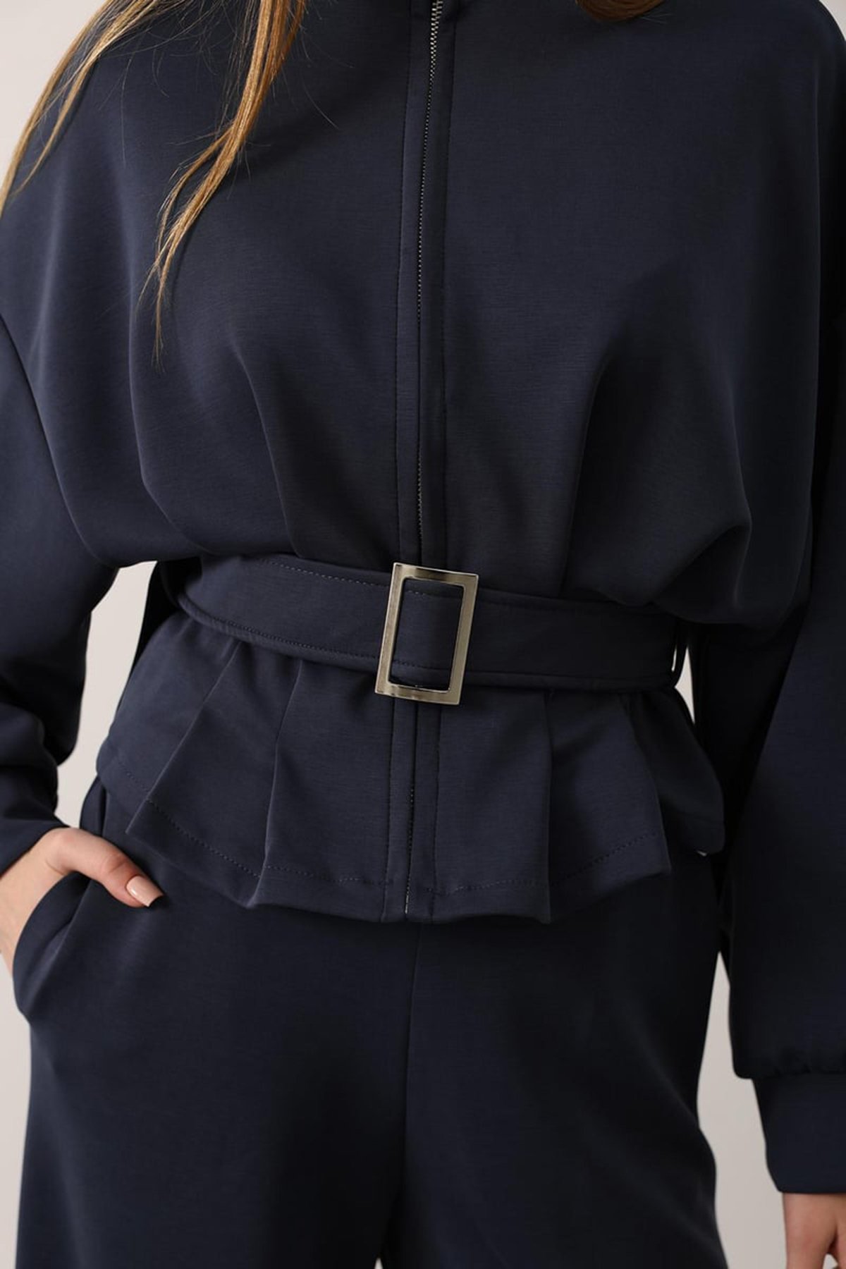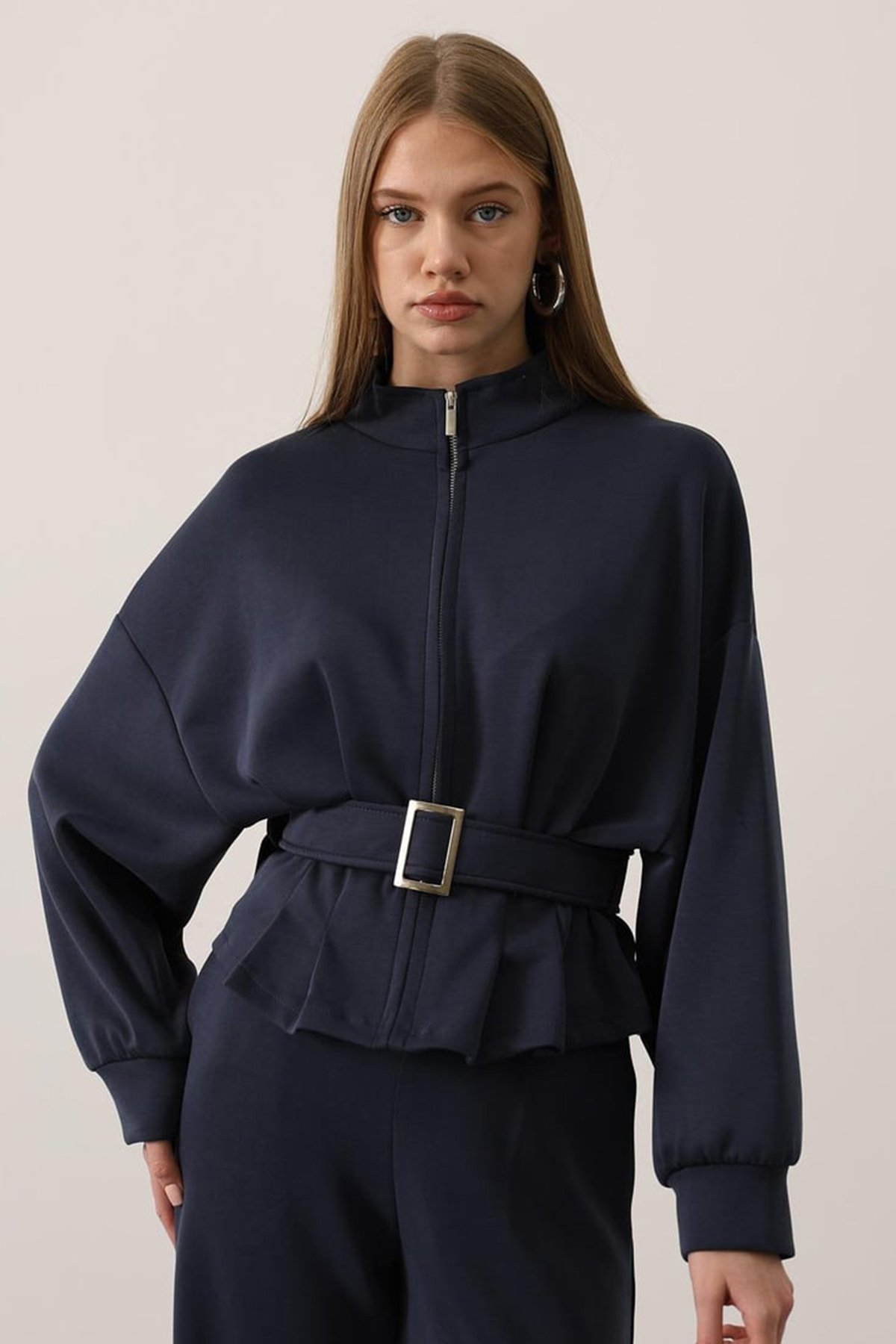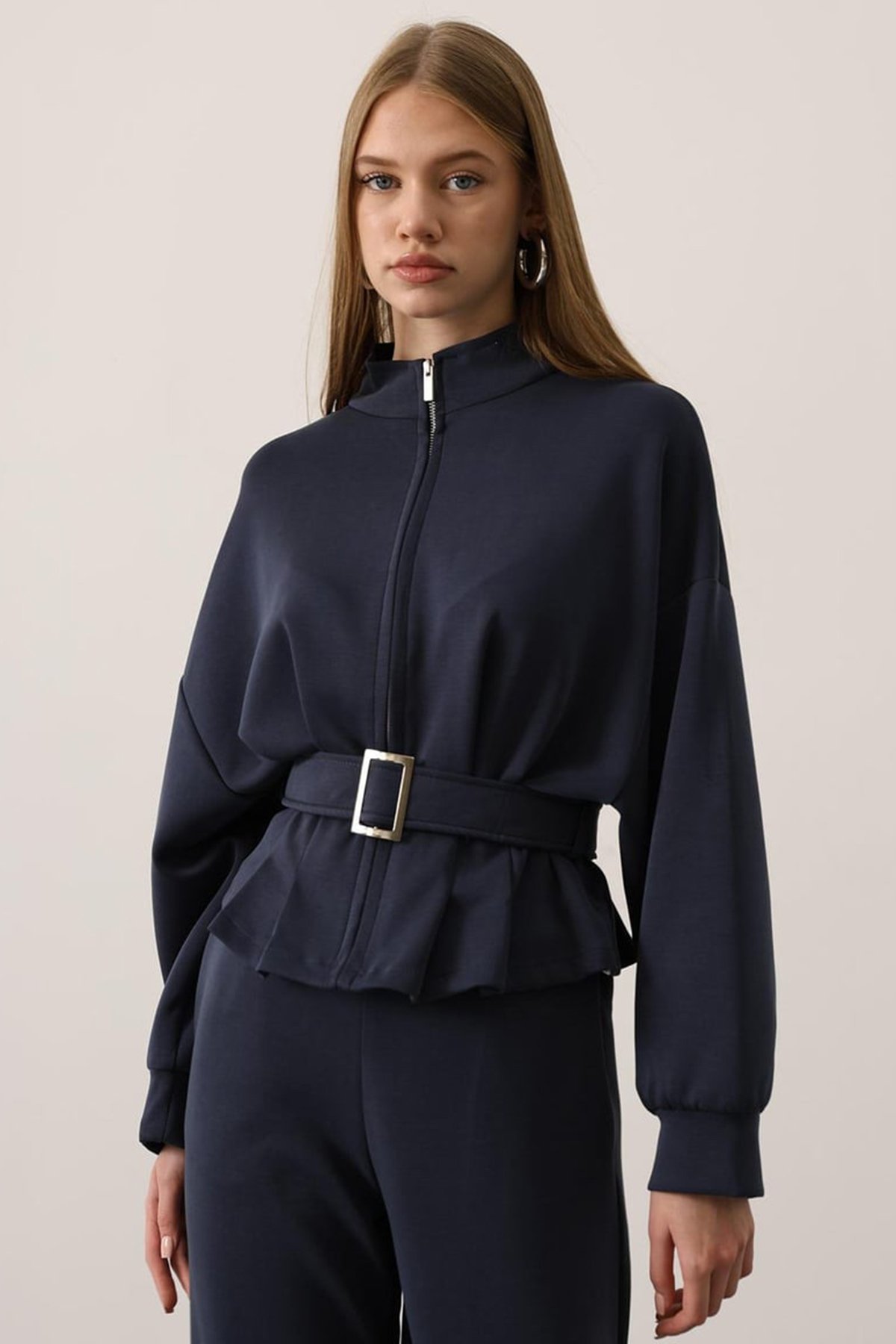 Fermuarlı Kemer Detaylı Dik Yaka Bluz - LACİVERT (VS01261)