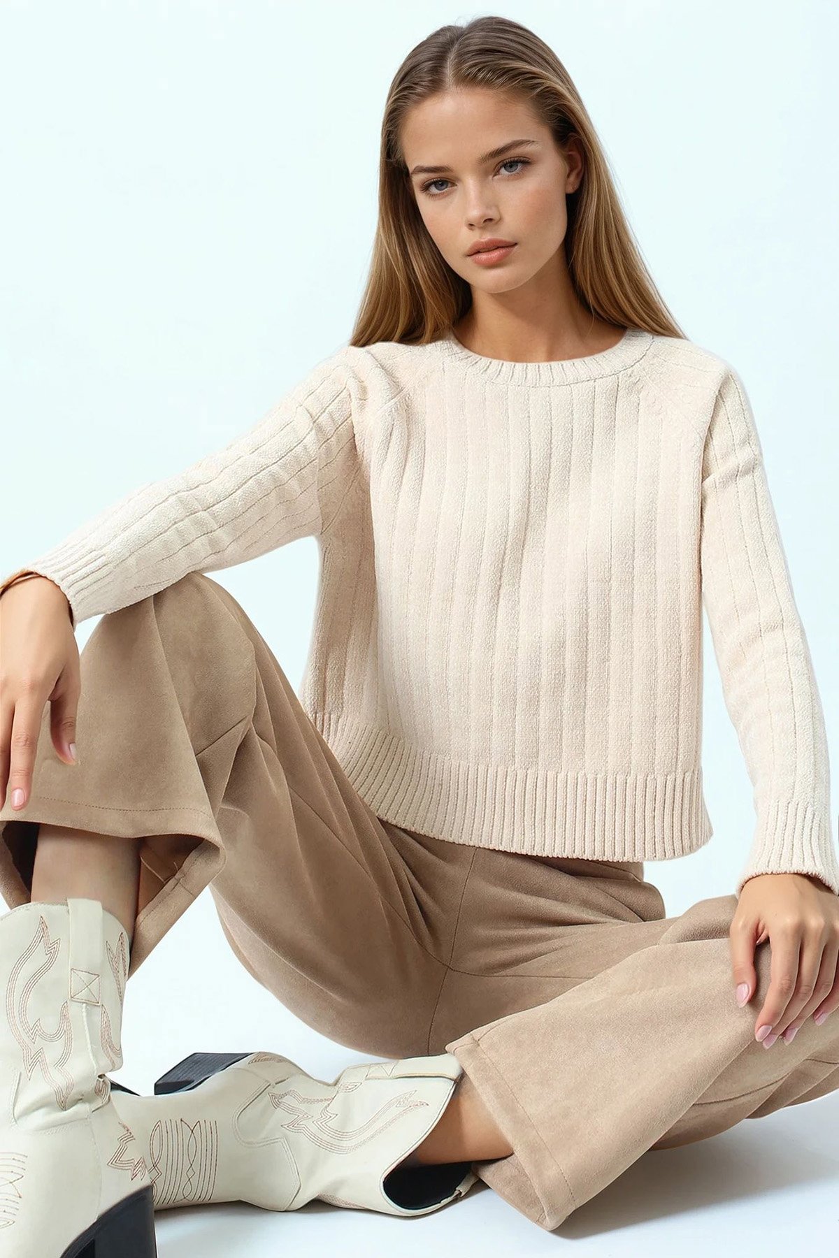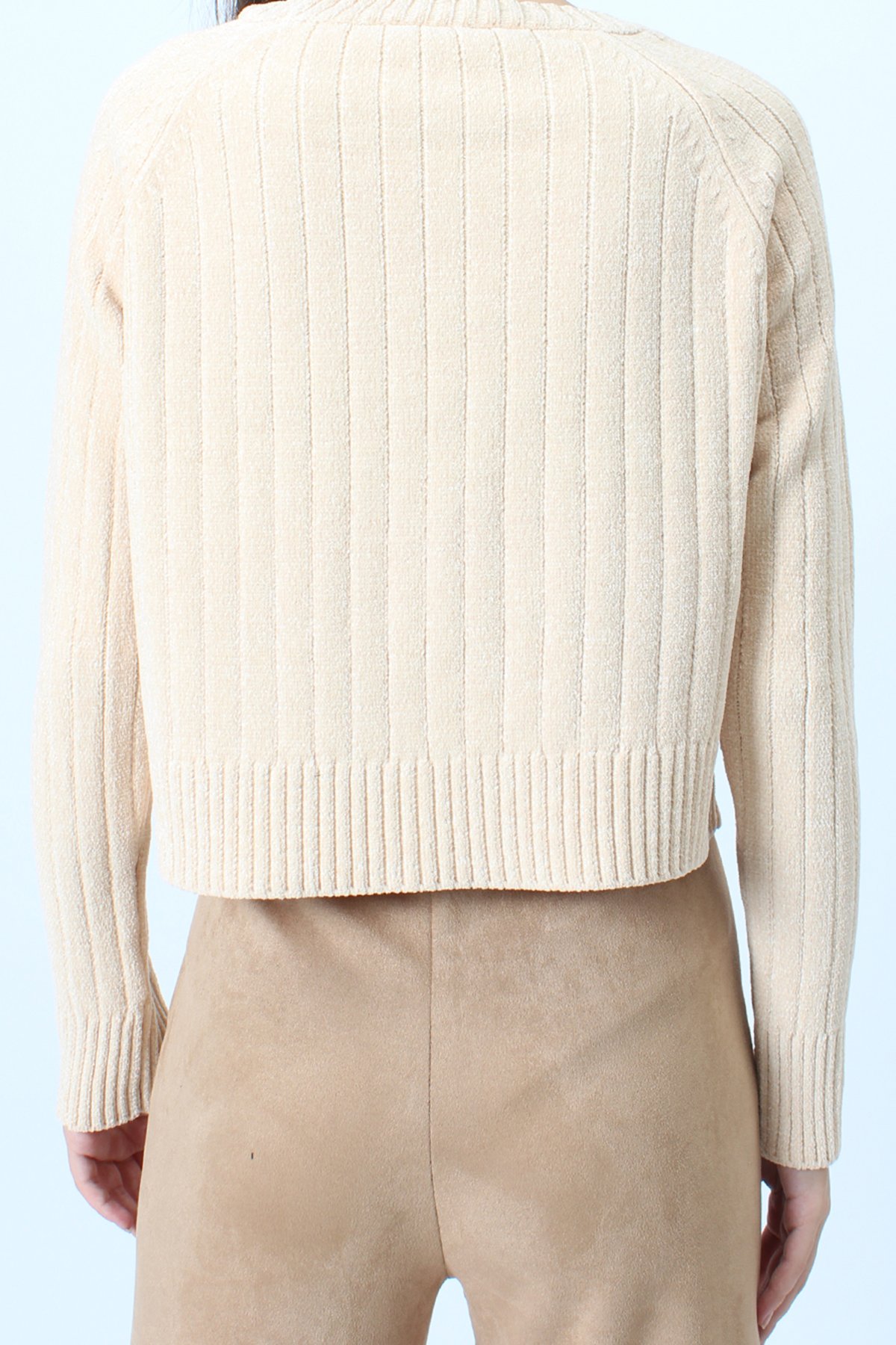 Fitilli Kadife Dokulu Bisiklet Yaka Uzun Kollu Triko Kazak - BEJ (VS01050)