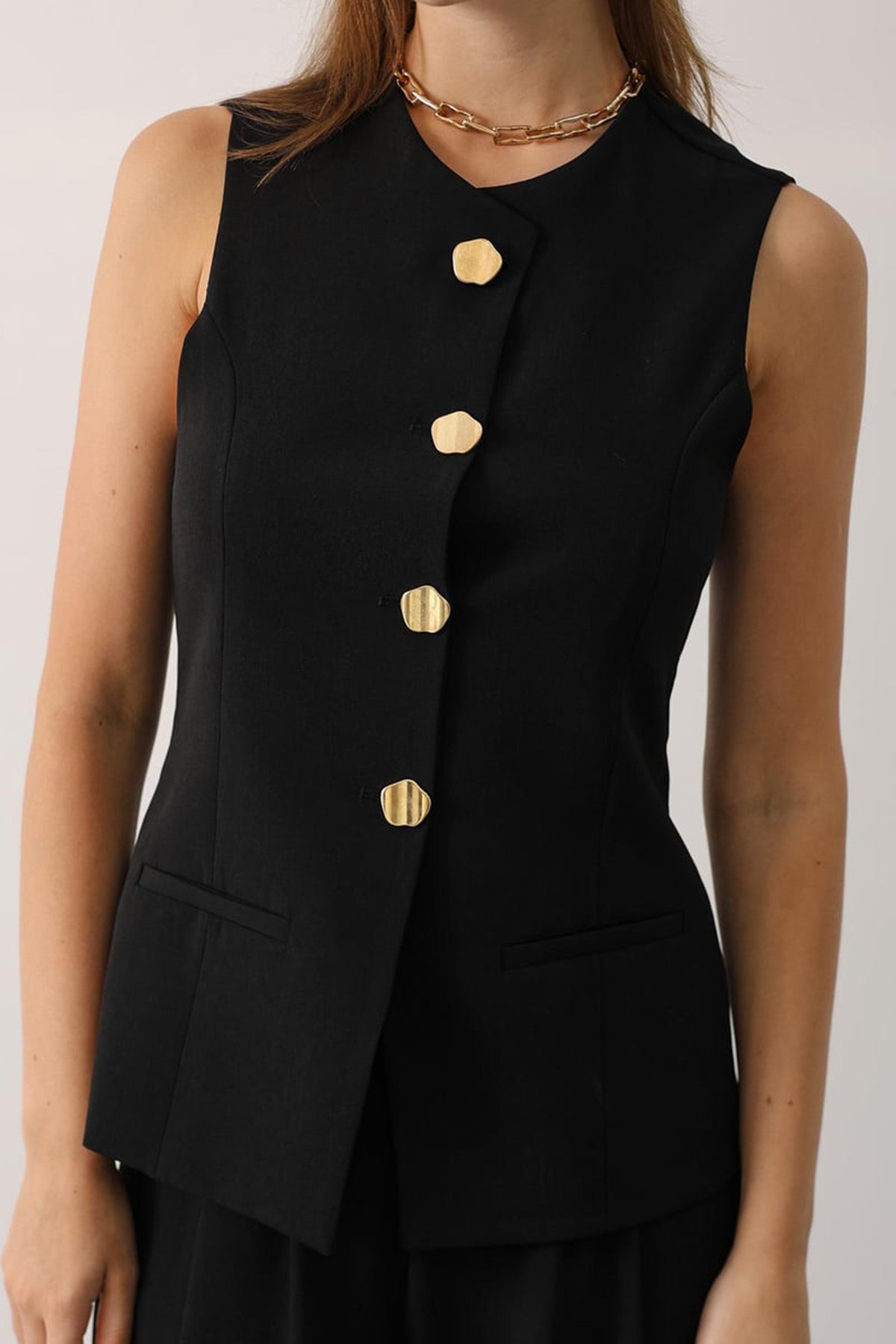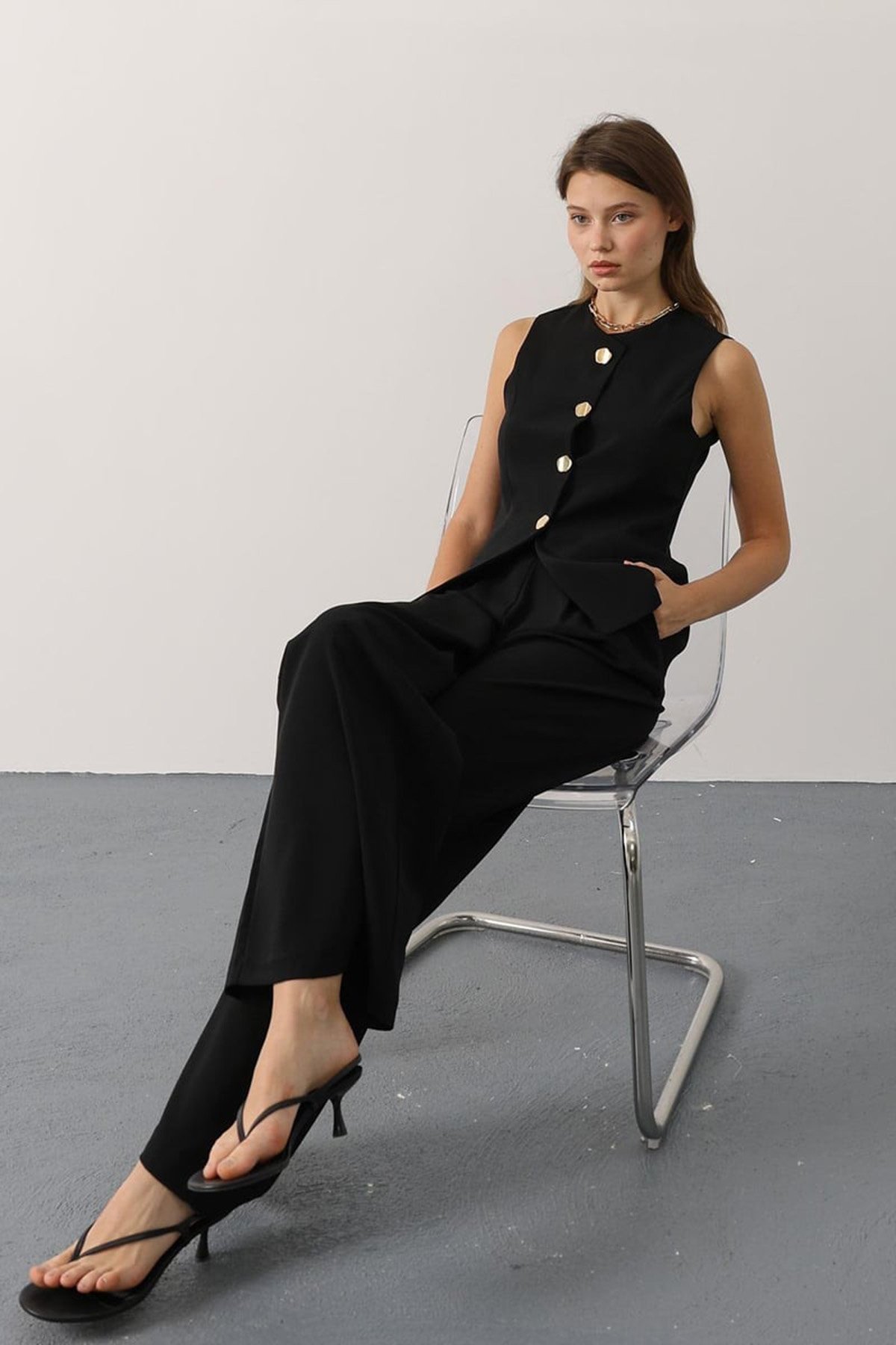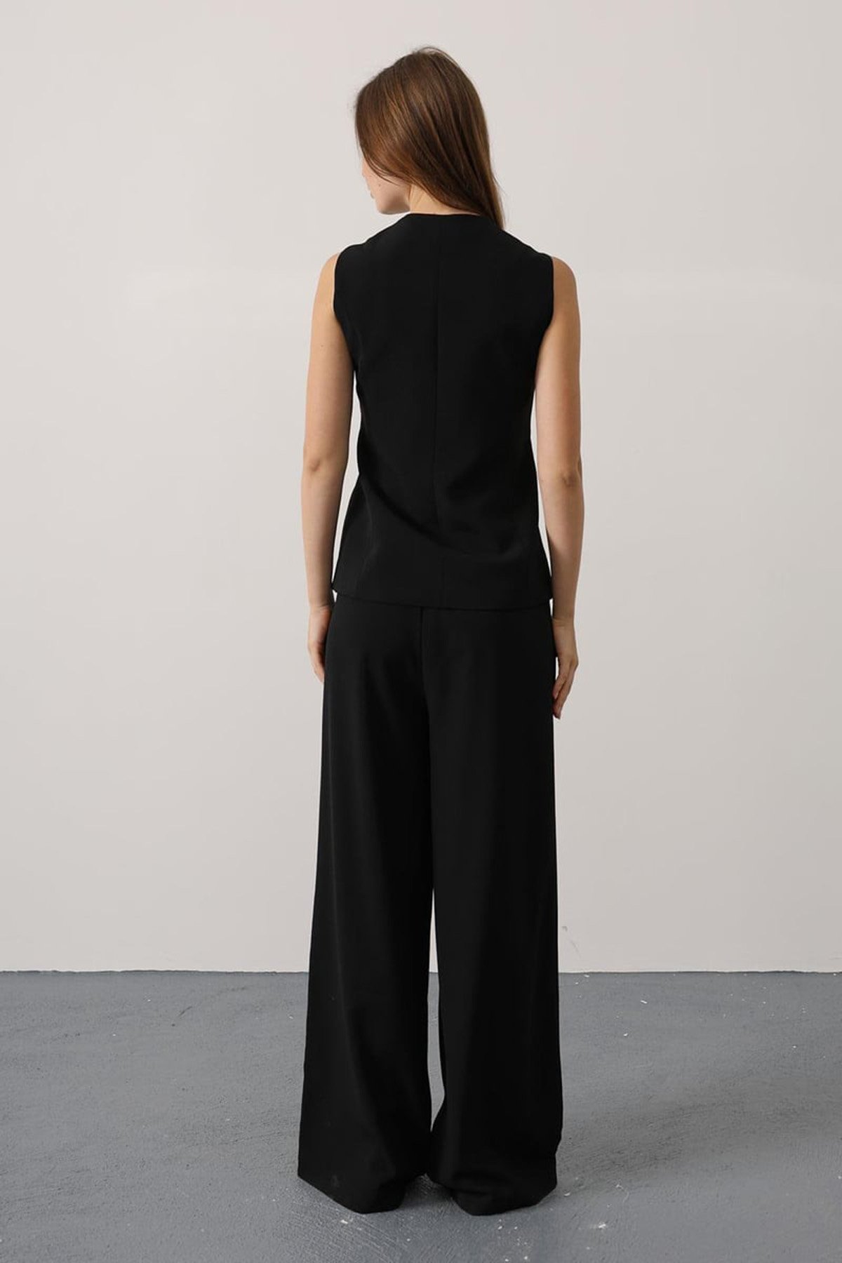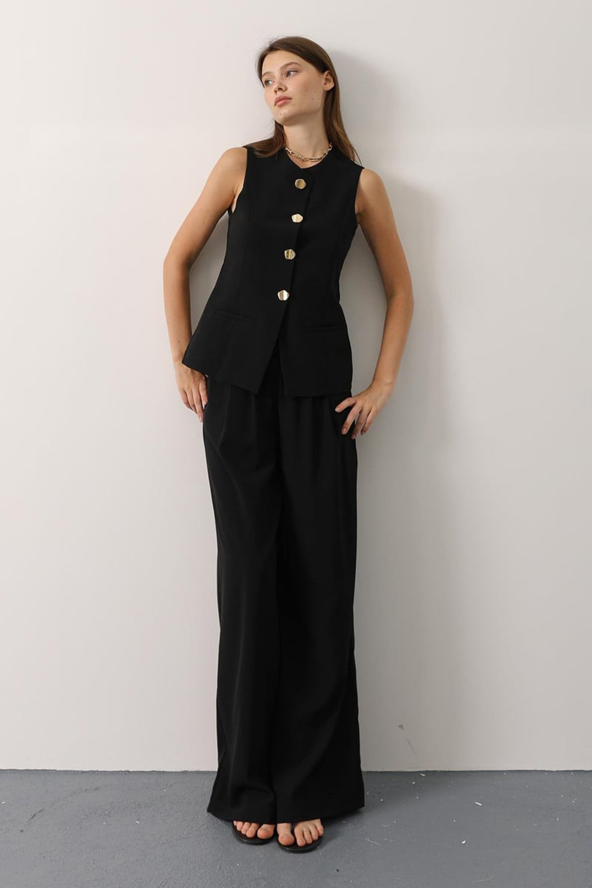 Gold Düğme Detaylı Yelek ve Pileli Palazzo Pantolon Takım - SİYAH (VS01148)