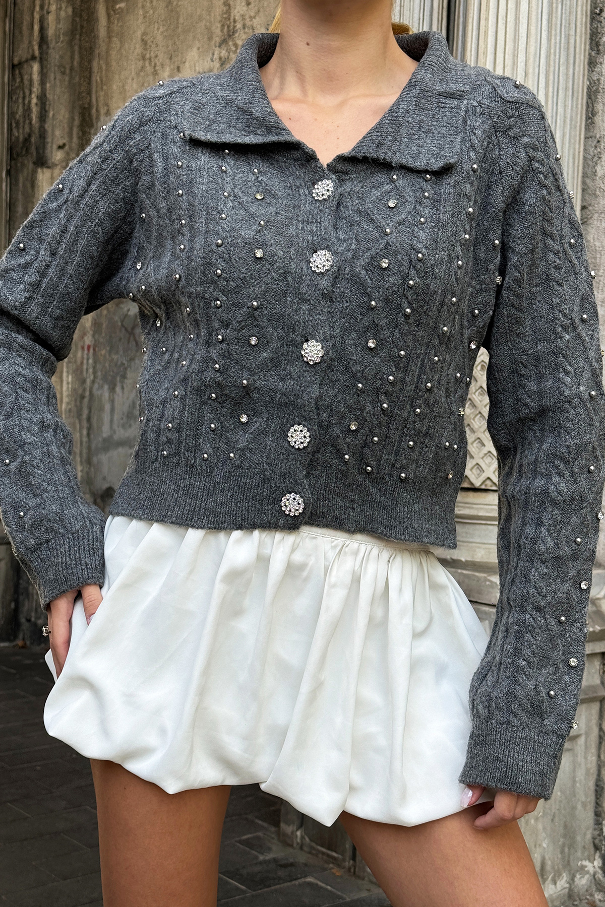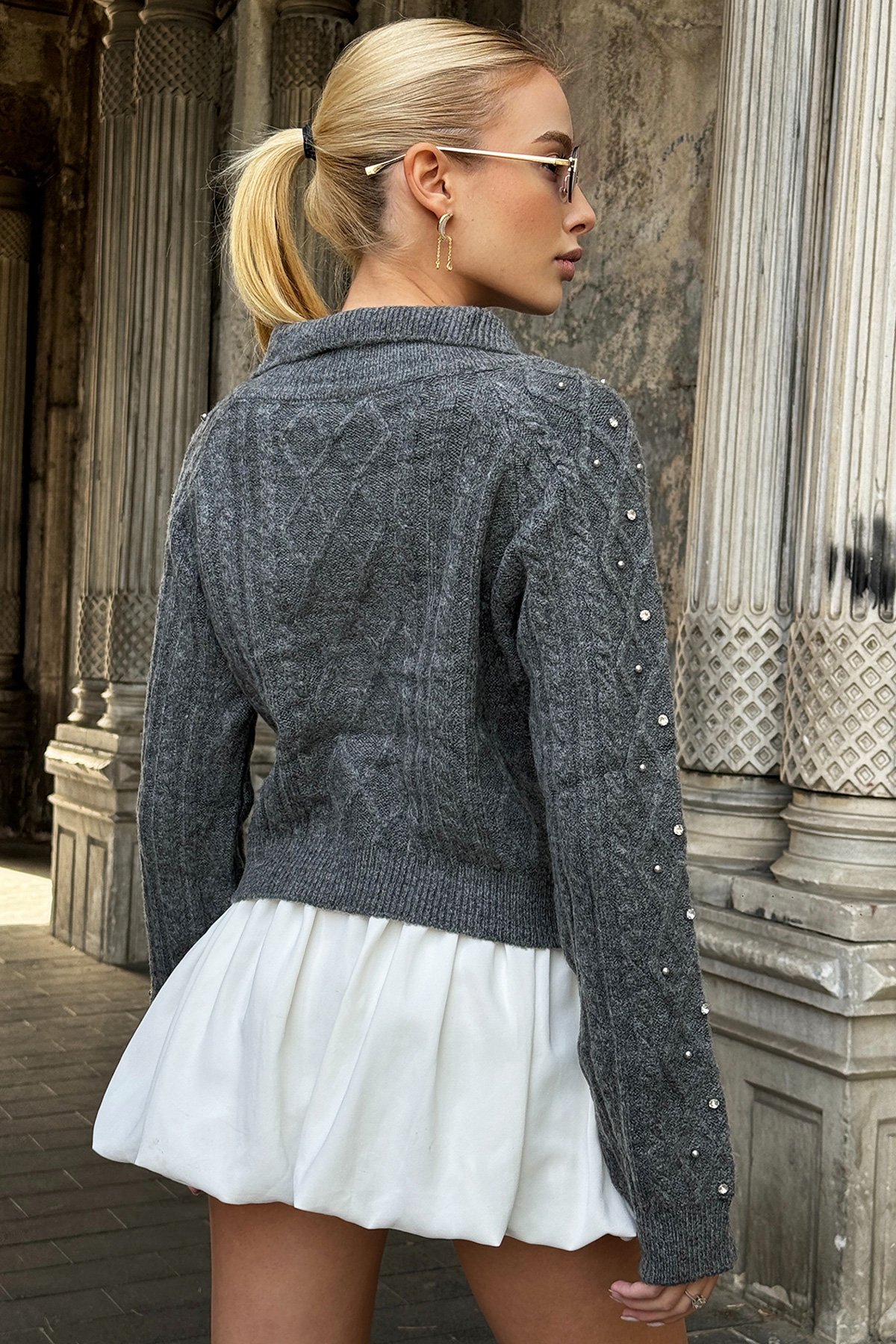 Kadın Antrasit İşlemeli Triko Hırka VS00005