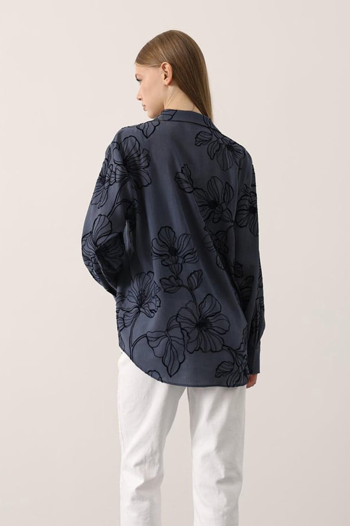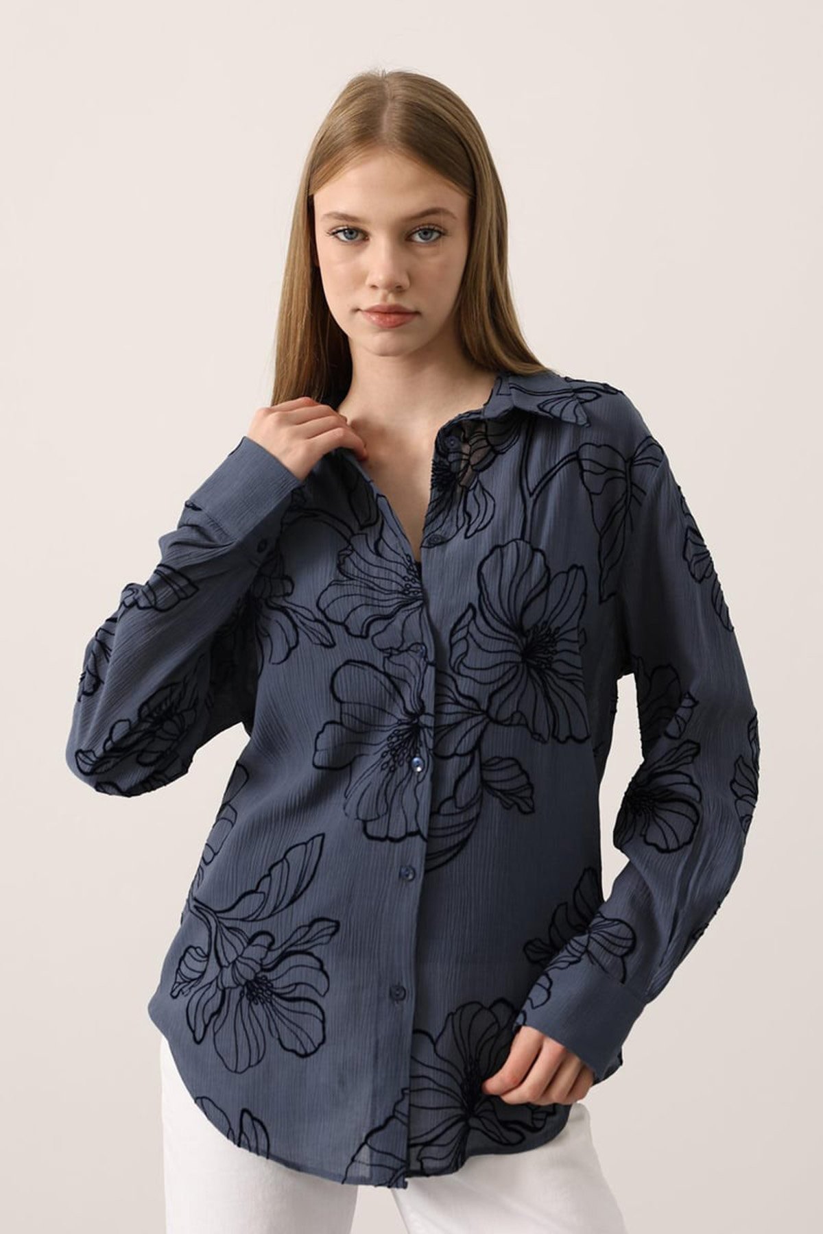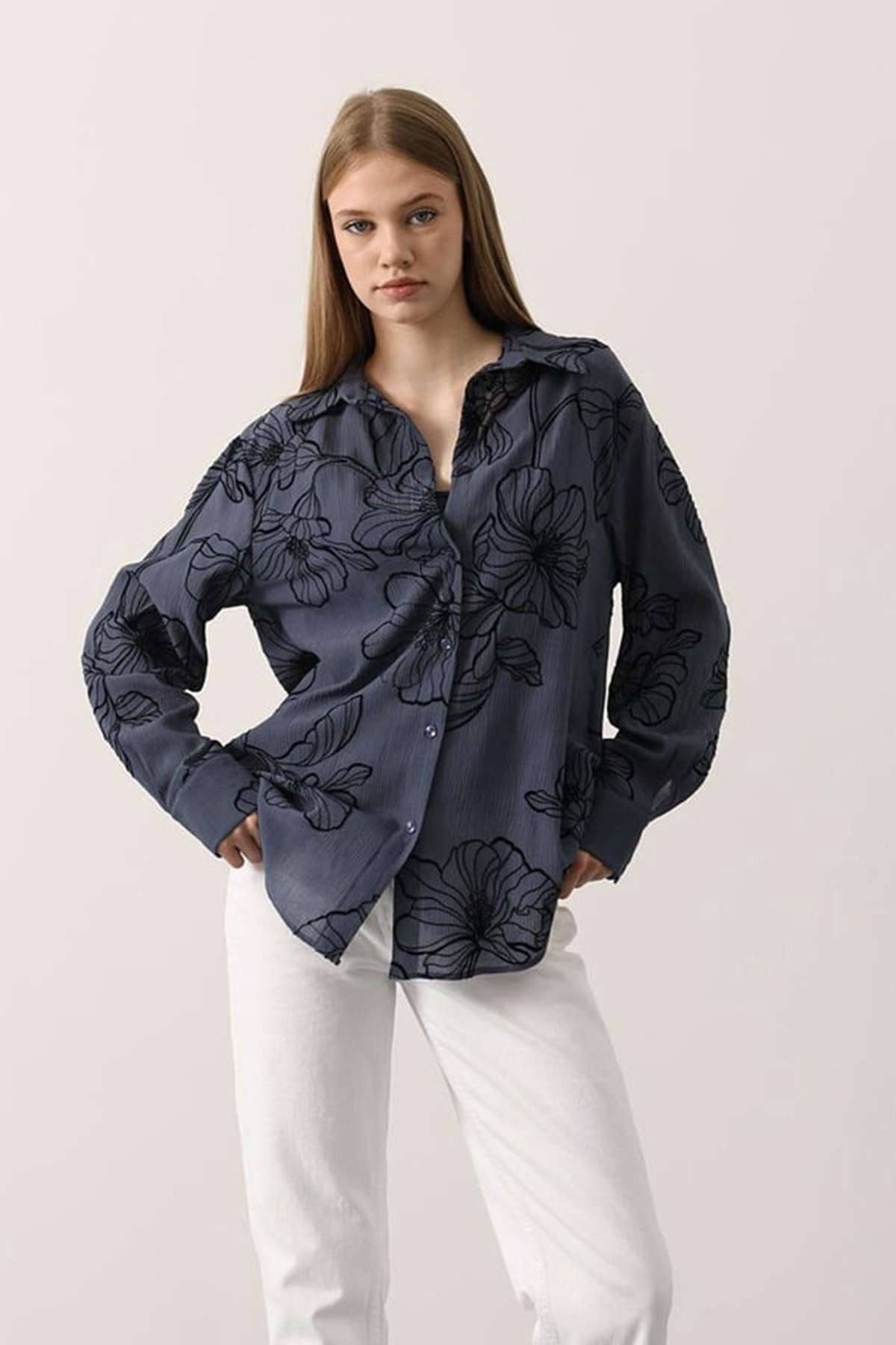 Kabartma Çiçek Desenli Dokulu Uzun Kollu Gömlek - SİYAH Kabartma Çiçek Desenli Dokulu Uzun Kollu Gömlek - LACİVERT