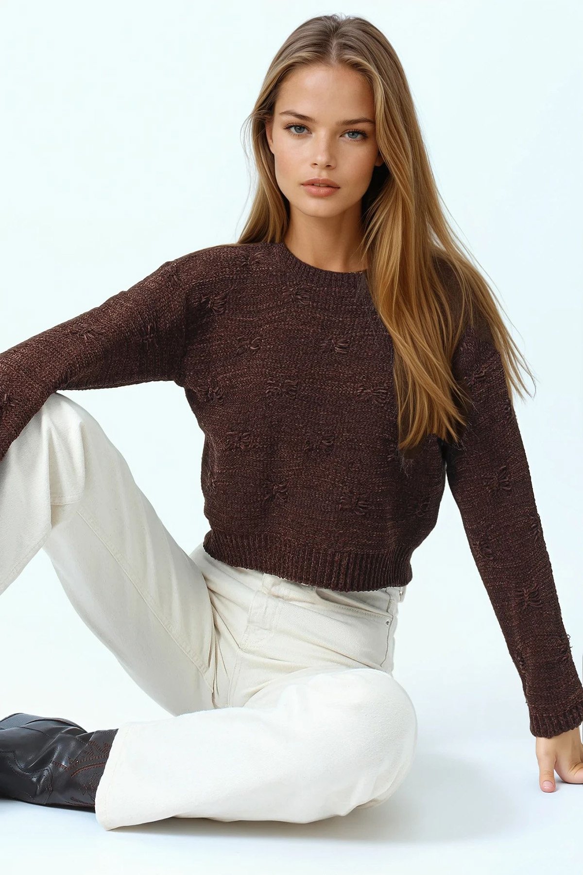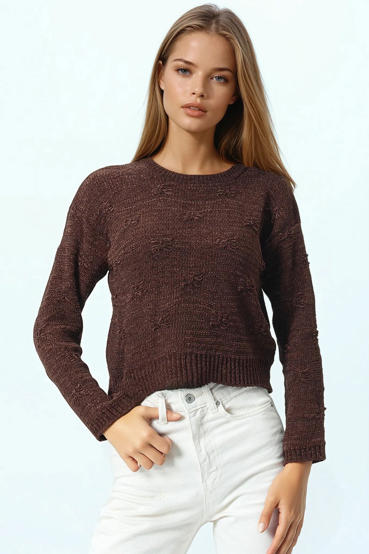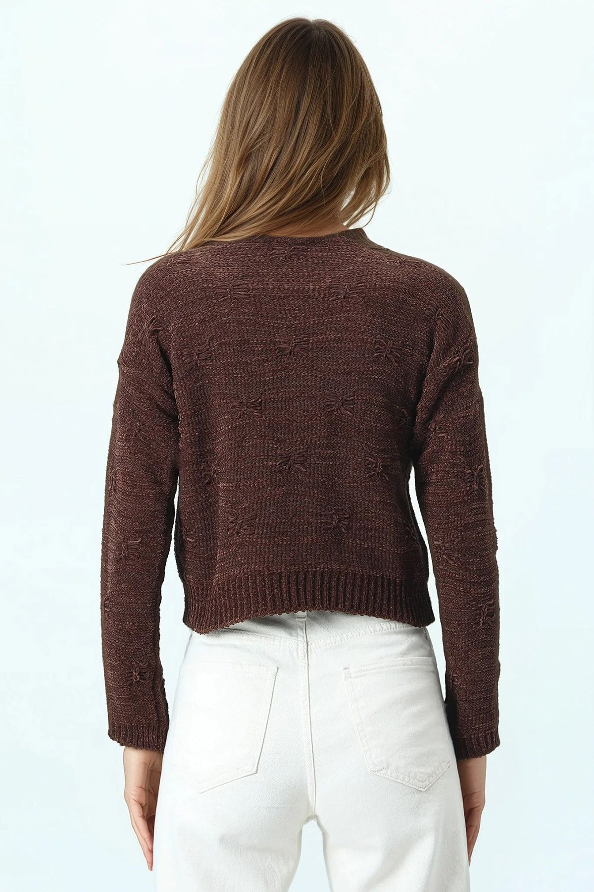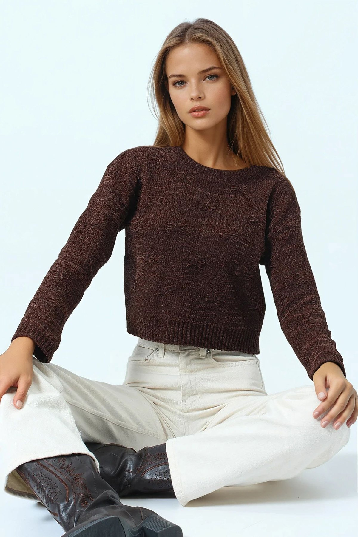 Kabartma Desenli Bisiklet Yaka Uzun Kollu Triko Kazak - KAHVERENGİ (VS01051)