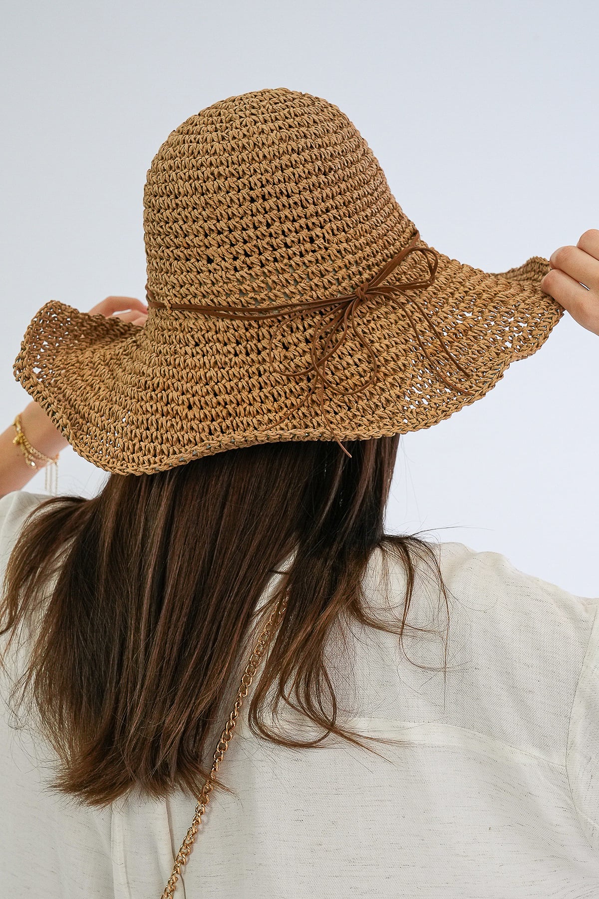 Kadın Camel Deri Fiyonklu Hasır Örme Plaj Şapka Alc-X15391 Kadın Bej Deri Fiyonklu Hasır Örme Plaj Şapka Alc-X15391