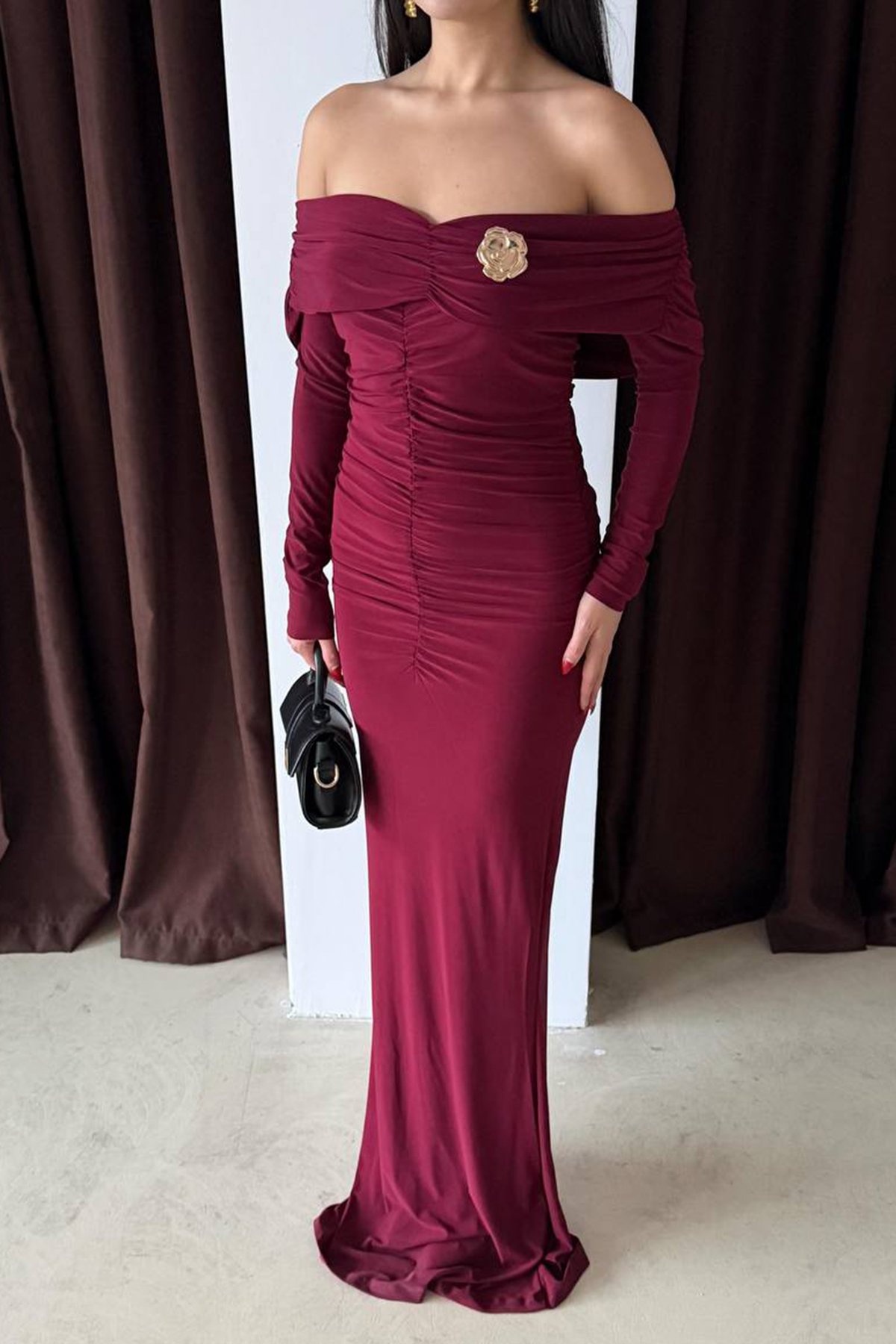 Kadın BORDO Madonna Yaka Drapeli Aksesuar Detaylı Maxi Boy Elbise VS01633 (VS01633)