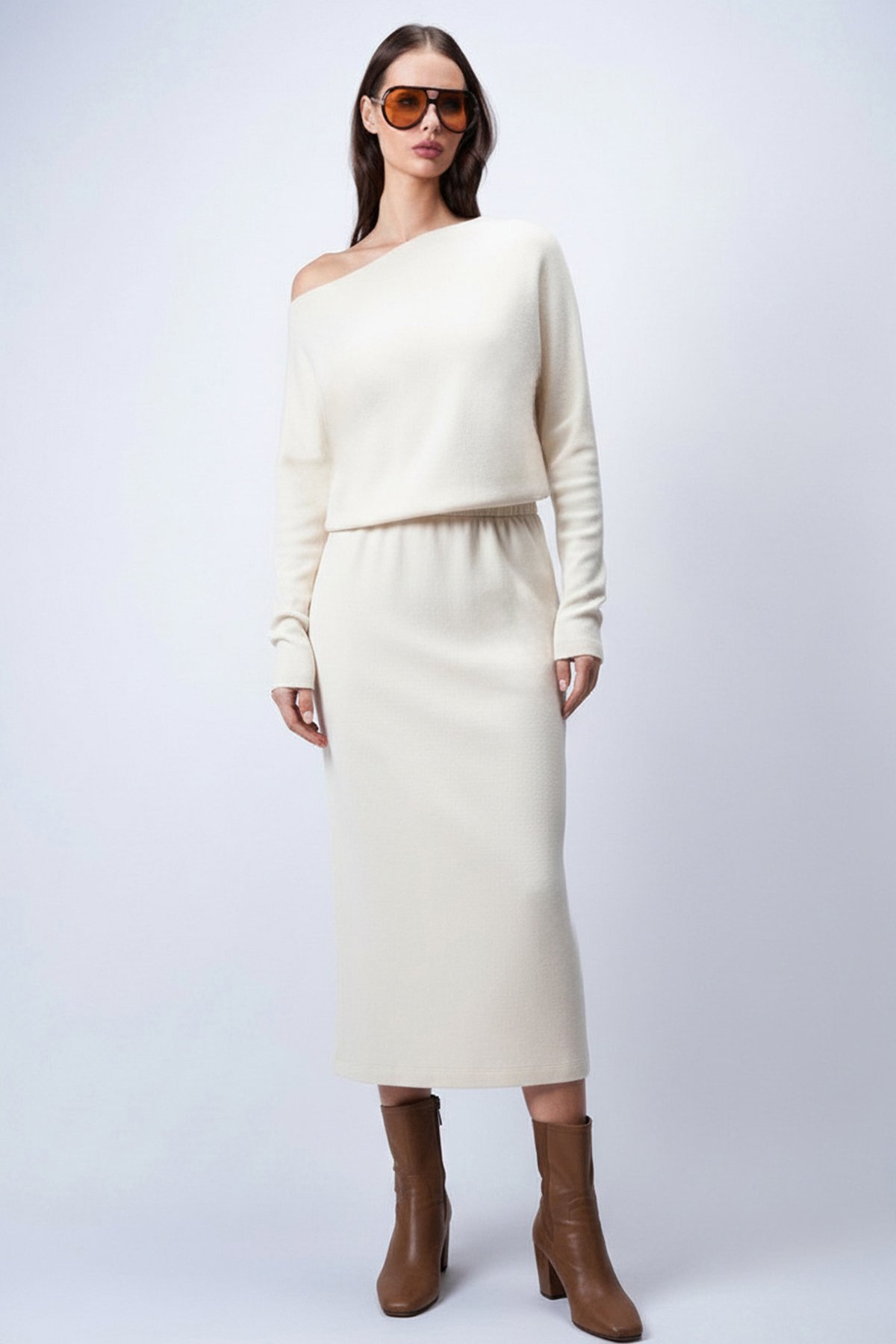 Kadın Ekru Kayık Yaka Beli Lastikli Midi Boy Elbise Alc-X15226 (ALC-X15226)