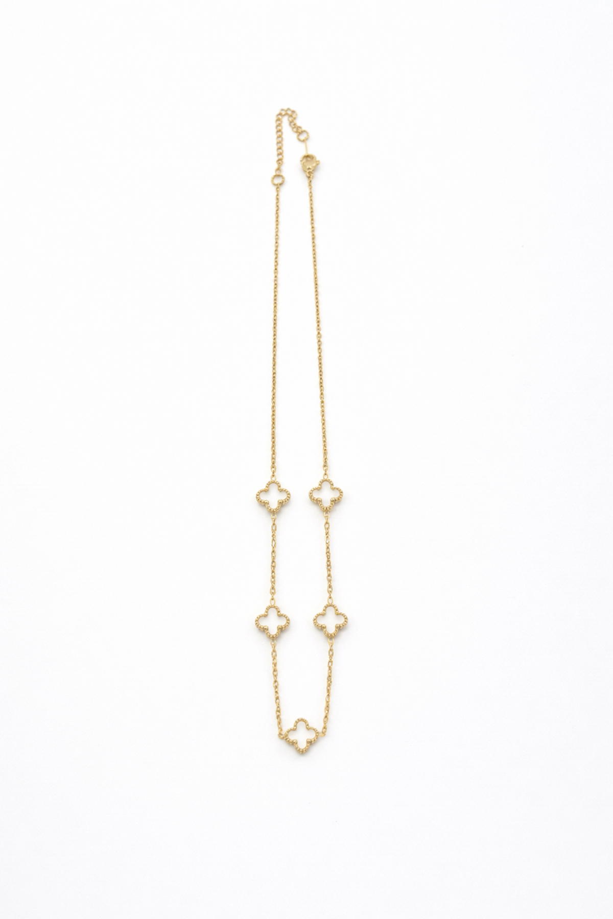 Zincir form üzerine eşit aralıklarla konumlandırılmış yonca figür detaylarıyla tasarlanan bu kolye, boyun hattında dengeli ve zarif bir görünüm oluşturur. İnce zincir yapısı hafif ve konforlu kullanım sağlarken, figür geçişleri tasarıma hareket katar. Ayarlanabilir arka zincir detayı farklı ölçülerde kullanım imkânı sunar. Kadın giyim kombinlerinde gömlek, elbise ve basic üstlerle birlikte tamamlayıcı bir aksesuar olarak öne çıkar. Gardırobunuzda uzun süre yerini koruyacak, zamansız bir alternatif olarak öne çıkar.Sezonun enerjisini yansıtan tasarımıyla öne çıkar ve sezon boyunca rahat bir kullanım sunarak pratik bir seçenek oluşturur.