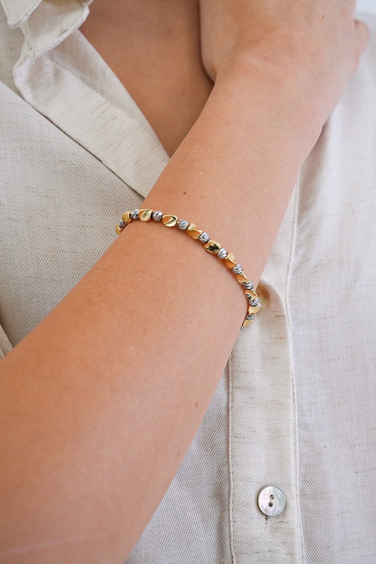Alternatif renk tonlarında metal boncuk detaylarıyla tasarlanan bu bileklik, iki farklı tonun dengeli geçişi sayesinde modern ve hareketli bir görünüm sunar. Oval ve küre formdaki ara parçalar tasarıma ritim kazandırırken, esnek yapısı bileğe uyumlu ve konforlu kullanım sağlar. Günlük ve klasik kombinlerle kolayca bütünleşen sade formu ile öne çıkar. Kadın giyim stilinde tamamlayıcı bir aksesuar olarak tercih edilebilir. Gardırobunuzda uzun süre yerini koruyacak, zamansız bir alternatif olarak öne çıkar.Sezonun enerjisini yansıtan tasarımıyla öne çıkar ve sezon boyunca rahat bir kullanım sunarak pratik bir seçenek oluşturur.