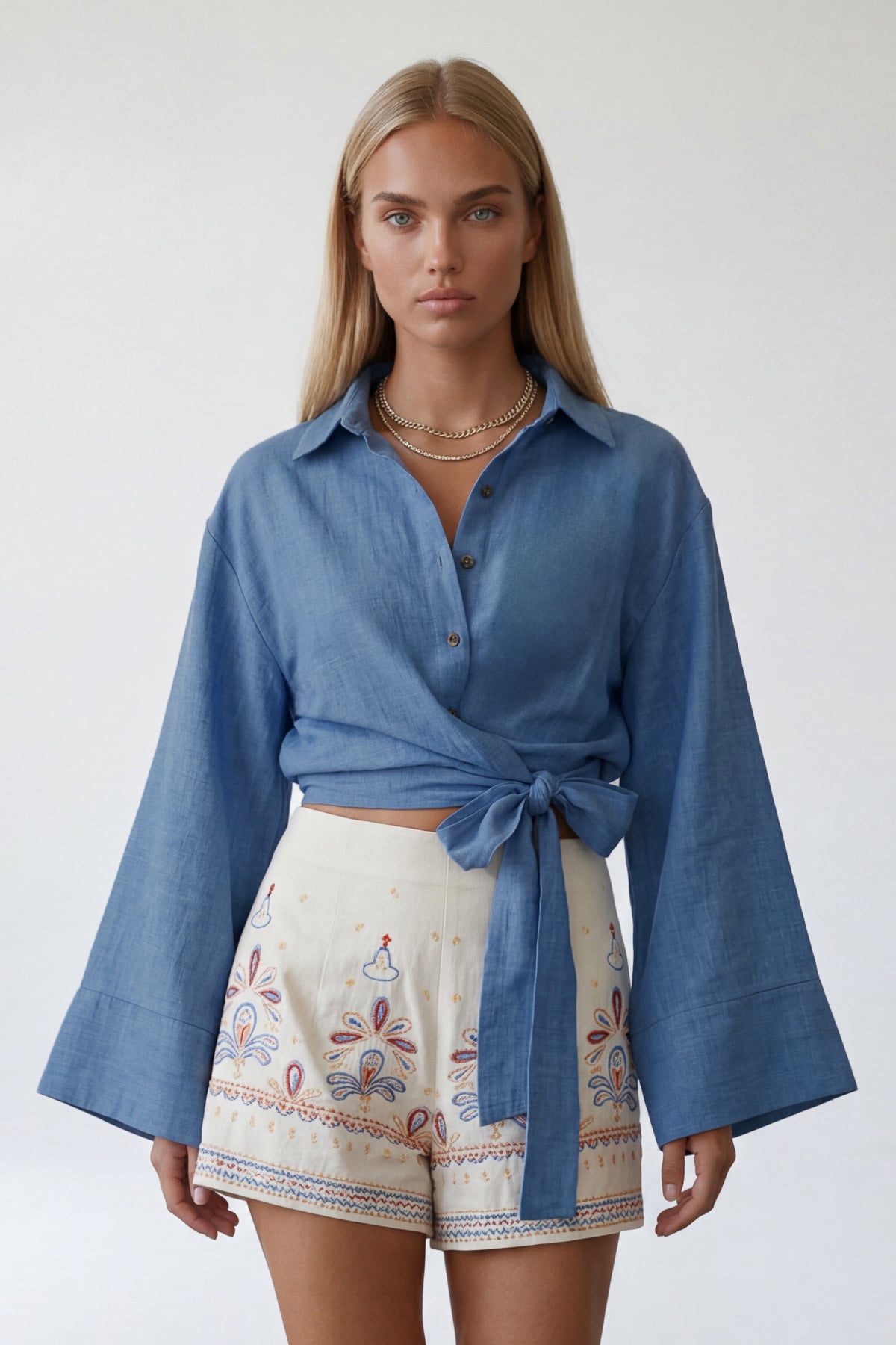 Önü bağlamalı tasarımıyla dikkat çeken bu keten gömlek, geniş manşetli kollarıyla modern bir görünüm sunar. Hafif dokusu konforlu kullanım sağlar. Gardırobunuzda yaz kombinlerinde öne çıkan bir gömlek olarak uzun süre kullanılabilir.