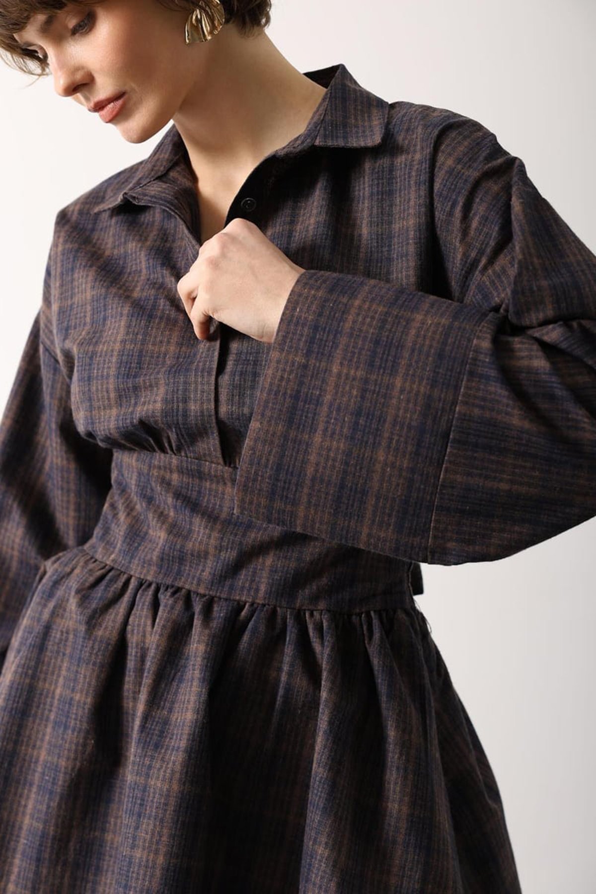 Kadın Kahve-Mavi Gömlek Yaka Geniş Manşetli Bağlama Detayli Mini Dokuma Elbise Alc-X15204 (ALC-X15204)