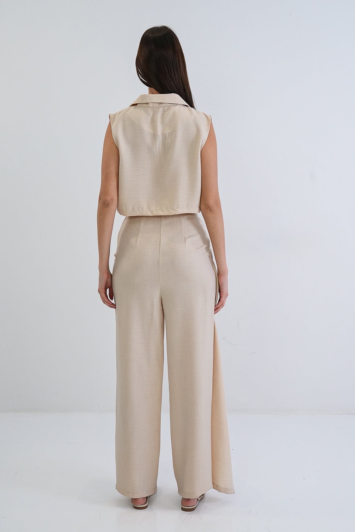 Kadın Krem Keten Yelek Ve Anvelop Kesim Yüksek Bel Fermuarlı Pantolon Takım Alc-X15300 (ALC-X15300)