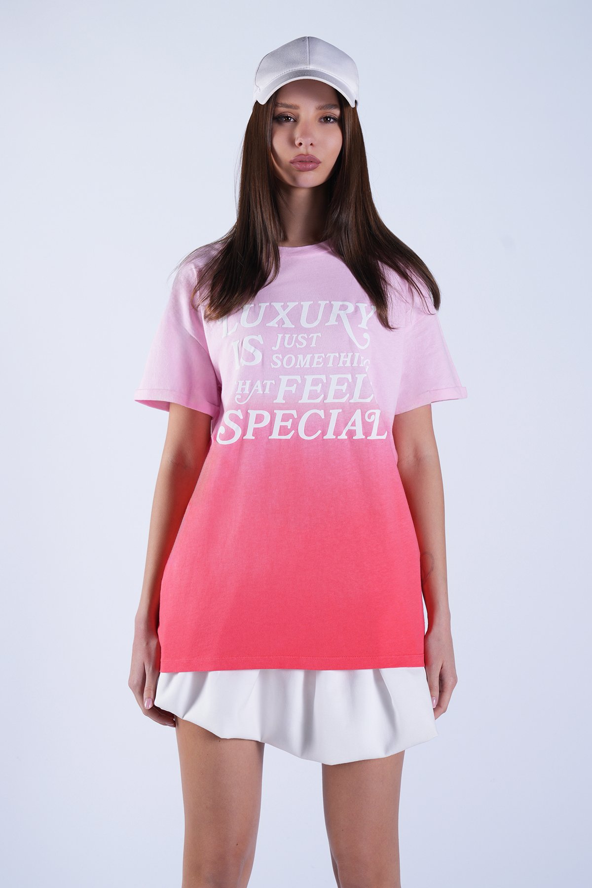 Kadın Pembe Bisiklet Yaka Kabartma Baskılı Renk Geçişli T-Shirt Alc-X15103 (ALC-X15103)
