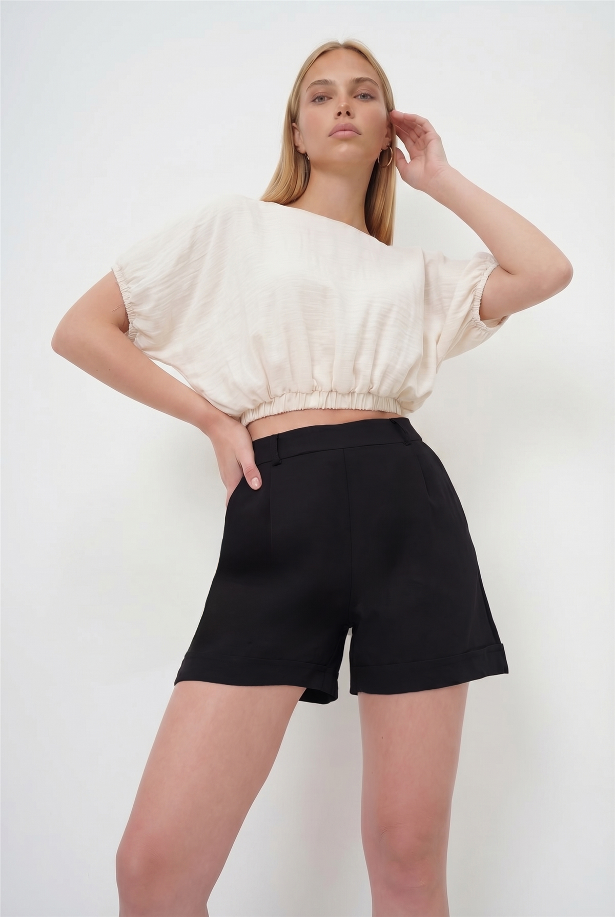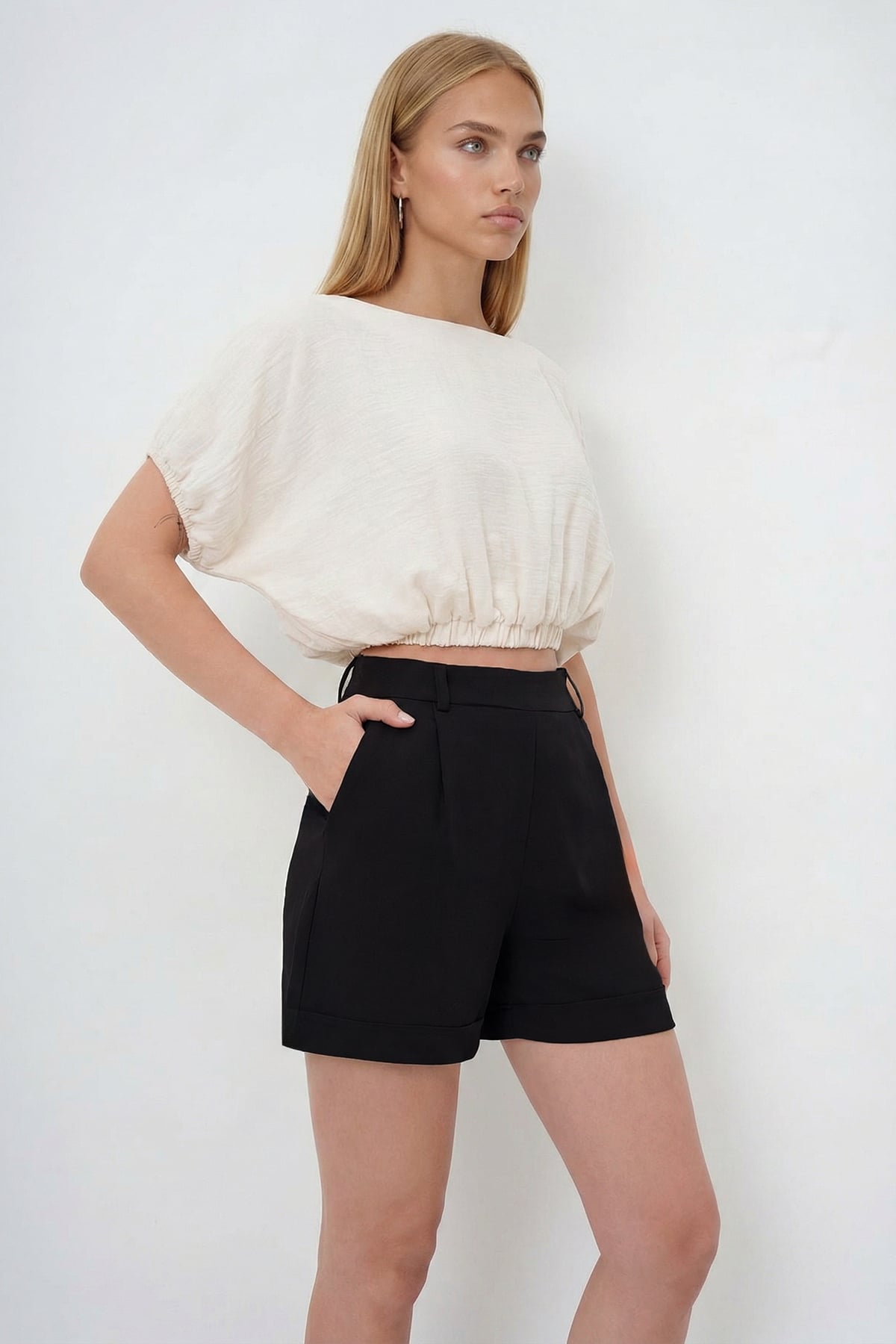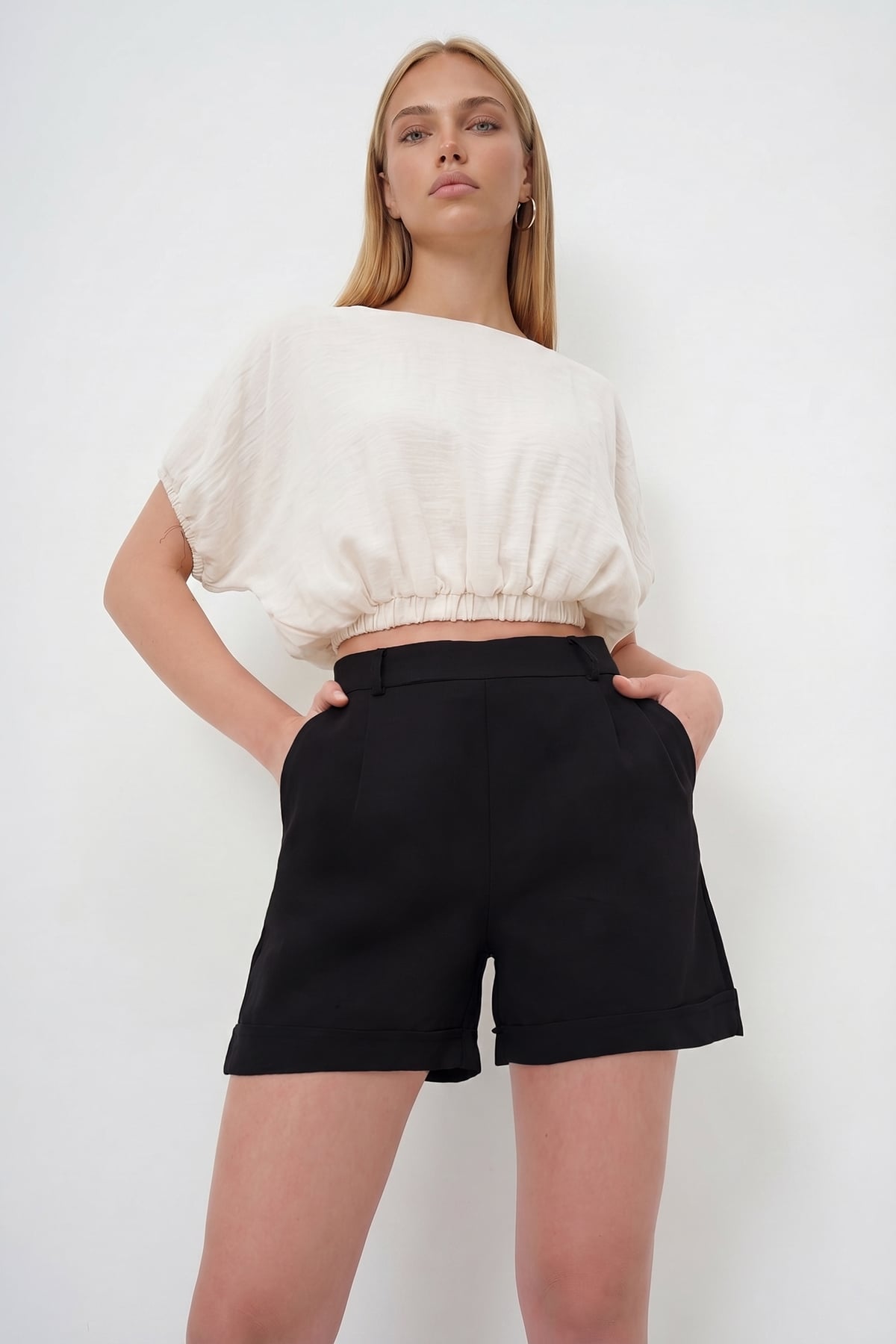 Kadın Siyah-1 Çift Cepli Duble Paça Gizli Fermuarlı Keten Şort Alc-X13767 (ALC-X13767)