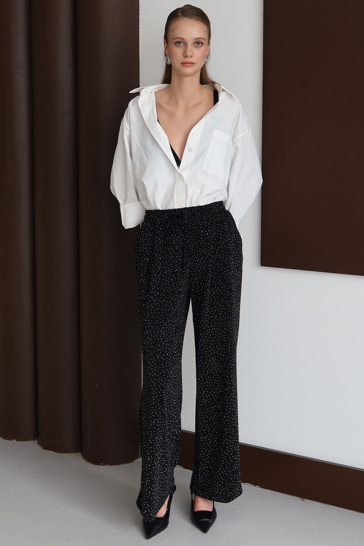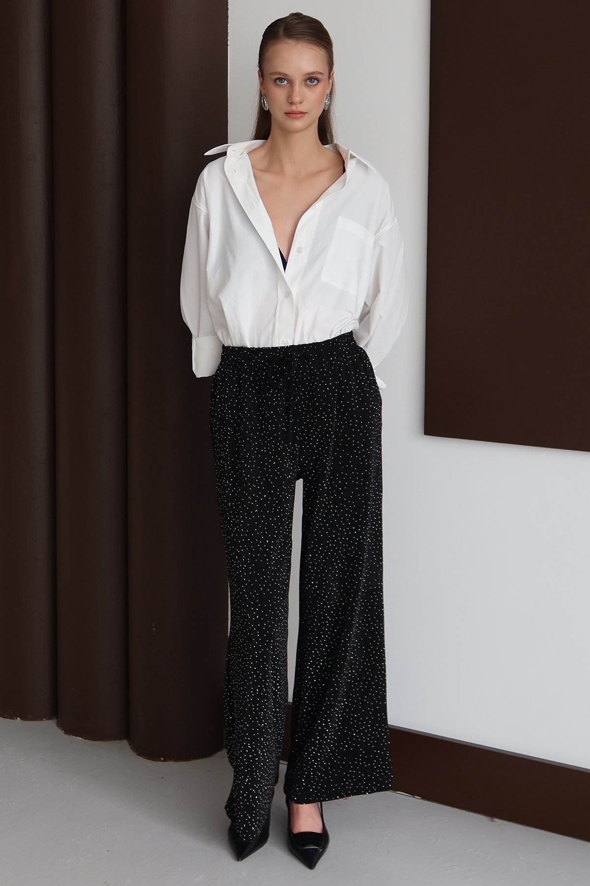 Kadın SİYAH Bağcıklı Çift Cepli Taş İşlemeli Palazzo Pantolon VS01434