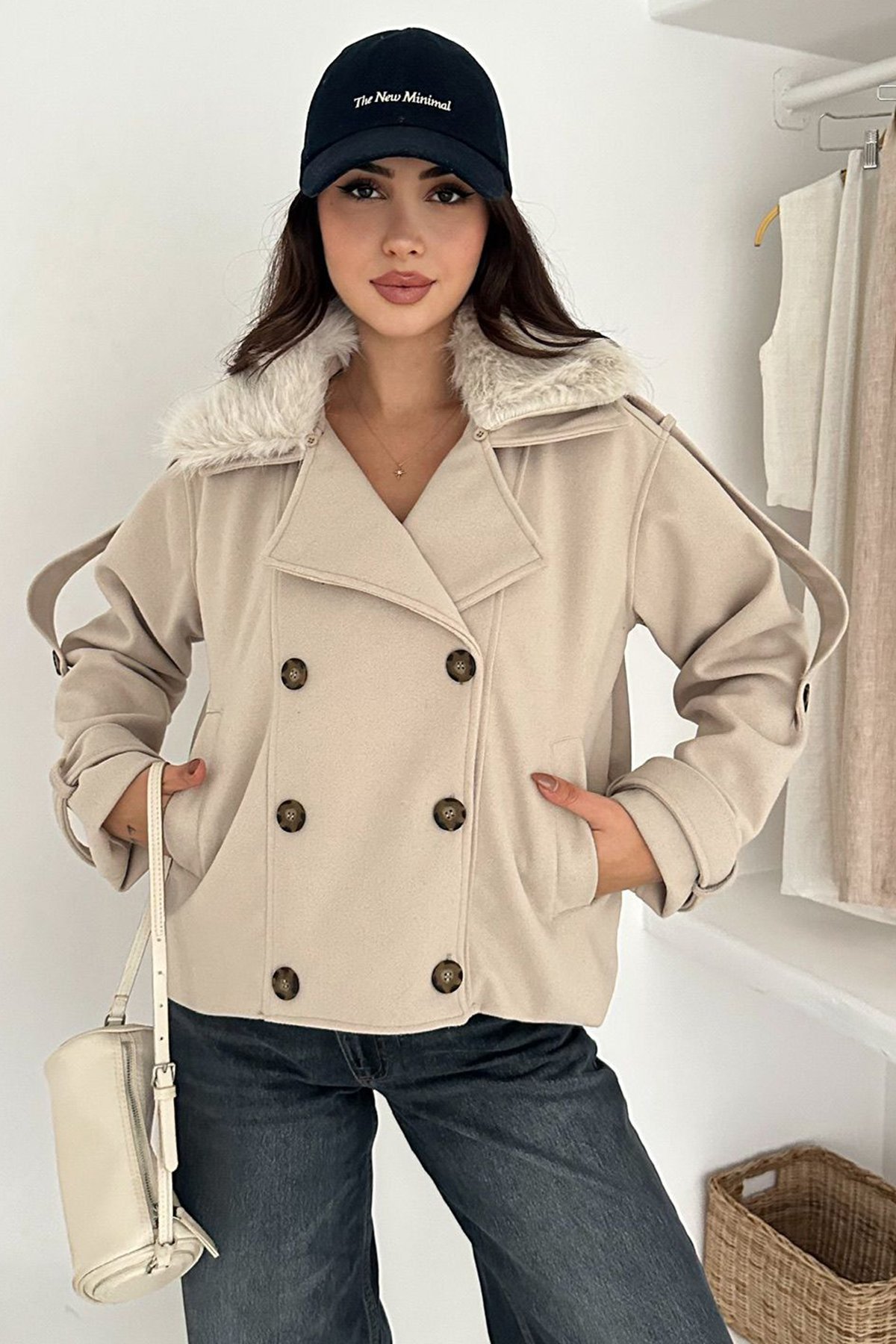 Kadın Taş Düğmeli Kol Detaylı Kürk Yaka Kaşe Astarlı Kaban VS01573 (VS01573)