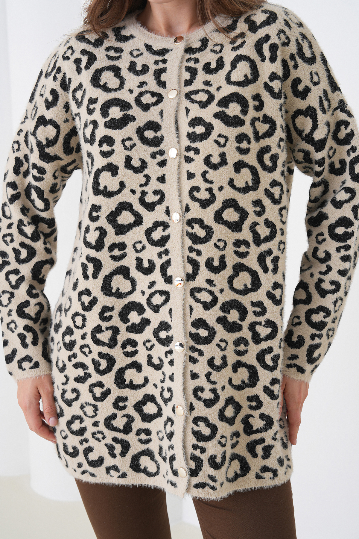 Kadın TAŞ Leopar Desenli Düğmeli Yumoş Triko Hırka VS01446 Kadın BEJ Leopar Desenli Düğmeli Yumoş Triko Hırka VS01446