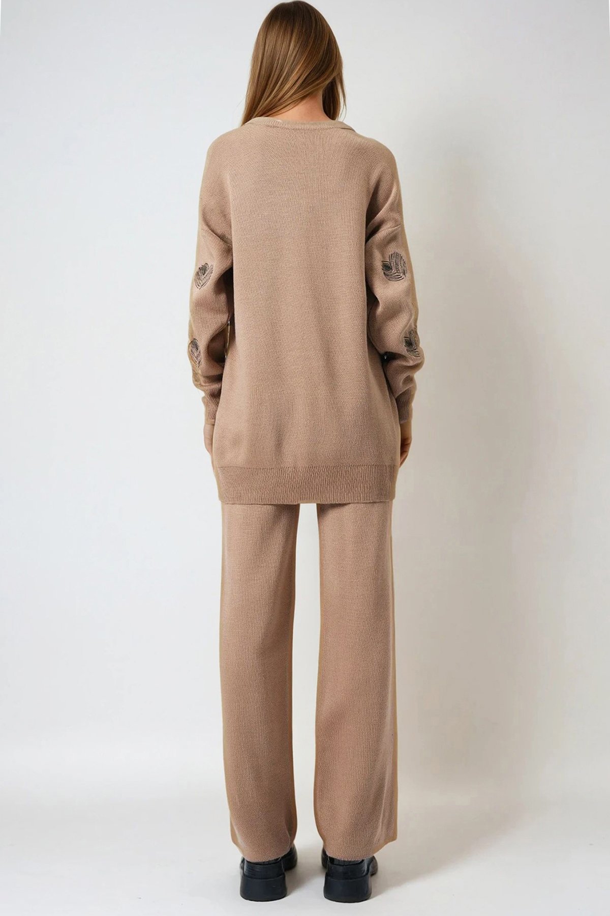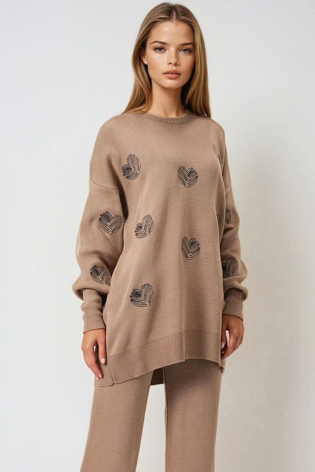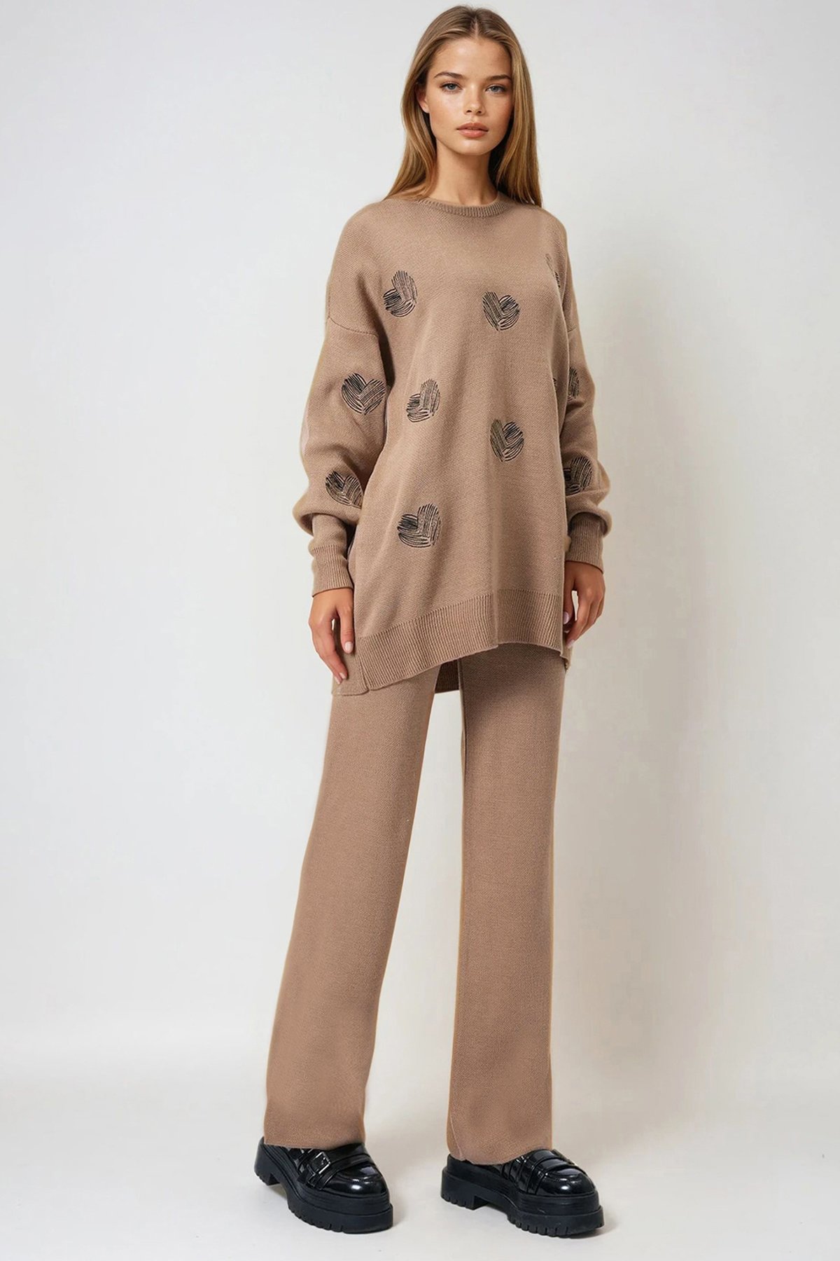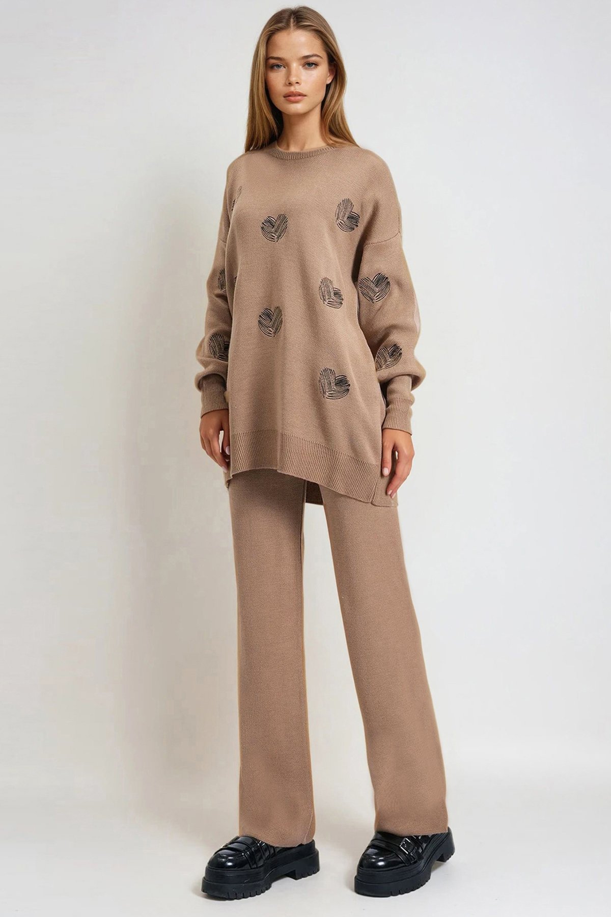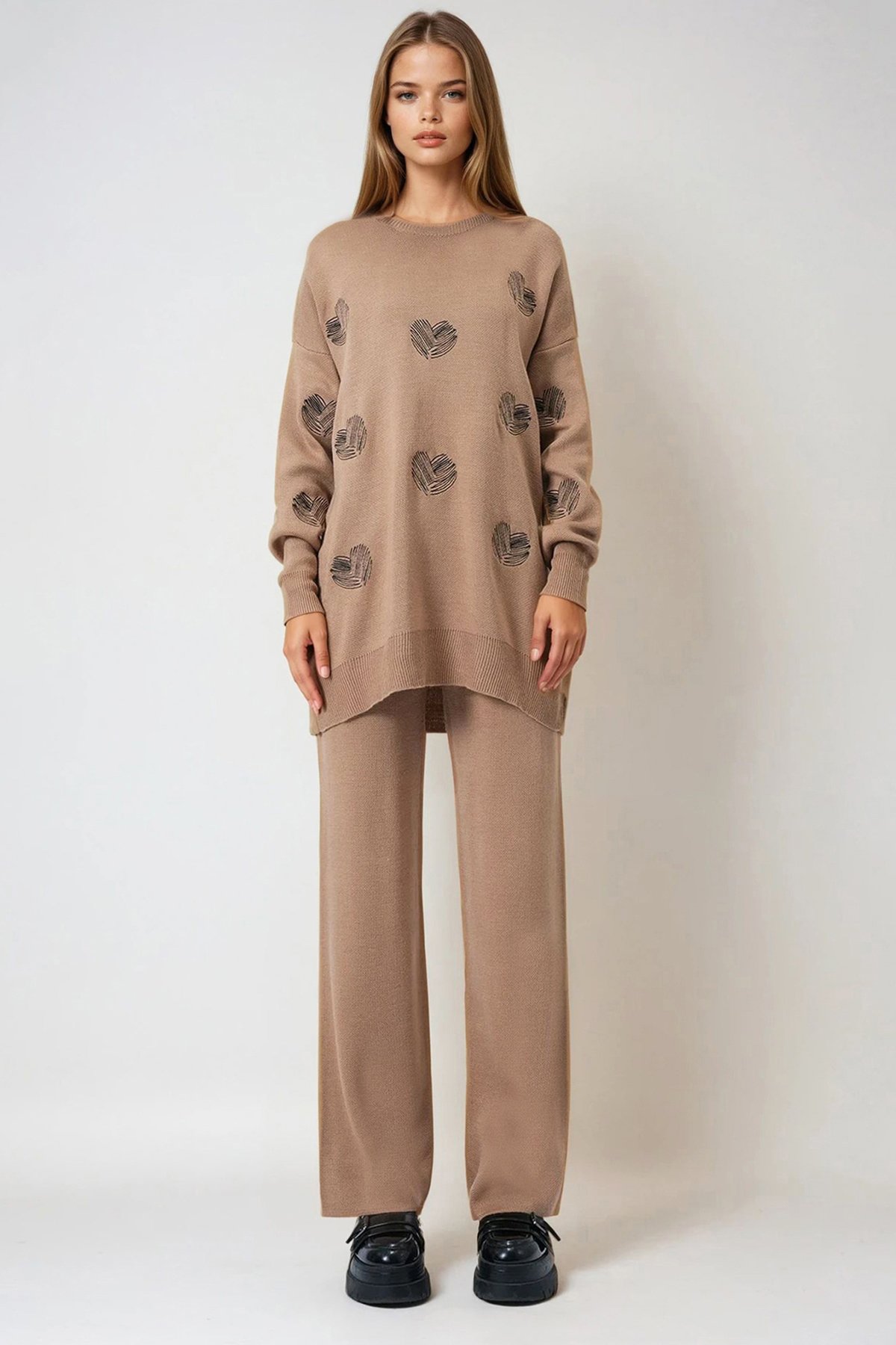 Kadın Bisküvi Kalp Desenli Triko Kazak Ve Düz Paça Pantolon Takım VS00971 (VS00971)