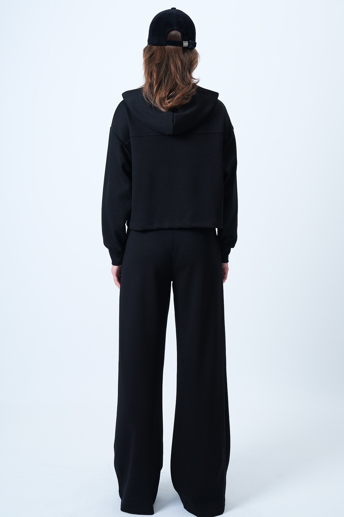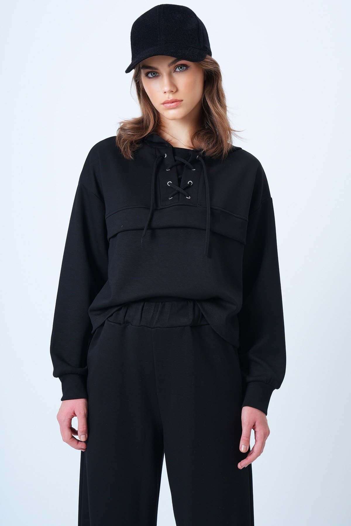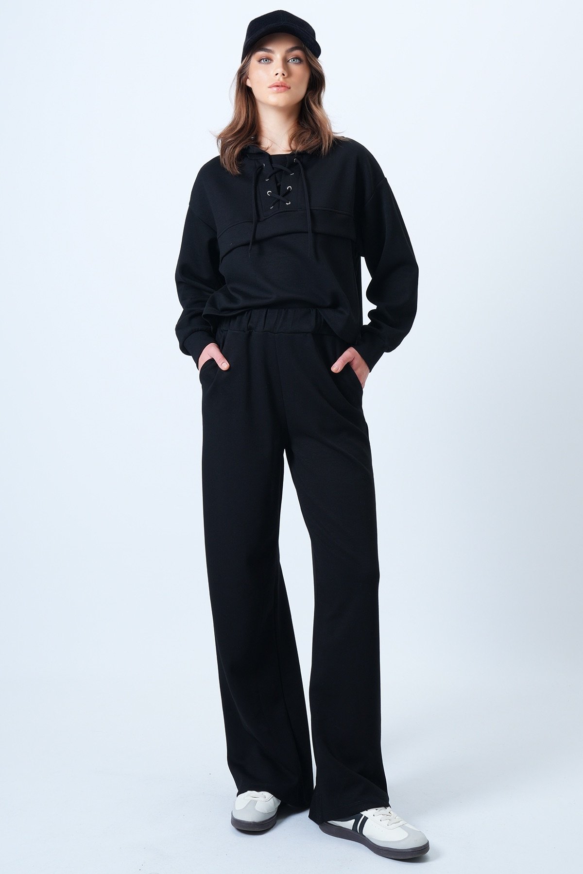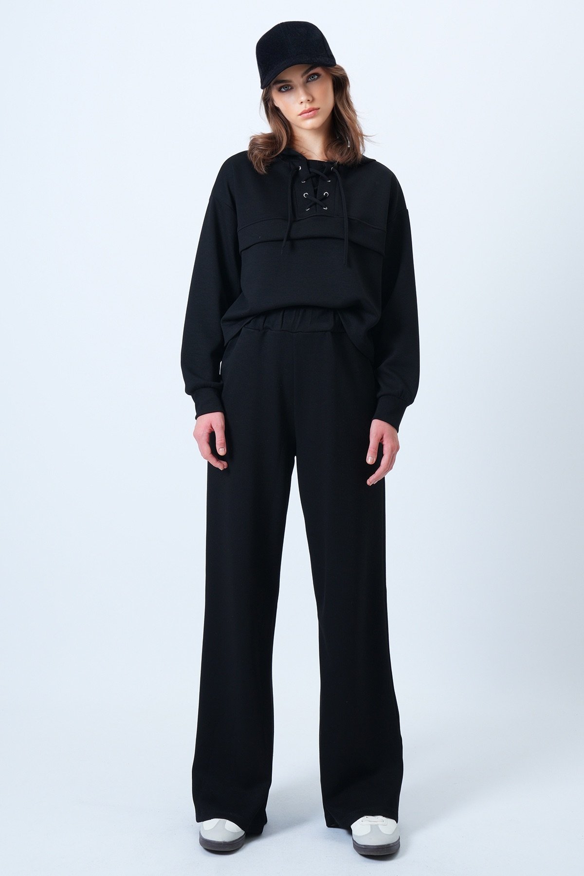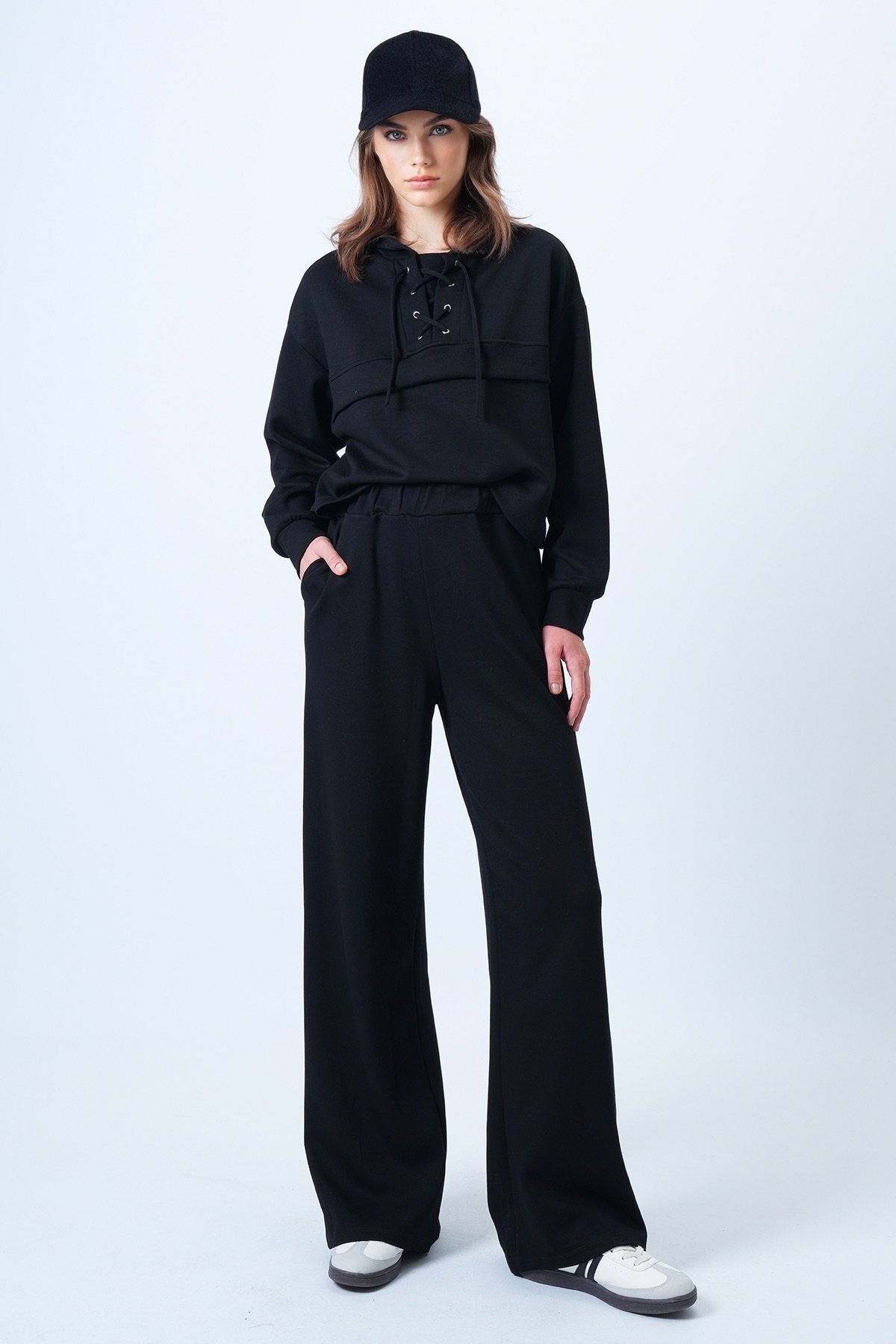 Kapşonlu Kuş Gözlü Sweat ve Palazo Pantolon Modal Takım - SİYAH (VS01174)